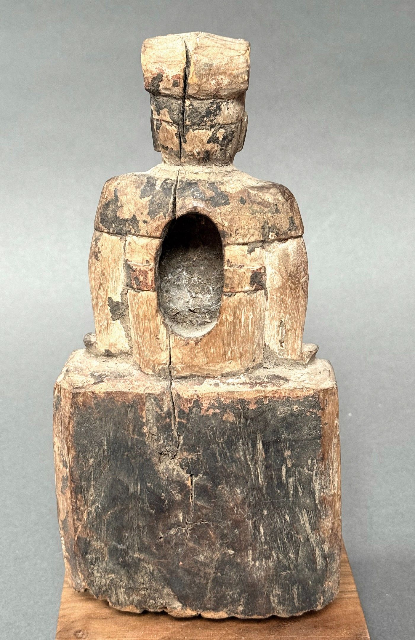 CHINA, 18th-19th century. Seated wise man, forming a reliquary, carved wood, traces of polychrome lacquer. 2 cm high