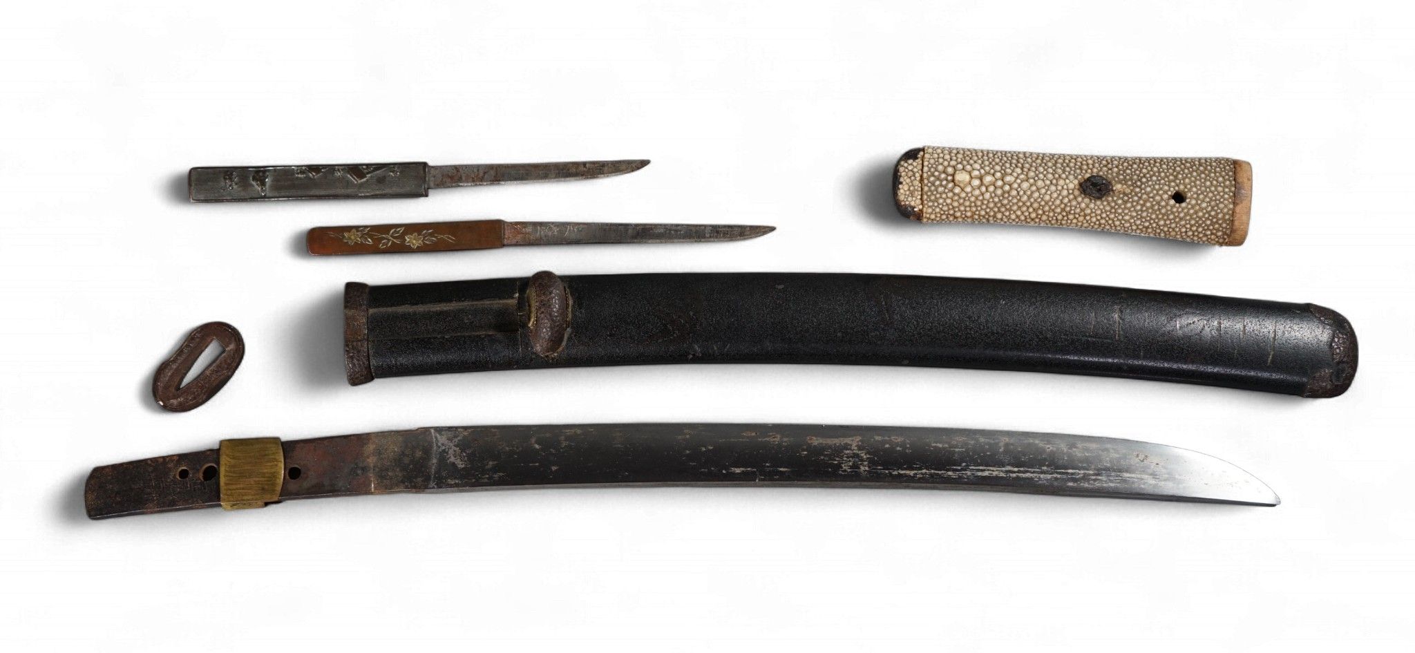 JAPAN - Middle EDO period (1603 - 1868) SHINTO WAKISASHI. Signed (mei): illegiblyBlade (sugata): hira zukuri, iori mune Tempering line (hamon): choji Rocket: three mekugi ana. L. (nagasa): 44.1 cm (Damage to kissaki and temper). Black lacquer scabbard (saya). White same handle (tsuka), iron kashira chased with peonies. Two kozuka chased with samurai and flowers.