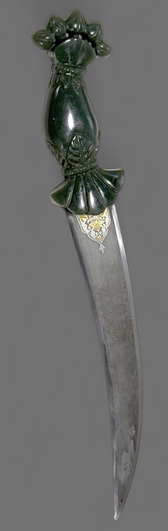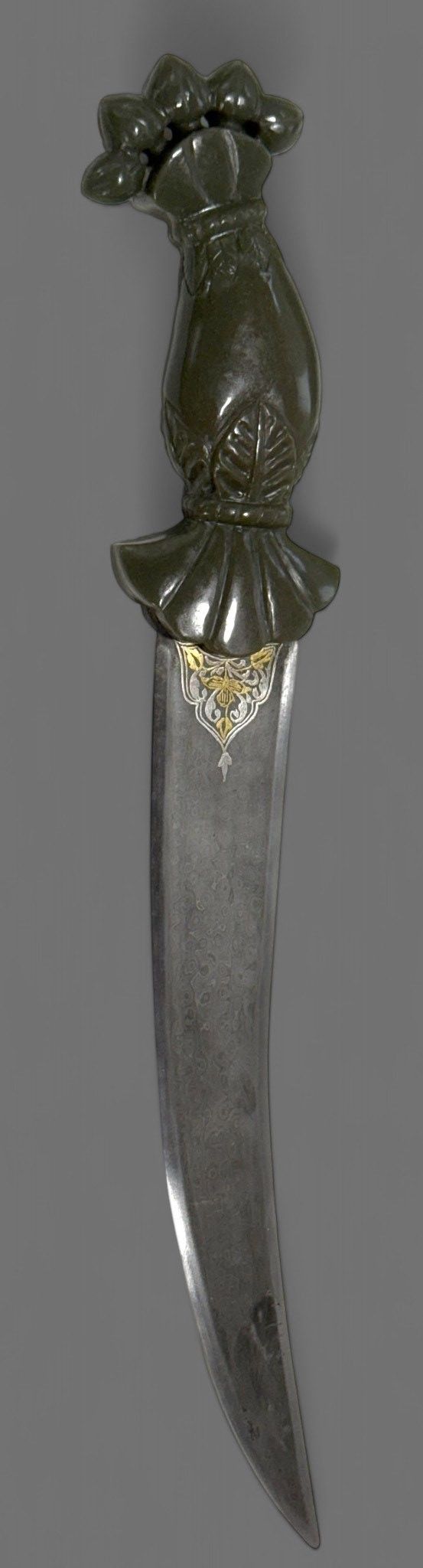 INDIA, Hyderabad region. KHANJAR, the pommel with green jade butt finely chased with a palmette topped with three lotus buds. Beautiful curved blade in tempered damascus steel, the heel in the form of a fan damascened in gold and silver with floral motifs. Length 40 cm