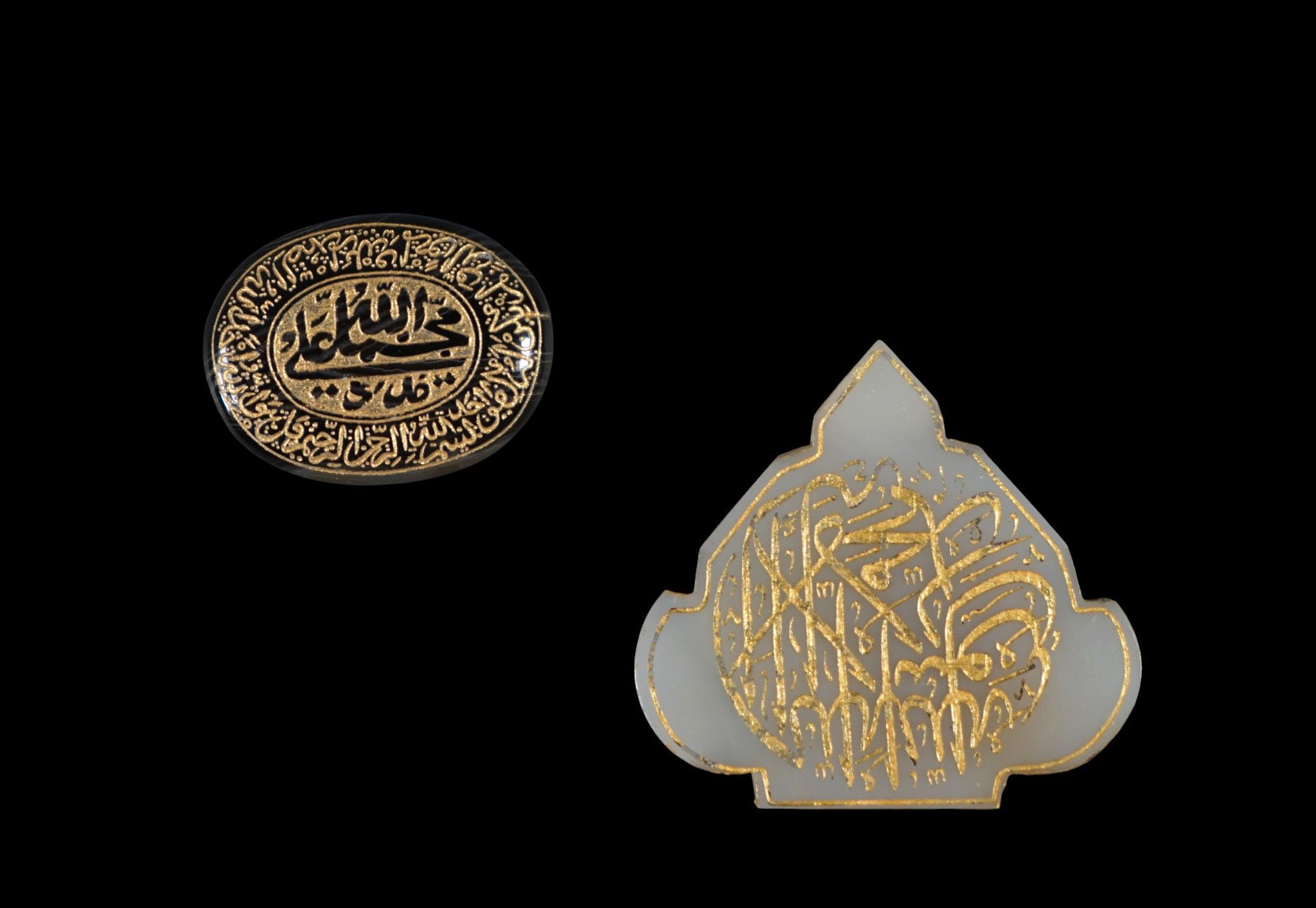 INDO-PERSAN work. Two islamic TALISMANS : Light green jade AMULETTE PENDANT, decorated in intaglio with thuluth calligraphy of a verse from the Qur'an 'There is no god but Allah, and Muhammad is the messenger' (Wear), and engraved and gilded black agate MEDALLON bearing the inscription in thuluth in the centre of the names of 'Allah, Muhammad and Ali' in a surround of suras from the Qur'an. Islamic art. 5 x 5.5 cm and 2.5 x 3.5 cm