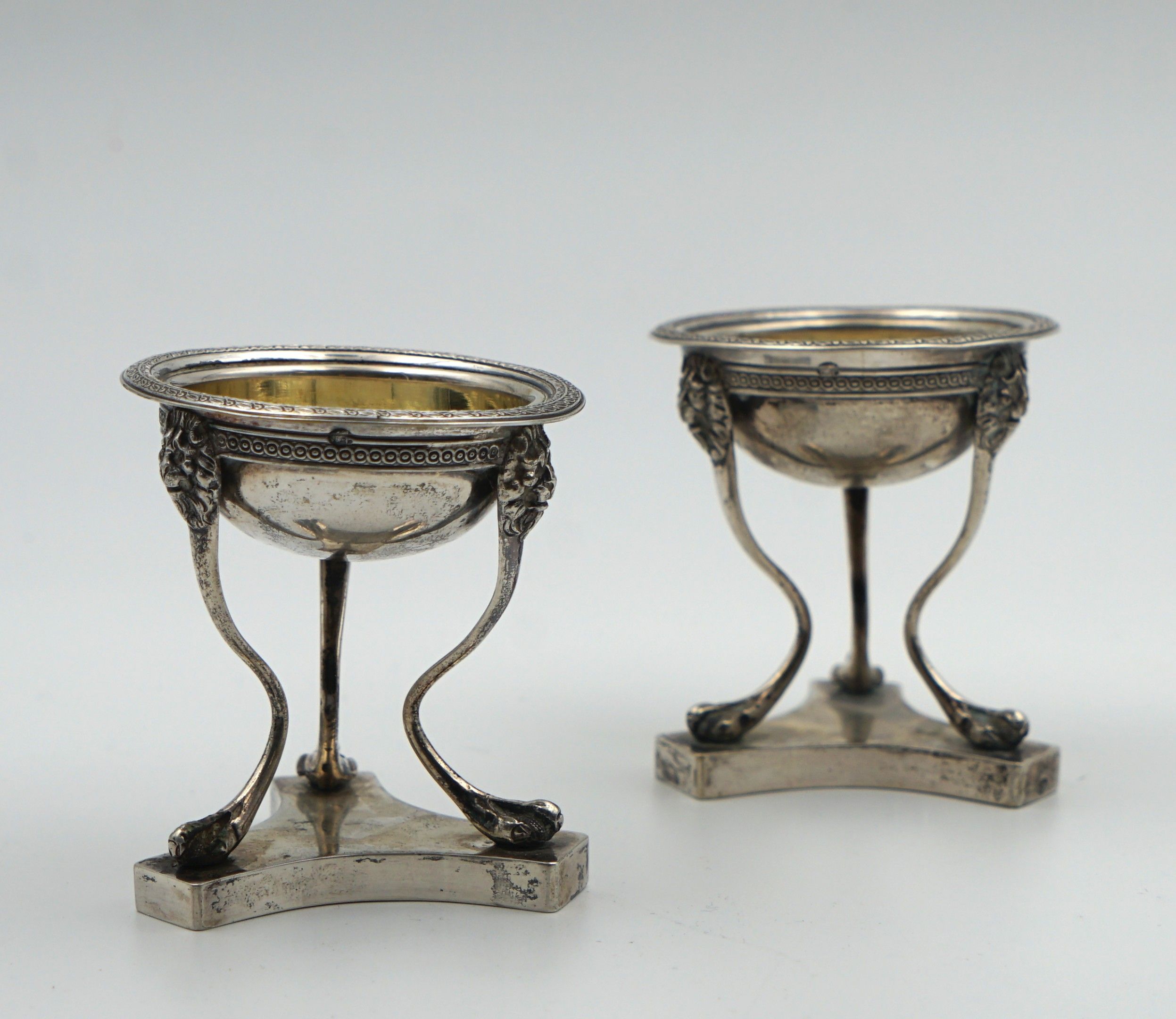 Pair of silver SALIERES bowls decorated with lion's heads and paws, inside in vermeil, on a triangular base, rim decorated with laurel leaves. Italian hallmarks of FLORENCE 1832-1872. Height 8 cm. Weight 258 g