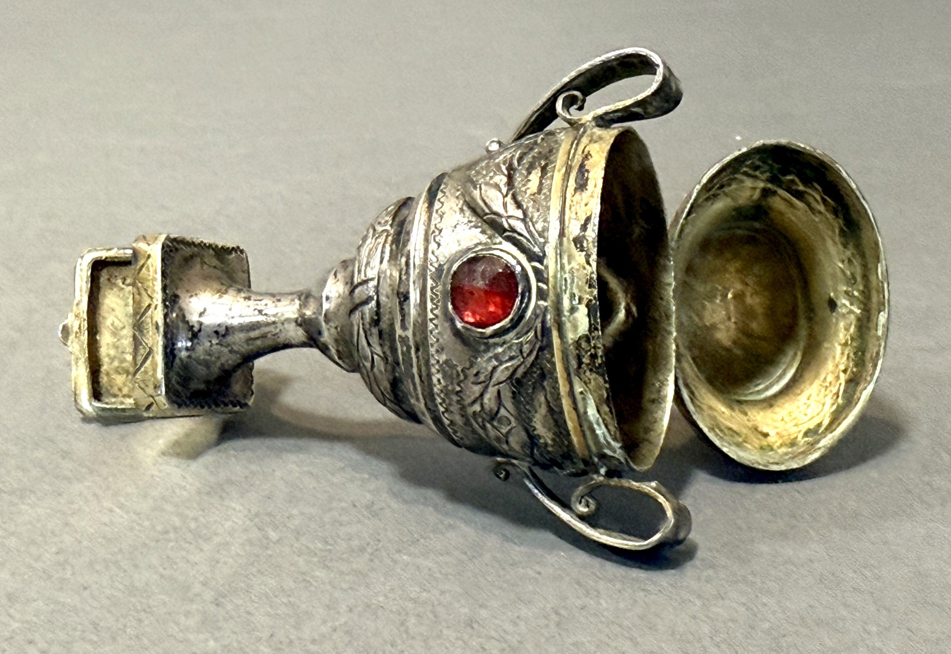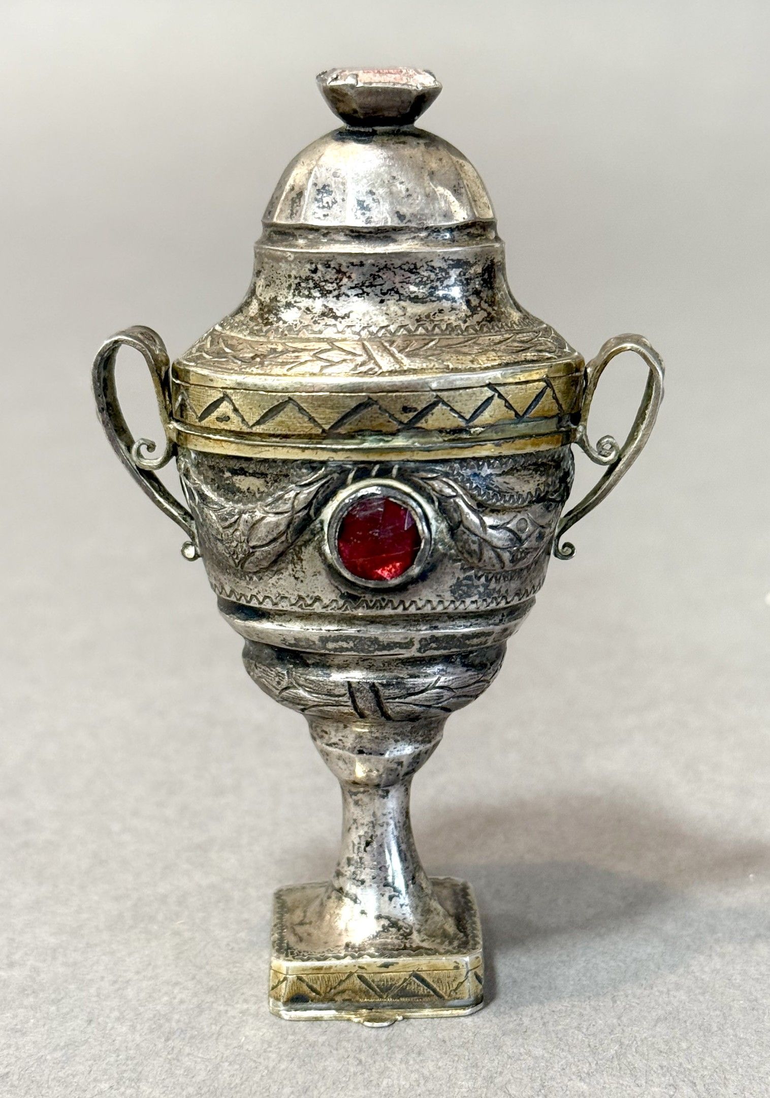 DENMARK, early 19th century. Rare HOVEDVANSAEG silver spice box in the form of an urn with repoussé decoration of garlands and laurel wreaths, the lid and body set with coloured glass stones, the foot revealing a compartment closed by a flat hinged lid, engraved FJLFD-KSD 1813. Weight: 44 cm H. 9.5 cm This box is a traditional engagement gift, with the foot compartment traditionally used to hold a coin for the church collection.