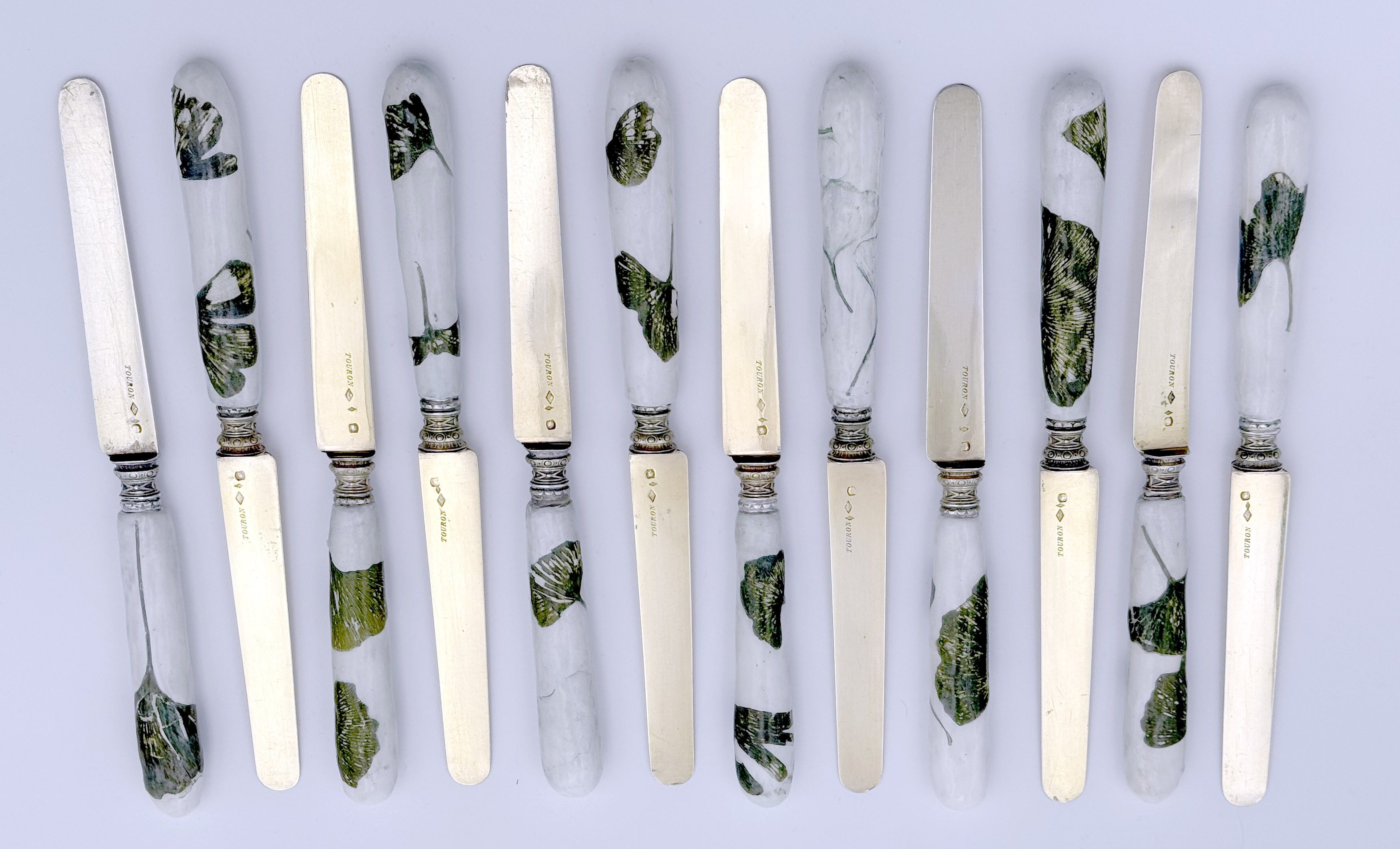 A ONE PIECE KNIFE Suite of twelve FRUIT KNIFE blades in gilt, handles in white resin inlaid with ginkgo biloba leaves.