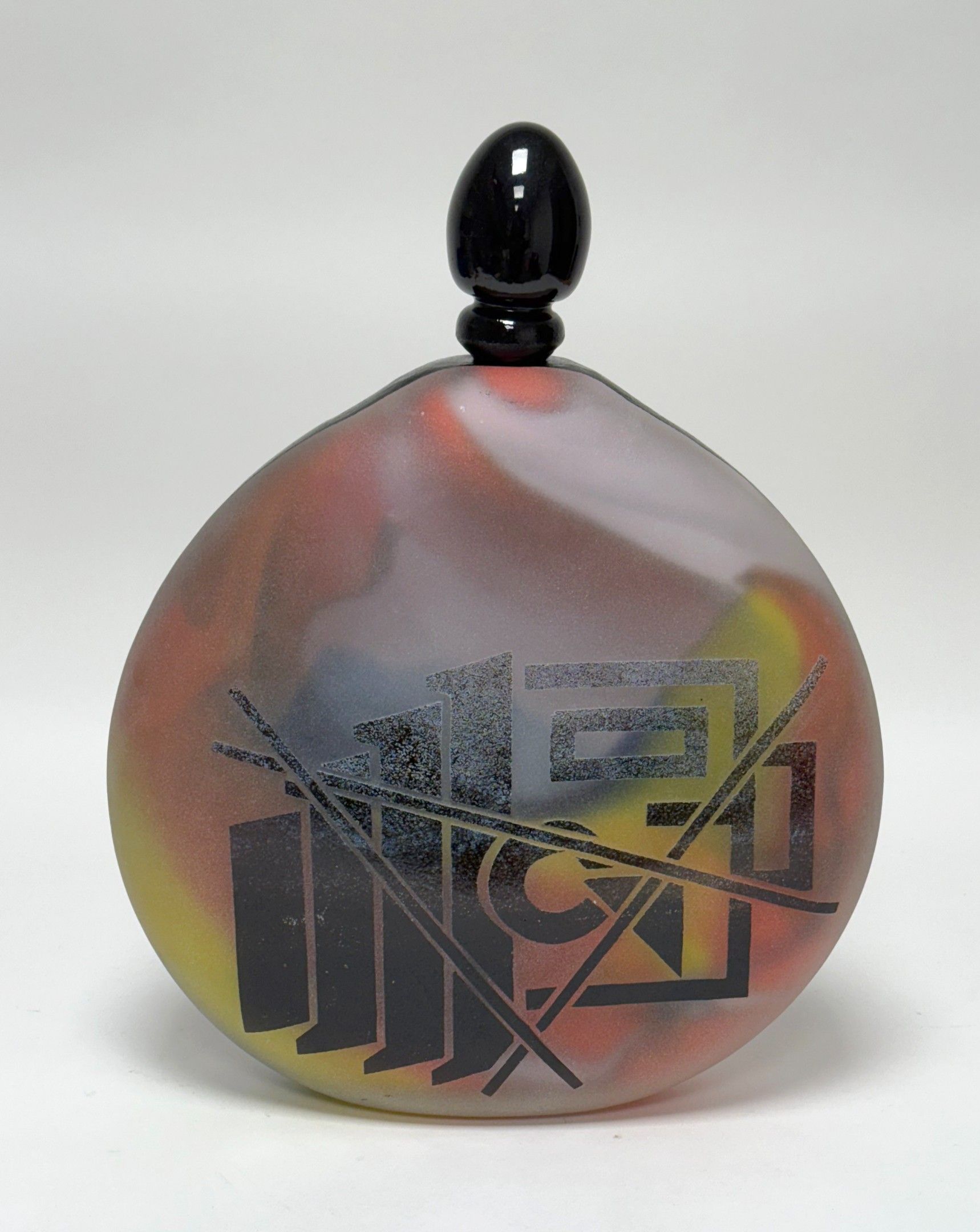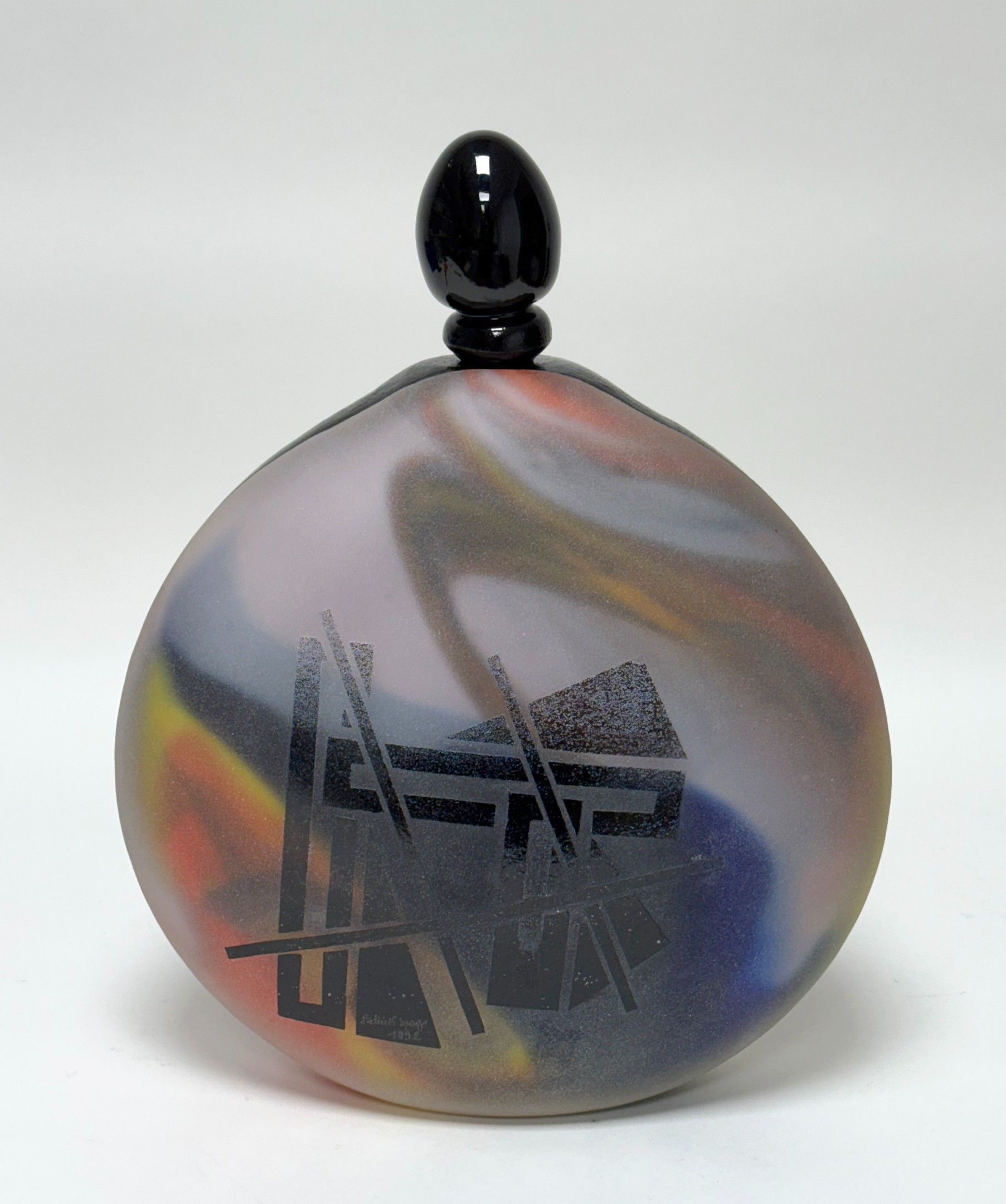 Patrick LEPAGE (1949-2015) GOURDE in frosted and acid-etched multicoloured glass with geometric motifs. Black glass stopper. Signed and dated 1992. 32 x 34 x 10 cm