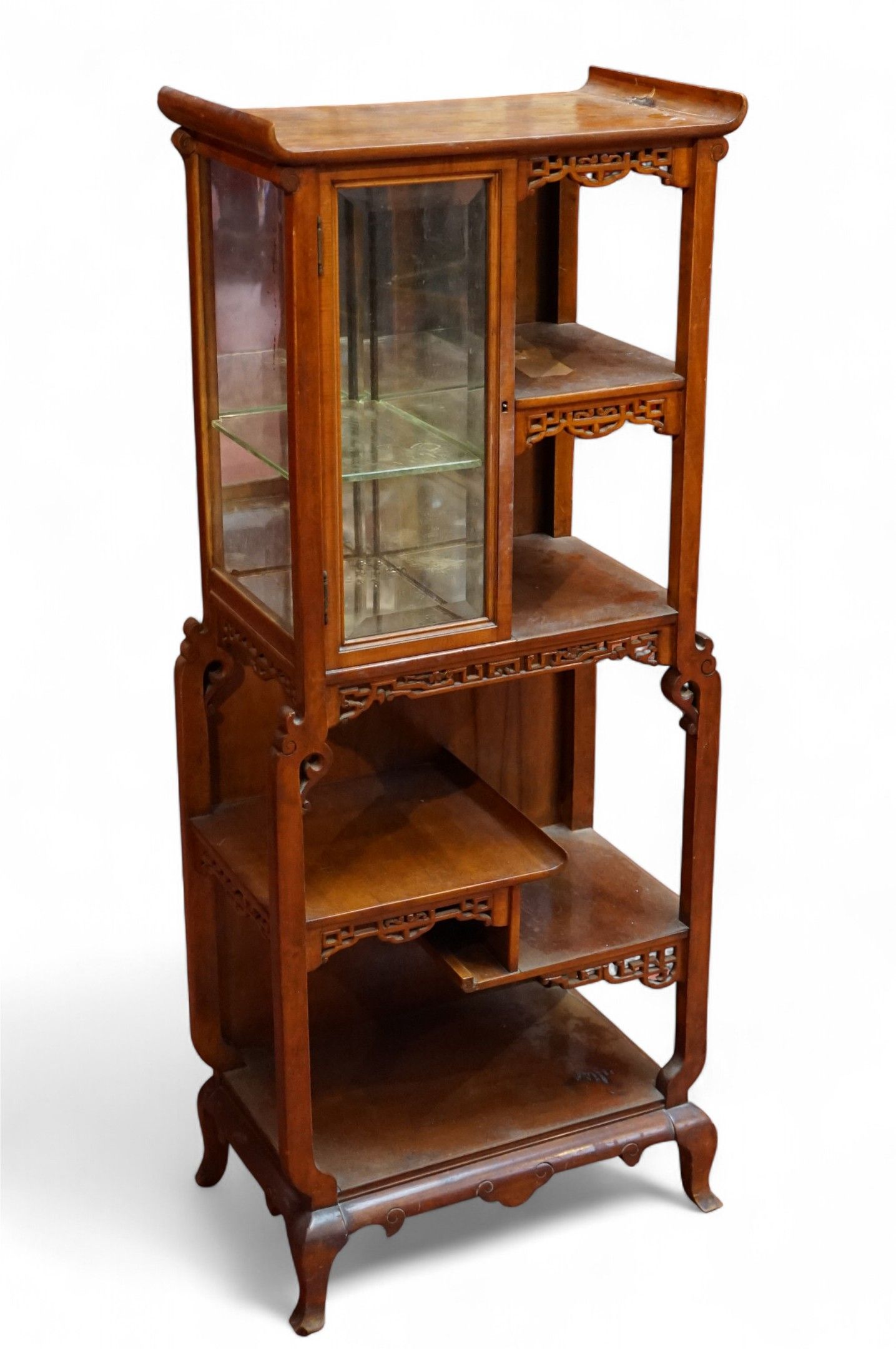 Gabriel VIARDOT (1830-1904) (In the taste of). Wooden and veneered WINDOW-SHELF with japanese decoration, the pedestals encircled with greeks. 127 x 50 x 32 cm (Worn, rubbed, slight cracks in the veneer).