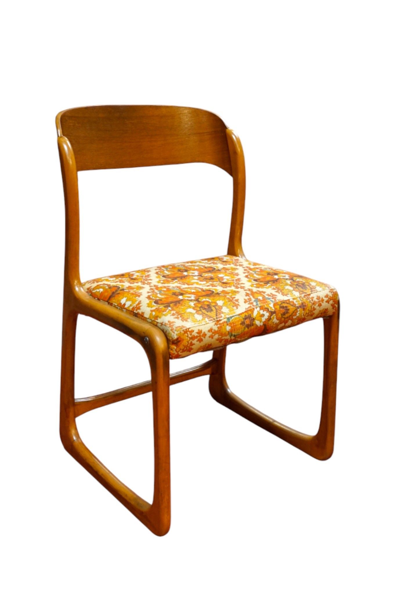 A rosewood chair with a gondola back and front and back legs joined by a brace. Circa 1960. Height 80 cm.