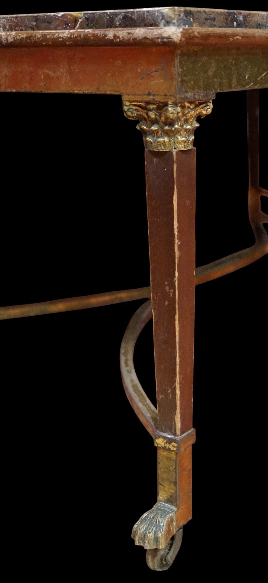 Maison CHARLES (in the taste of) Low table with ormolu and wooden sheath legs terminating in lion's claws on castors and a beautiful top composed of sections of fossilised stone revealing numerous ammonites and orthoceras.