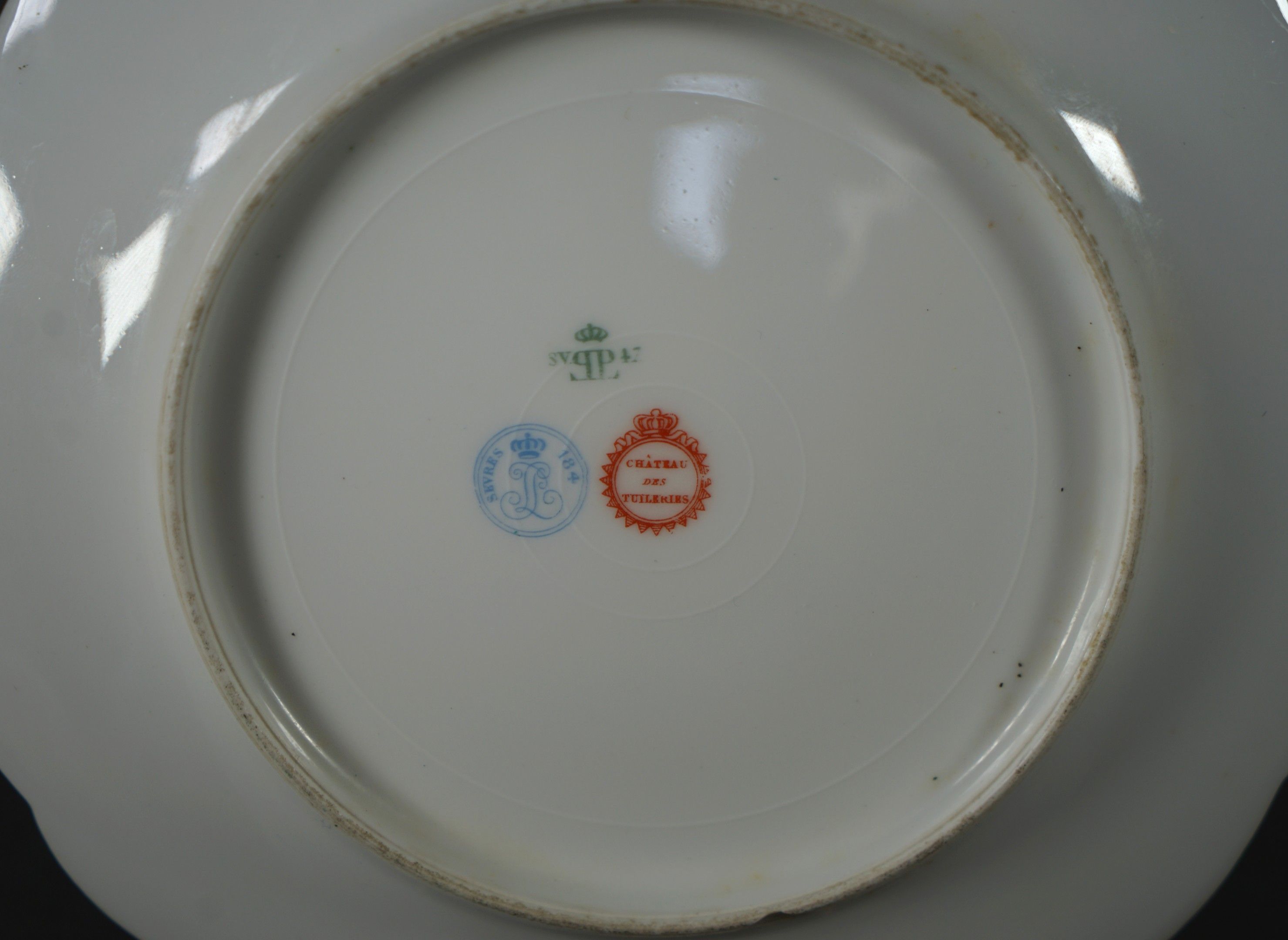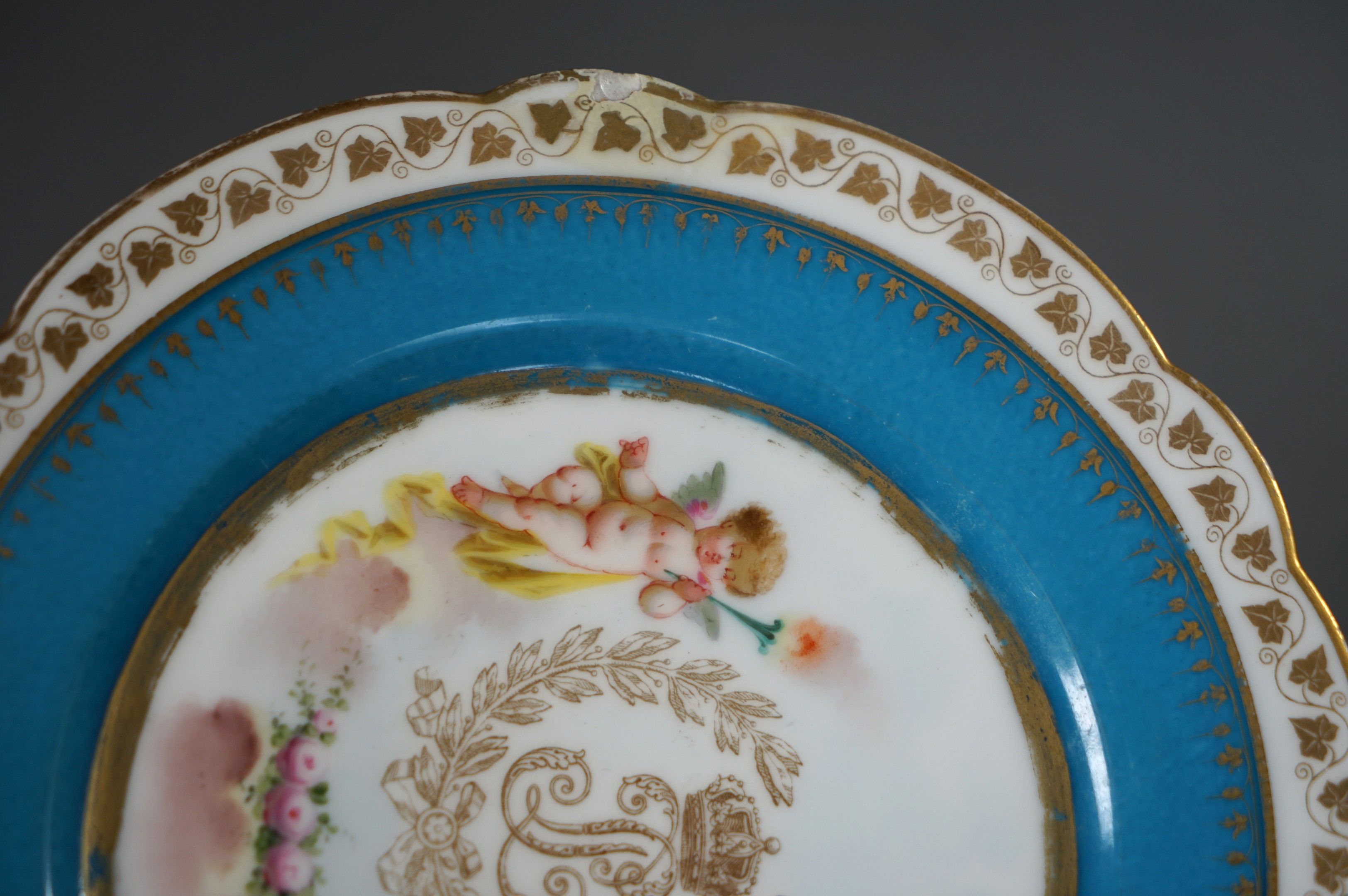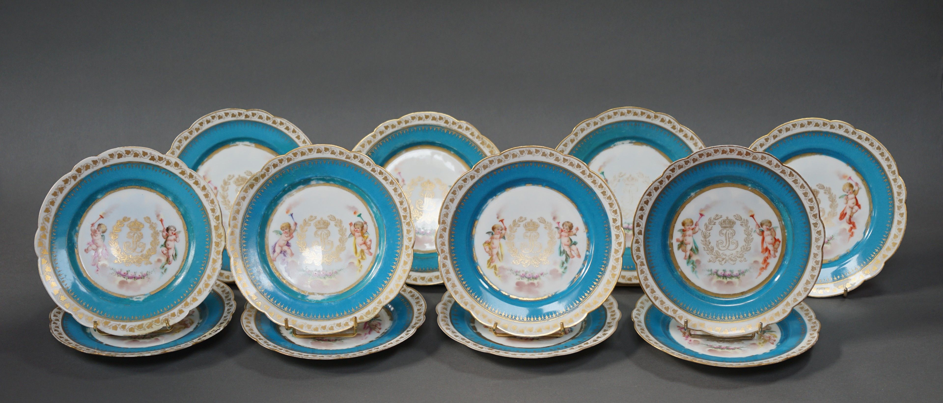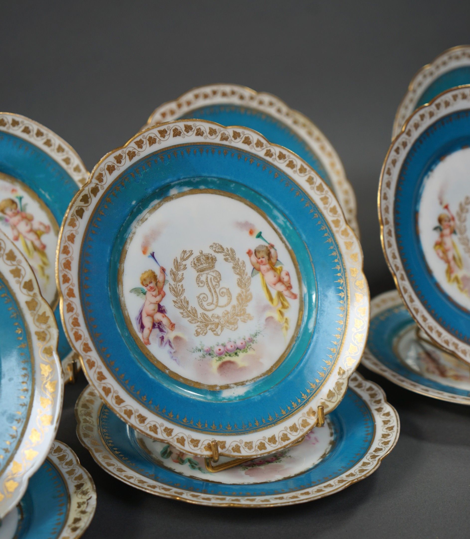 In the taste of the Royal Manufacture of Sèvres. Set of TWELVE porcelain dessert plates, the wing with blue background, polychrome decoration of putti, arms of Louis Philippe and marli with gold ivy leaves decoration. Cachets Sèvres Château des Tuileries. U Porte des Cachets Sèvres Château des Tuileries. Wear, chips and restorations.