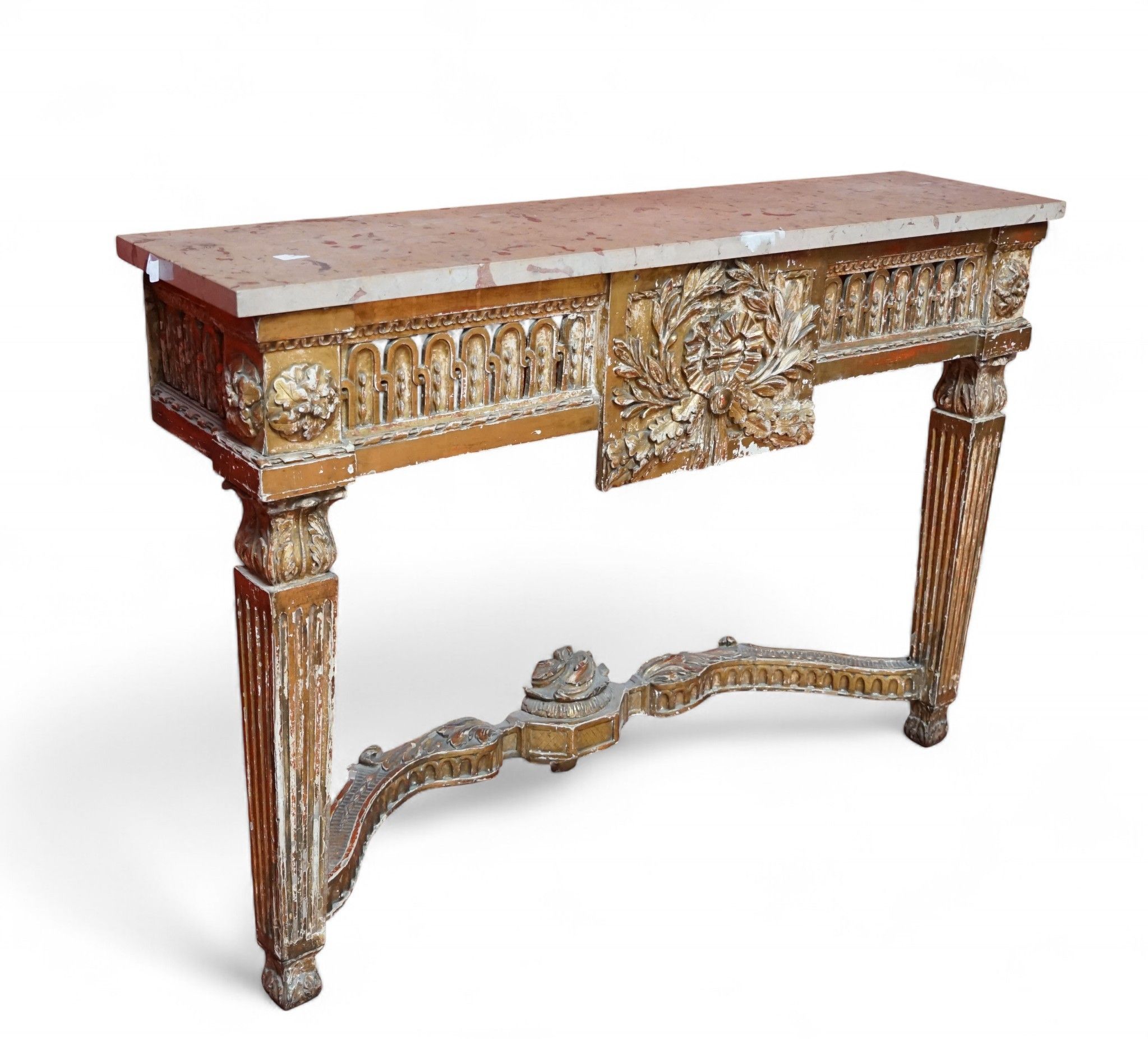 Gilded wood CONSOLE, the straight fluted base, the openwork belt with filleted canals, centred on an apron carved in bas-relief with a knot and laurel leaves (probably added), the brace carved with acanthus leaves, (probably truncated). Louis XVI style. Modern white marble top. 85 x 119 x 28 cm (Worn, slightly missing and cracked).