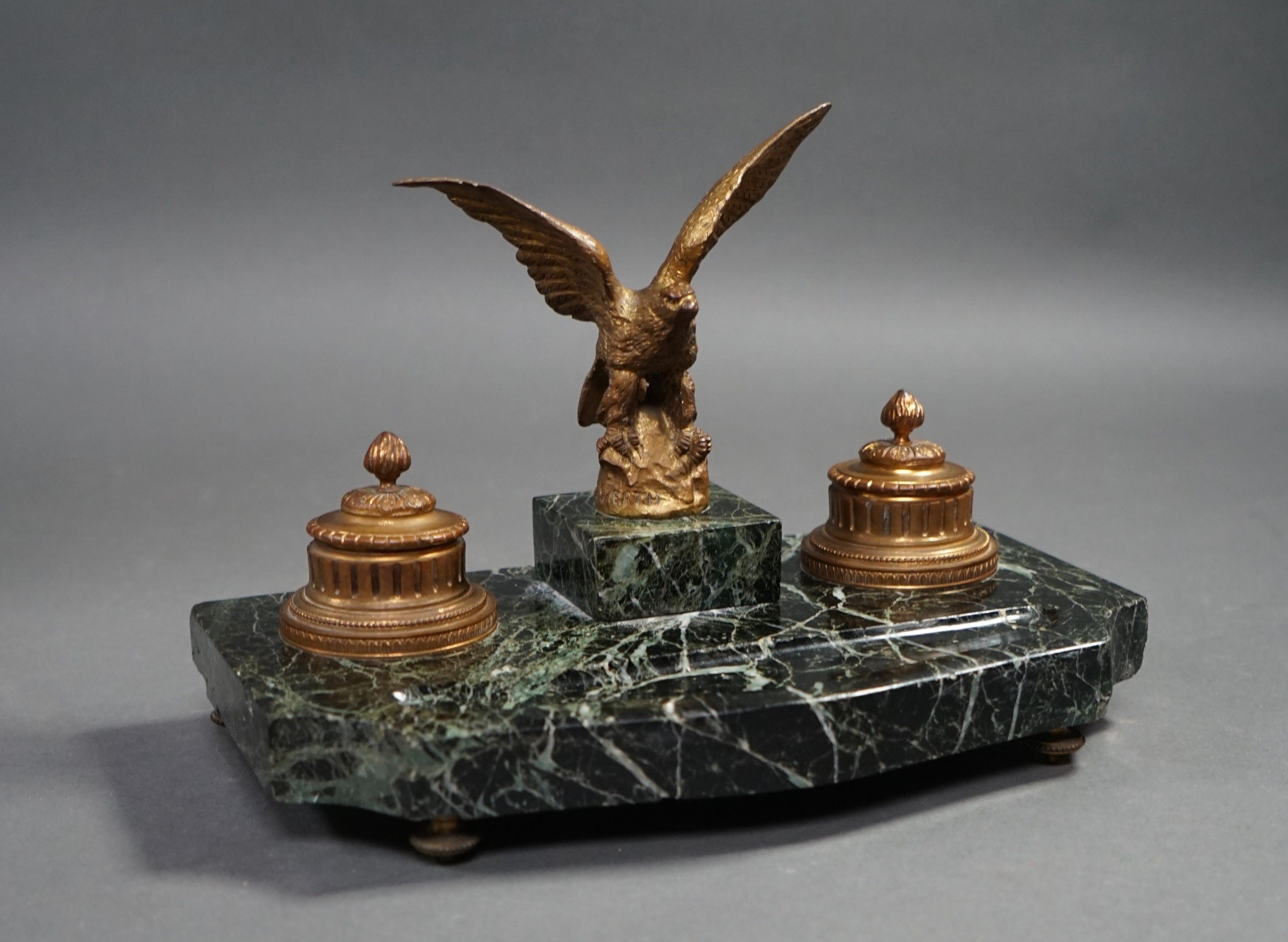 Georges GOMERTH (19th-20th). An ormolu and sea-green marble inkstand centred on an eagle with outstretched wings, the inkwells adorned with fluting. Late 19th - early 20th century. 21 x 30 x 18 cm.