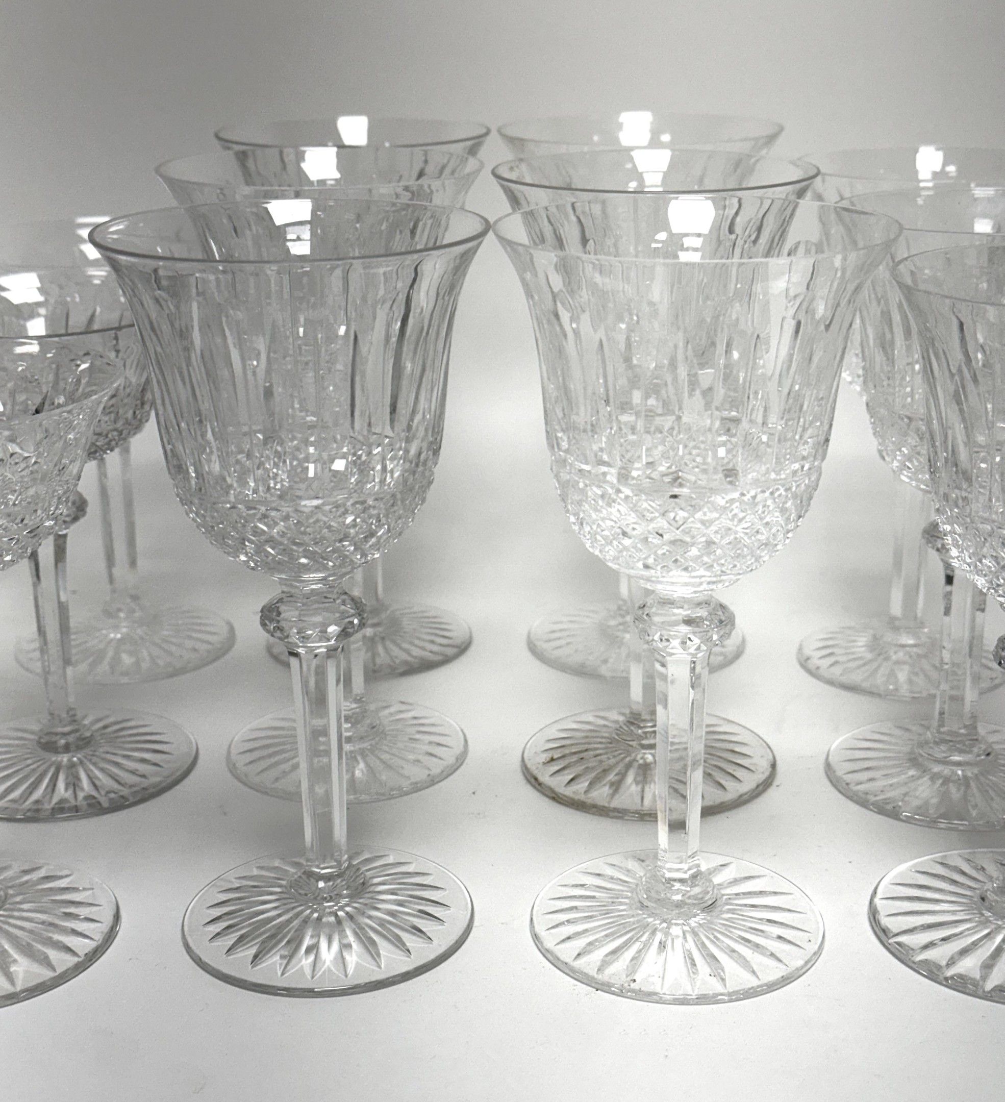 SAINT-LOUIS. GLASS SET Tommy model, including six water glasses, six red wine glasses, three white wine glasses, six liqueur glasses, six champagne glasses, and five aperitif glasses. Four unmarked crystal glasses of another model are included.