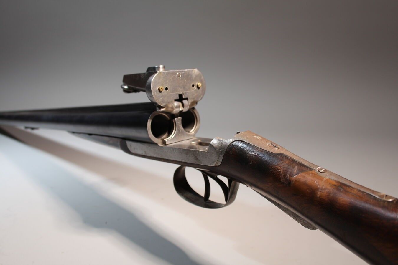 Liège calibre 12-65 shotgun, 715 mm side-by-side barrels, interesting upward-tilting breech lock and inverted central key, double trigger and grip safety, 355 mm English grip stock plus shock absorber, wear, oxidation, TL 1120 mm, No. 32, AS312-C25-32, category C 1° c).