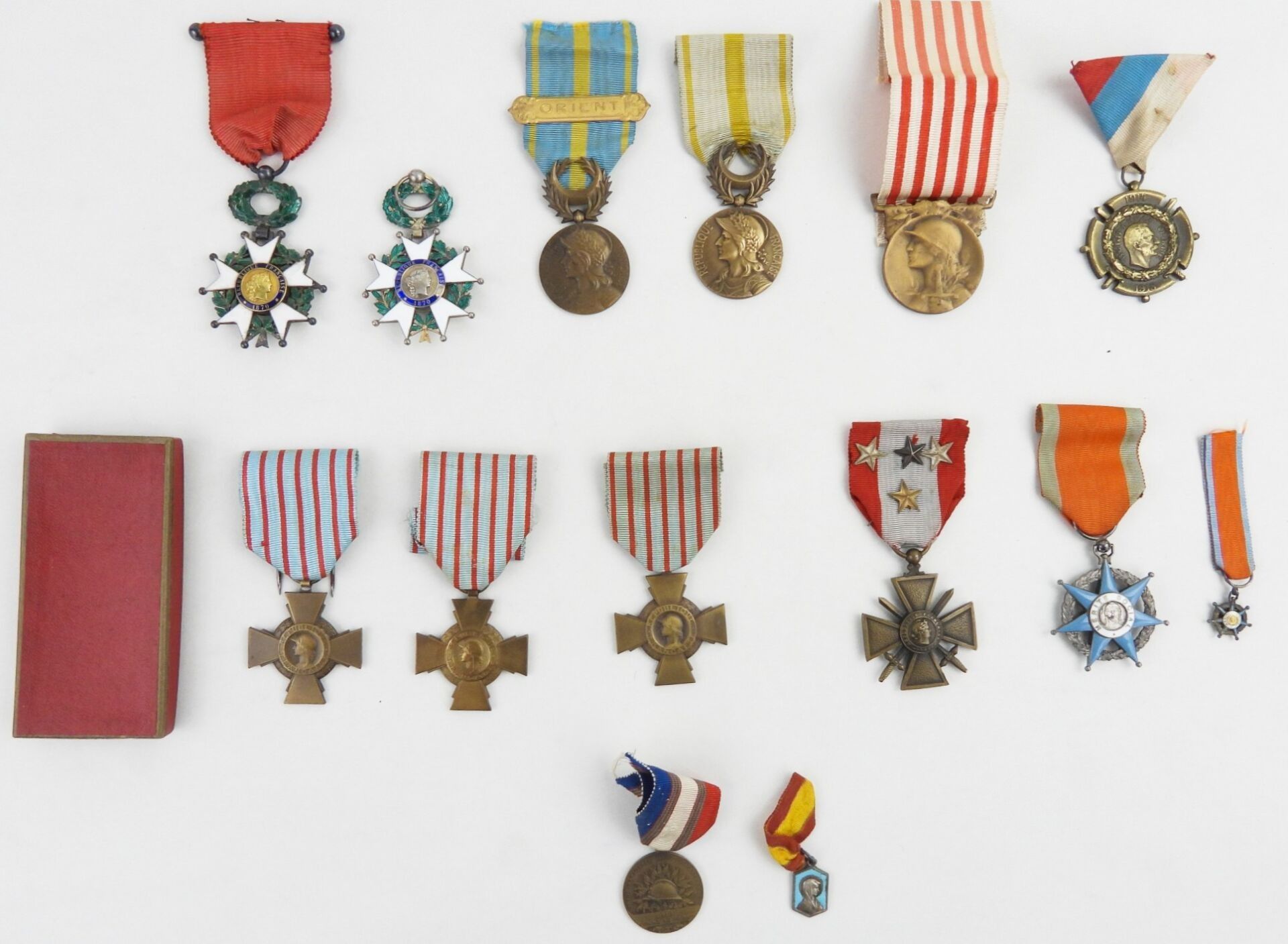 Set of French medals belonging to Henri Guillard: Légion d'honneur, Croix du combattant, Croix des opérations extérieures, Médaille commémorative d'Orient, Médaille du mérite social, Médaille militaire de la grande guerre, Médaille commémorative serbe 14-18. 14 items. ABE