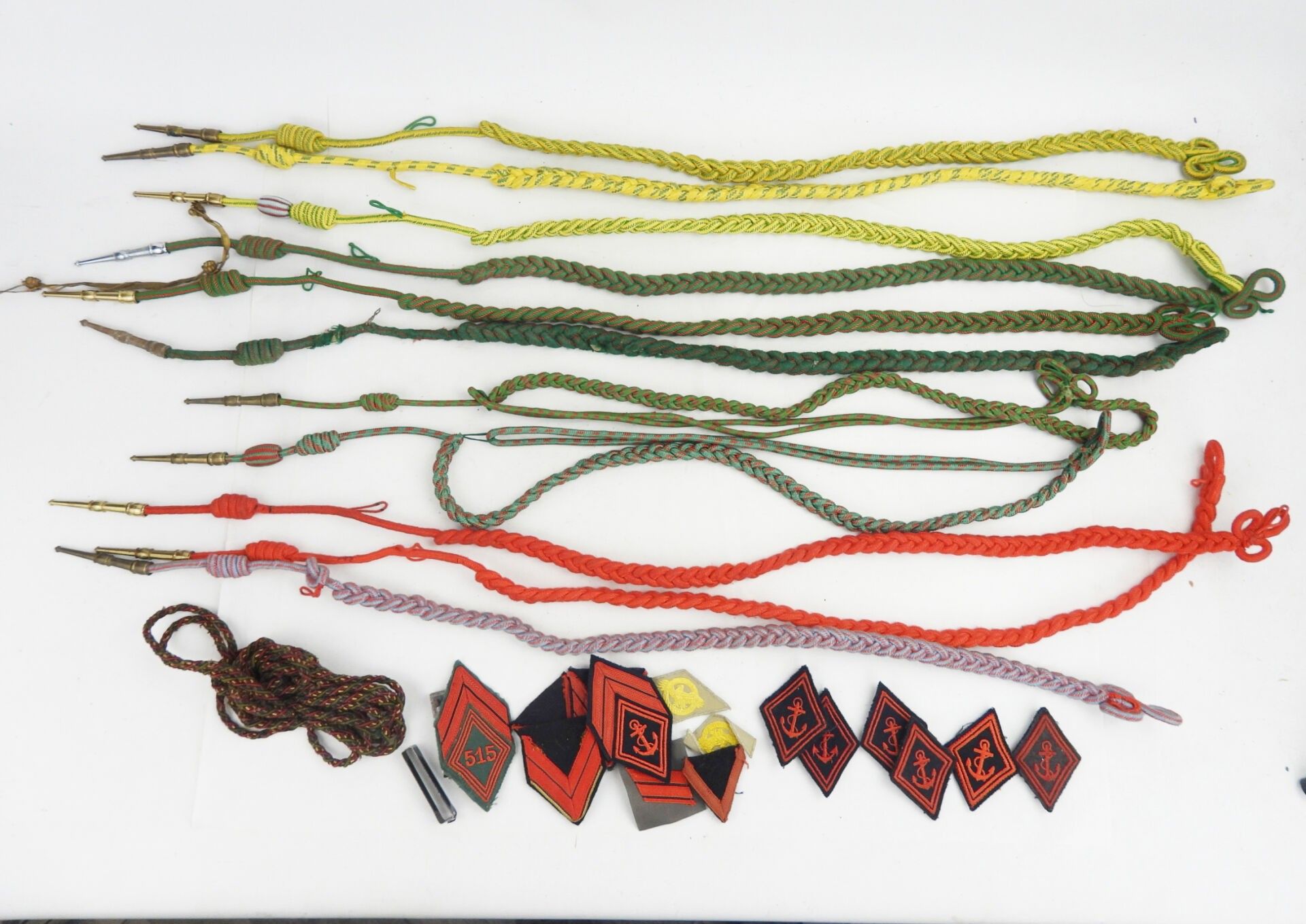 Lot comprising fourragères including Croix de Guerre, military medal and fabric badges. BE