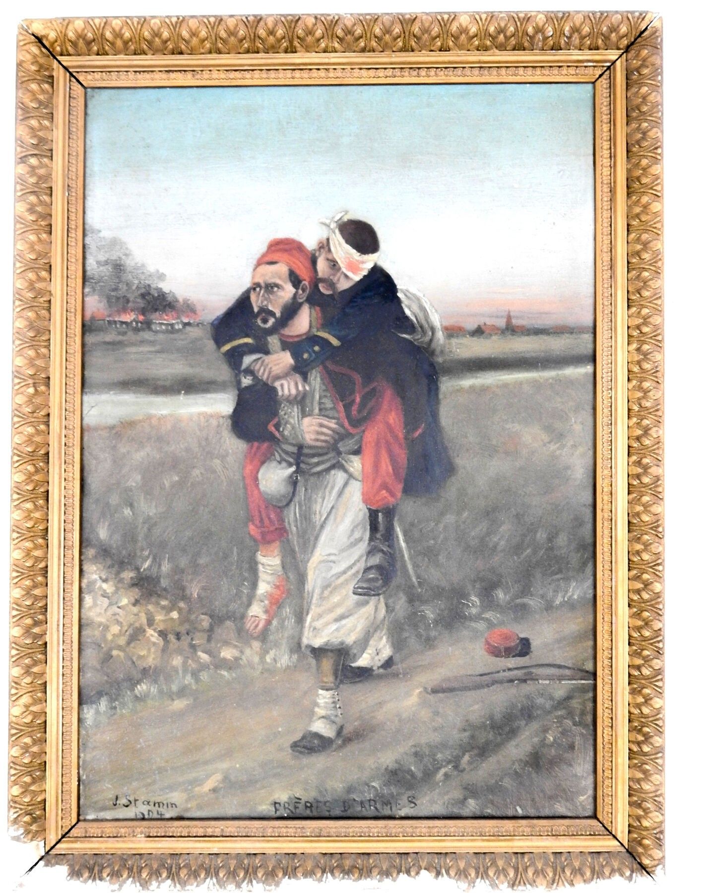 J. STAMIN, "Frères d'armes", oil on canvas signed lower left, dated 1904, giltwood frame (accidents). 57 X 42 cm.