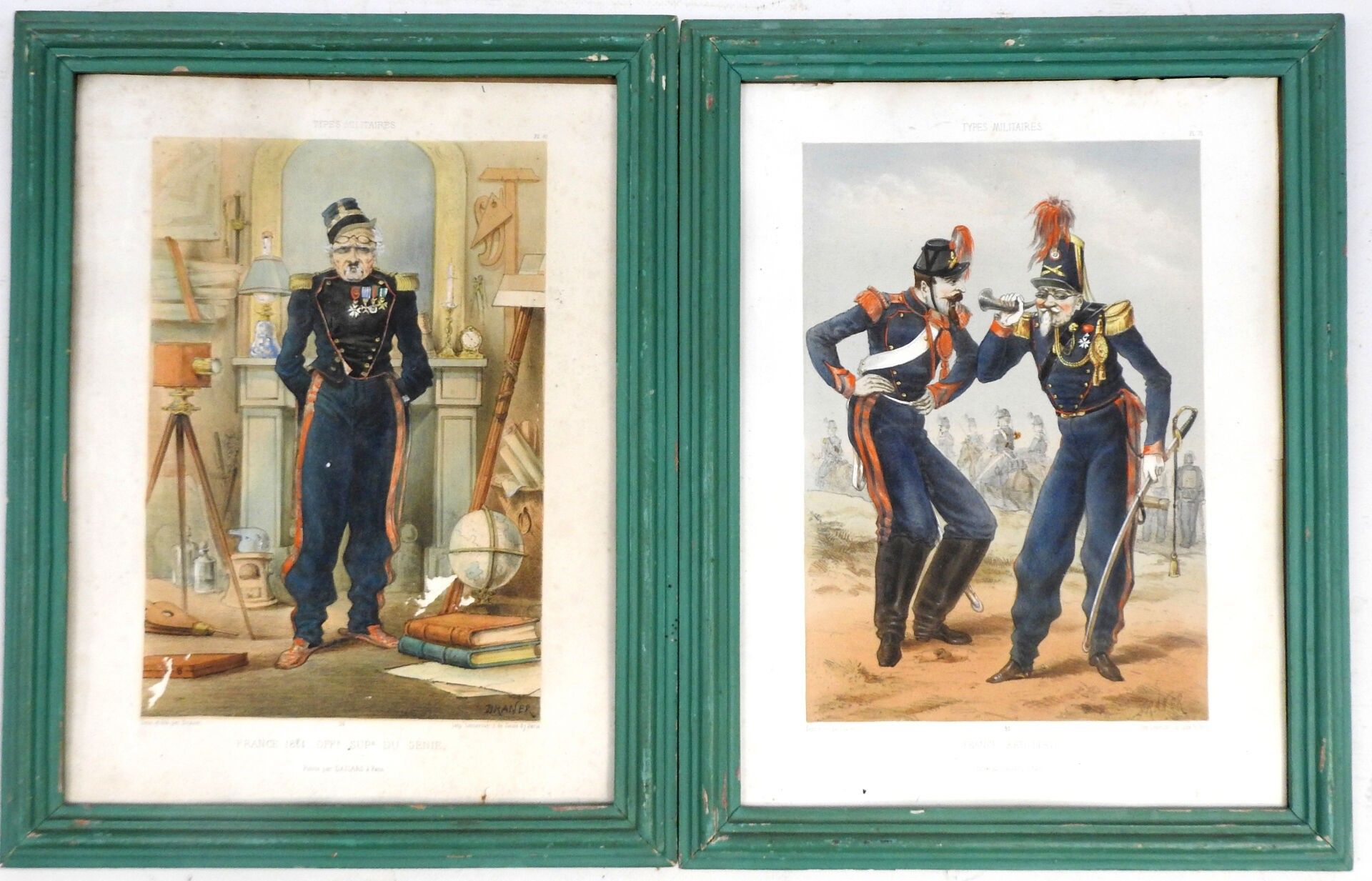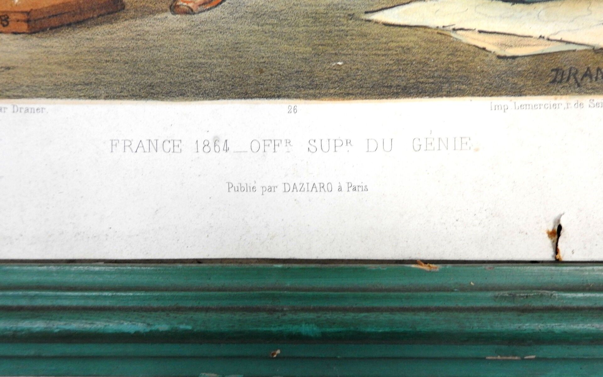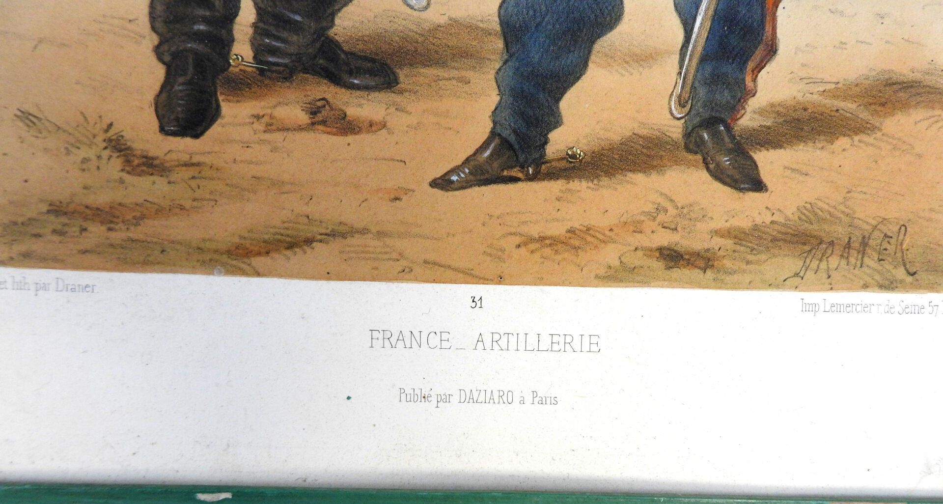 Jules RENARD dit DRANER (1834-1926) "Types militaires", 2 lithographs enhanced with watercolour, engineer officer, artillery soldiers around 1850, framed under glass.