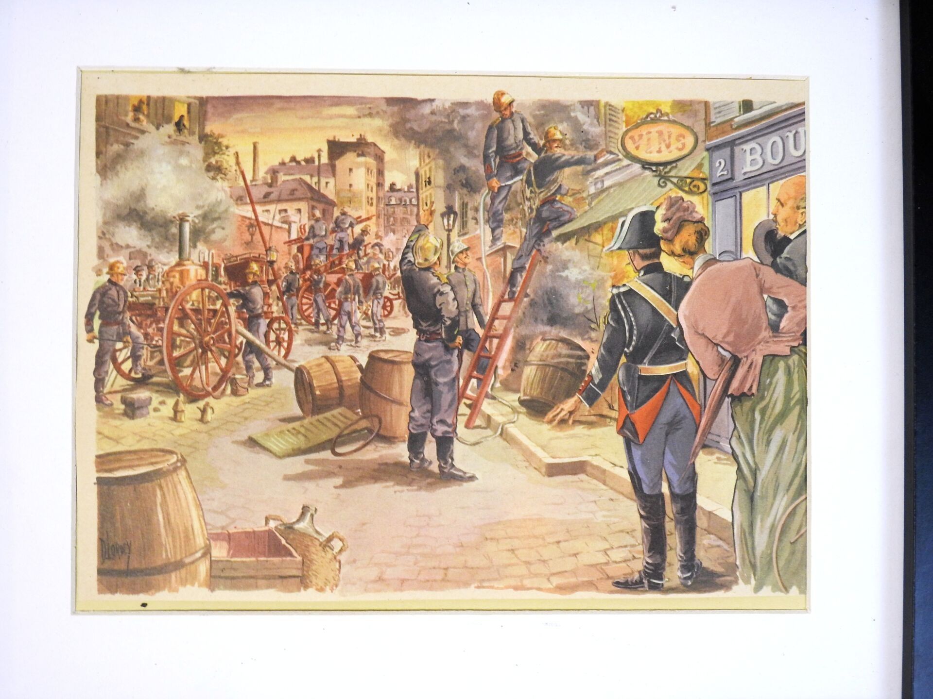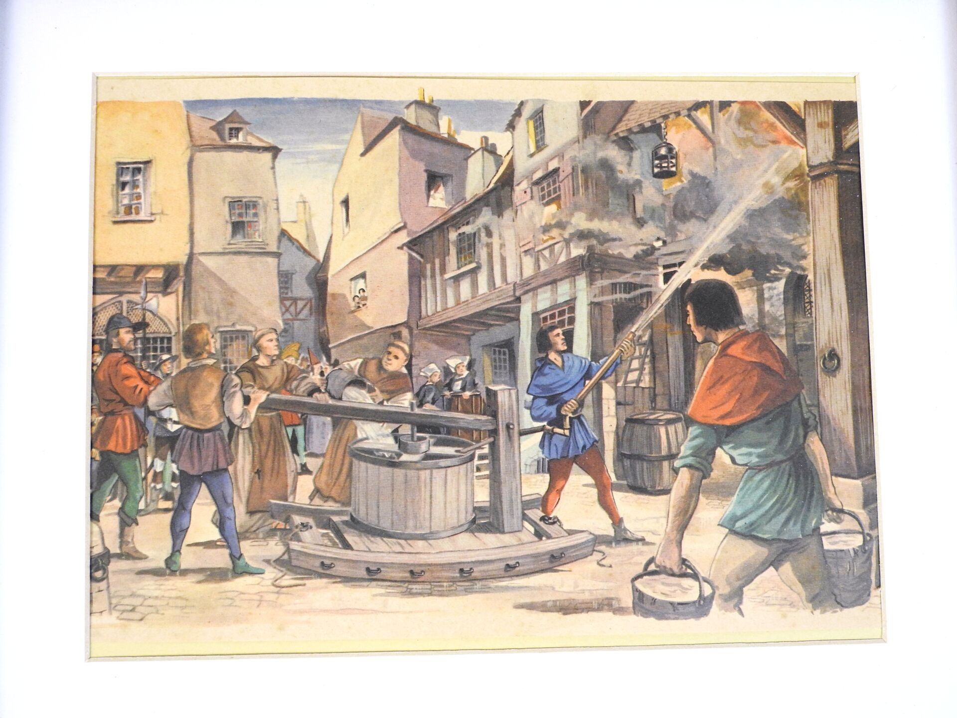 ENGRAVINGS. Set of 5 engravings evoking the action of the firemen through the centuries, modern framing, under glass for 3 of them, 17 X 23 cm. BE