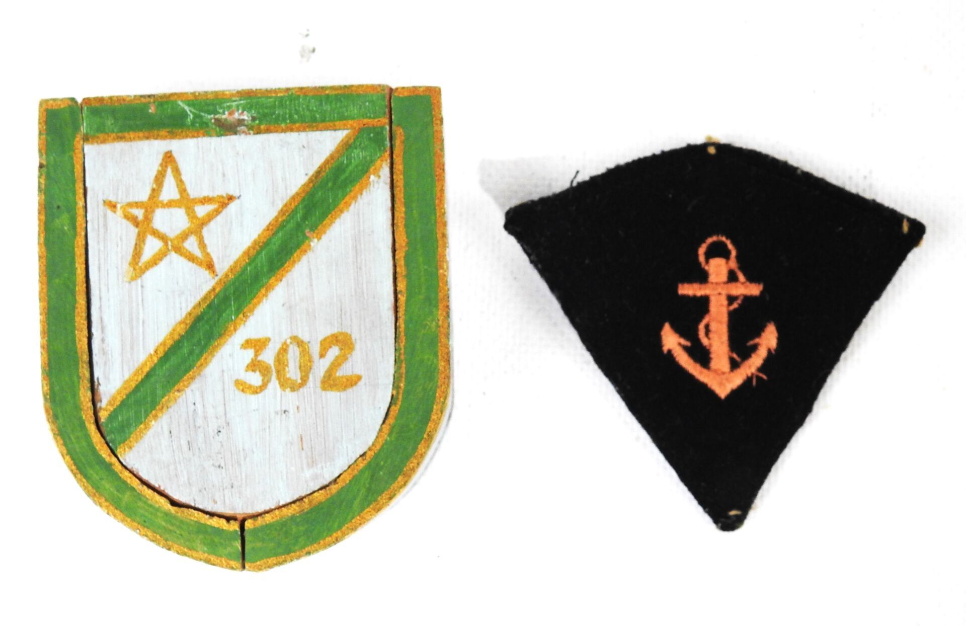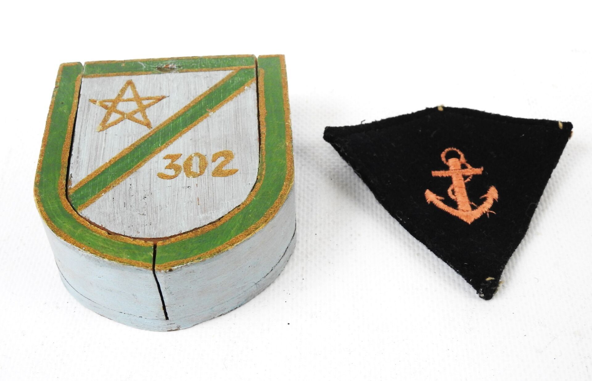 Wooden box with 302 CTM badge and colonial infantry collar tab. ABE