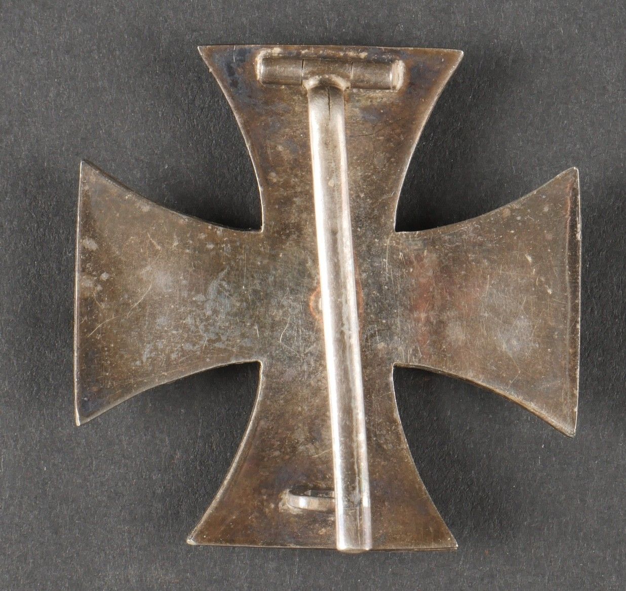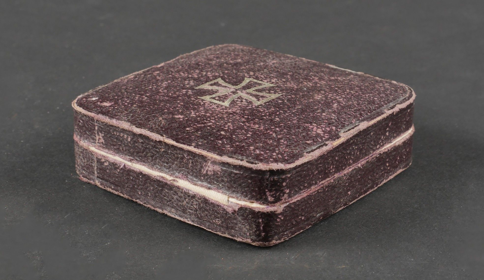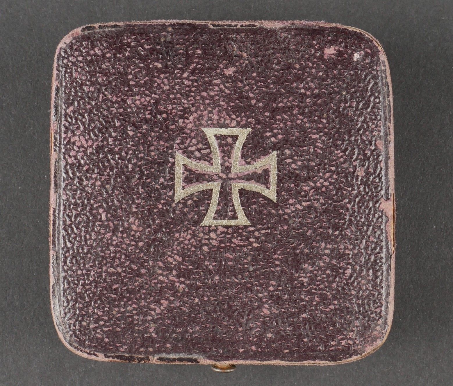 World War I Iron Cross, First Class. Domed model. Manufactured in three parts. 70% black. Complete fastening on back. No visible markings. Box heavily worn, reproduction of an iron cross in the middle of the lid. Functional clasp. Interior lined in white satinette and purple velvet. Some wear and patina. Condition II+. Iron Cross 1st Class from the First World War. Convex model of three-part construction. Black finish at 70%. Complete pin on the reverse. No visible markings. Heavily worn box with an embossed reproduction of an Iron Cross on the lid. Functional clasp. Interior lined with white satin and purple velvet. Some wear and patina visible on the piece. Condition II+. Lemarchand Normandie Collection.