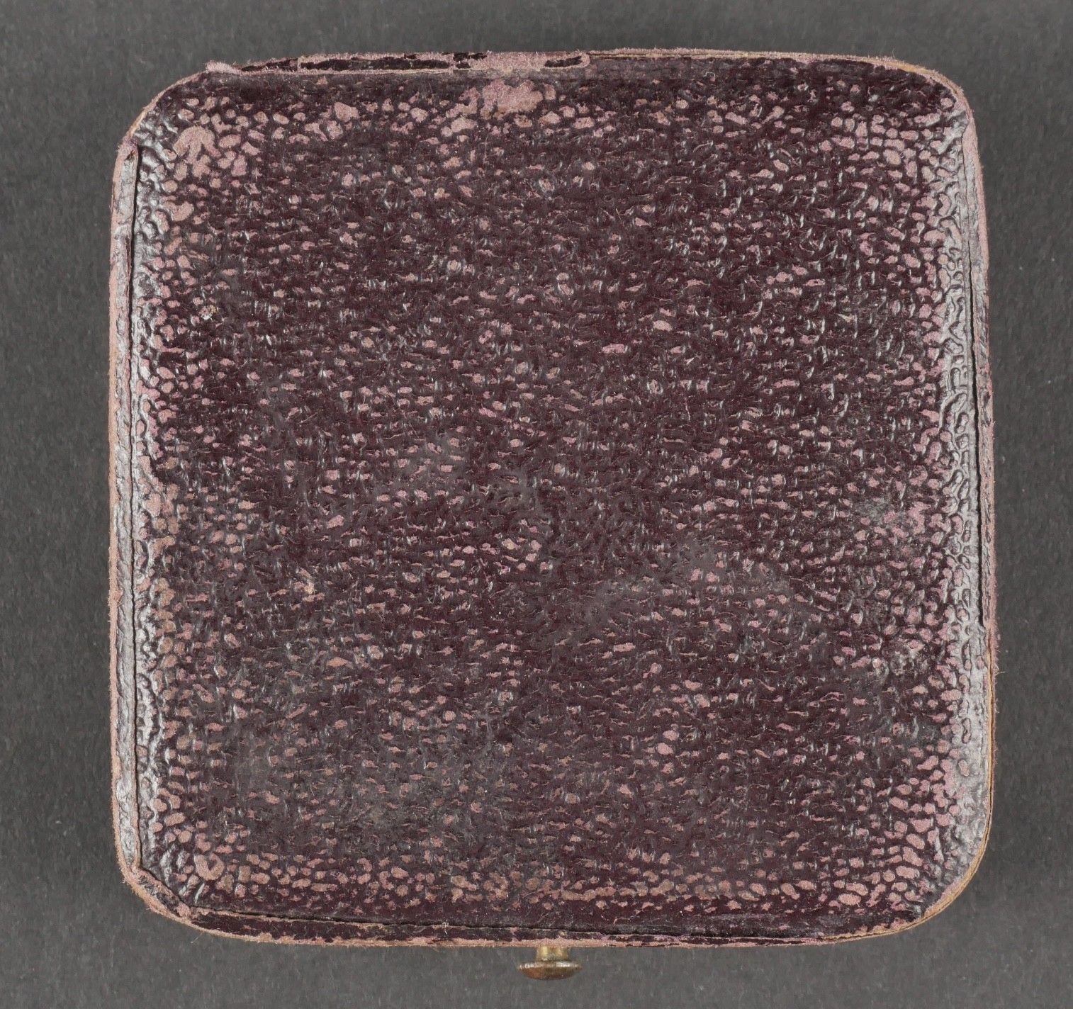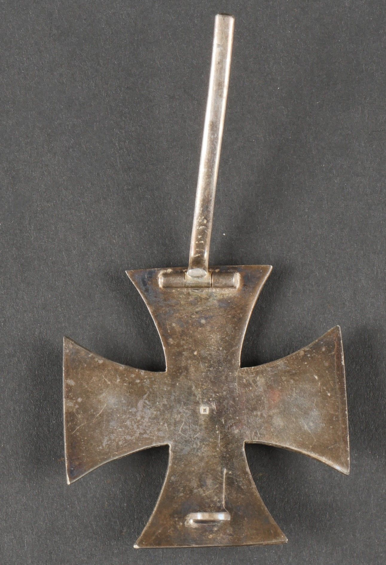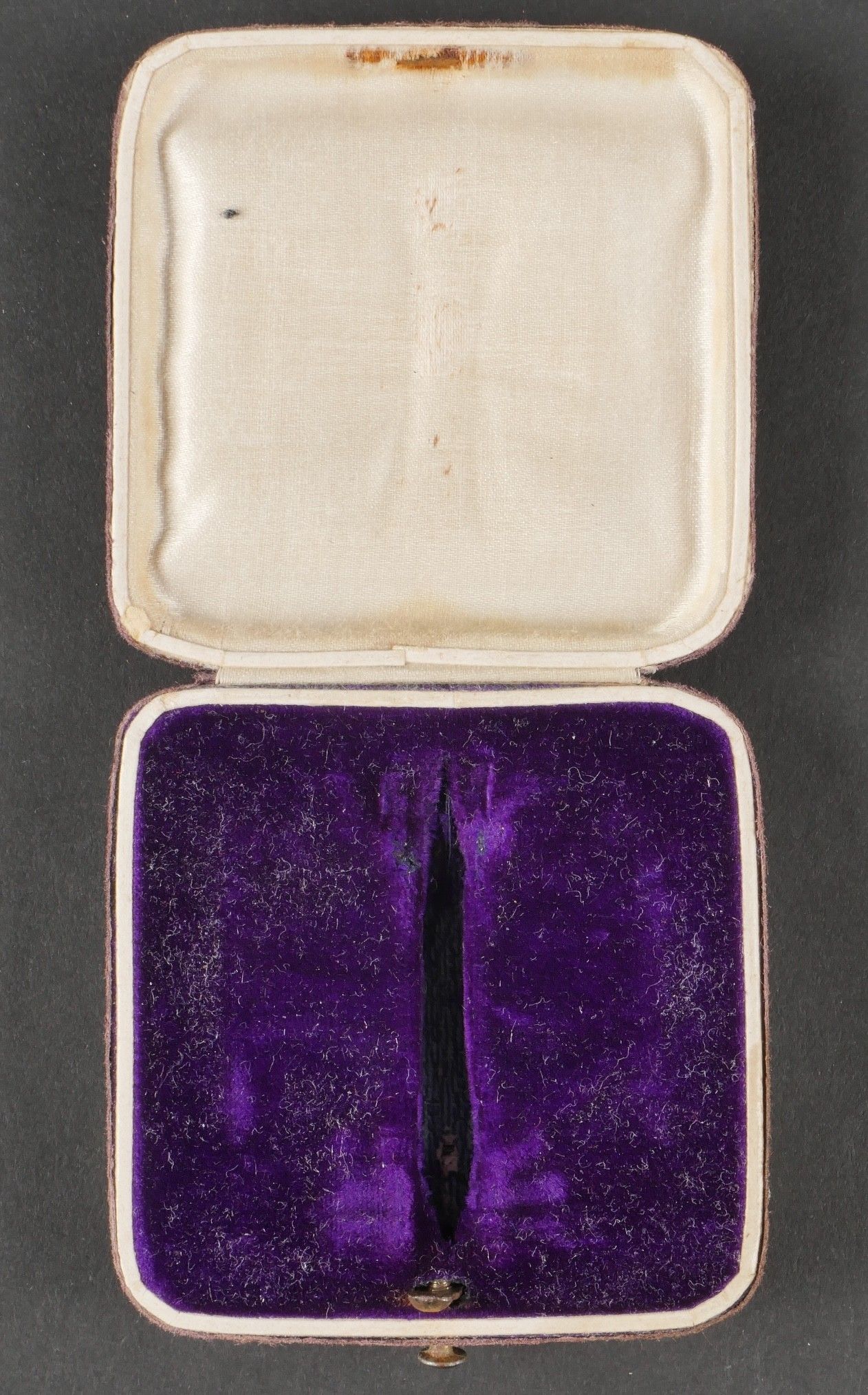 World War I Iron Cross, First Class. Domed model. Manufactured in three parts. 70% black. Complete fastening on back. No visible markings. Box heavily worn, reproduction of an iron cross in the middle of the lid. Functional clasp. Interior lined in white satinette and purple velvet. Some wear and patina. Condition II+. Iron Cross 1st Class from the First World War. Convex model of three-part construction. Black finish at 70%. Complete pin on the reverse. No visible markings. Heavily worn box with an embossed reproduction of an Iron Cross on the lid. Functional clasp. Interior lined with white satin and purple velvet. Some wear and patina visible on the piece. Condition II+. Lemarchand Normandie Collection.