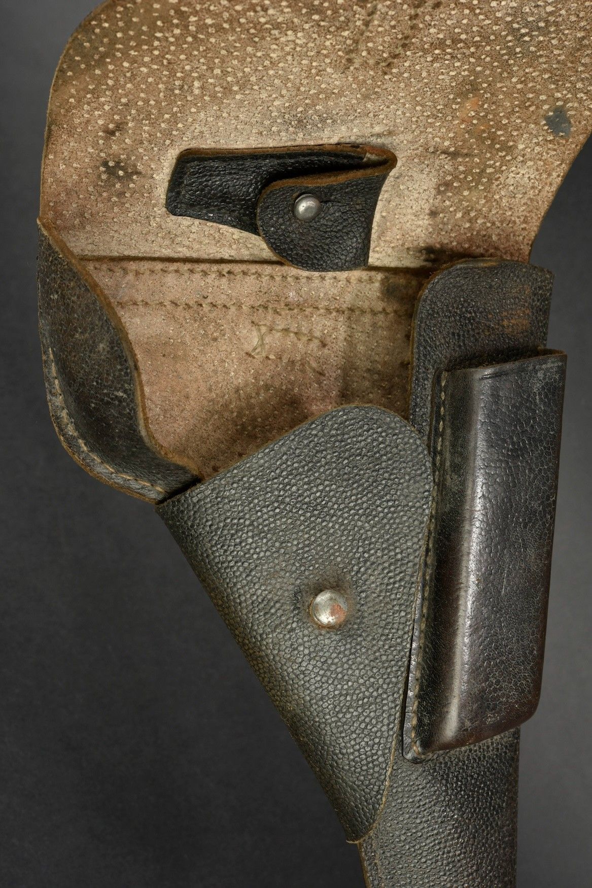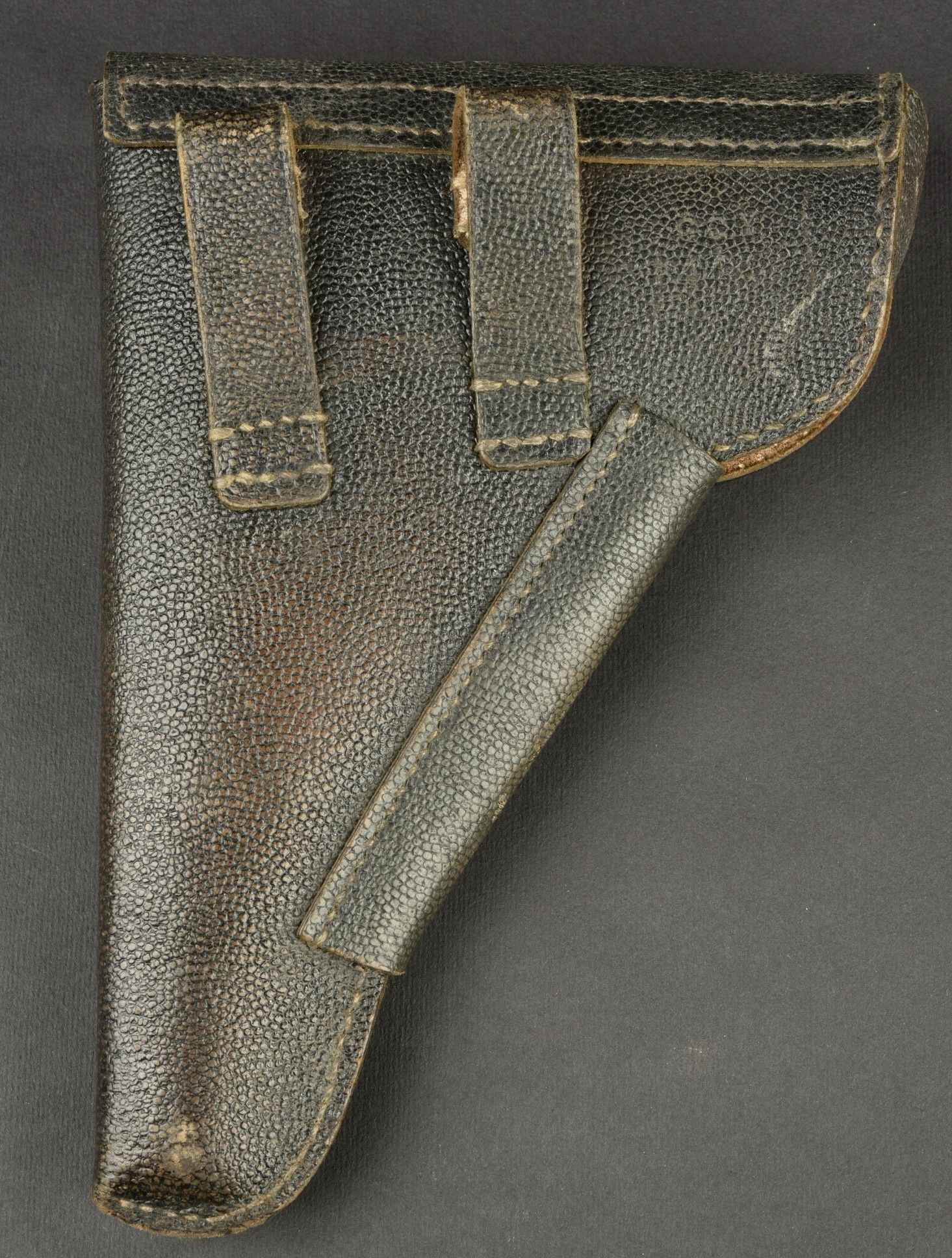 P38 pistol holster. Second model in black grained leather. The closing strap is complete. The belt loops are present. CCR 44 markings. Some wear and patina. Condition II+. P38 pistol holster, second model in pebbled black leather. Closure strap complete. Belt loops present. Marked CCR 44. Some wear and patina visible. Condition II+. Lemarchand Normandie Collection.
