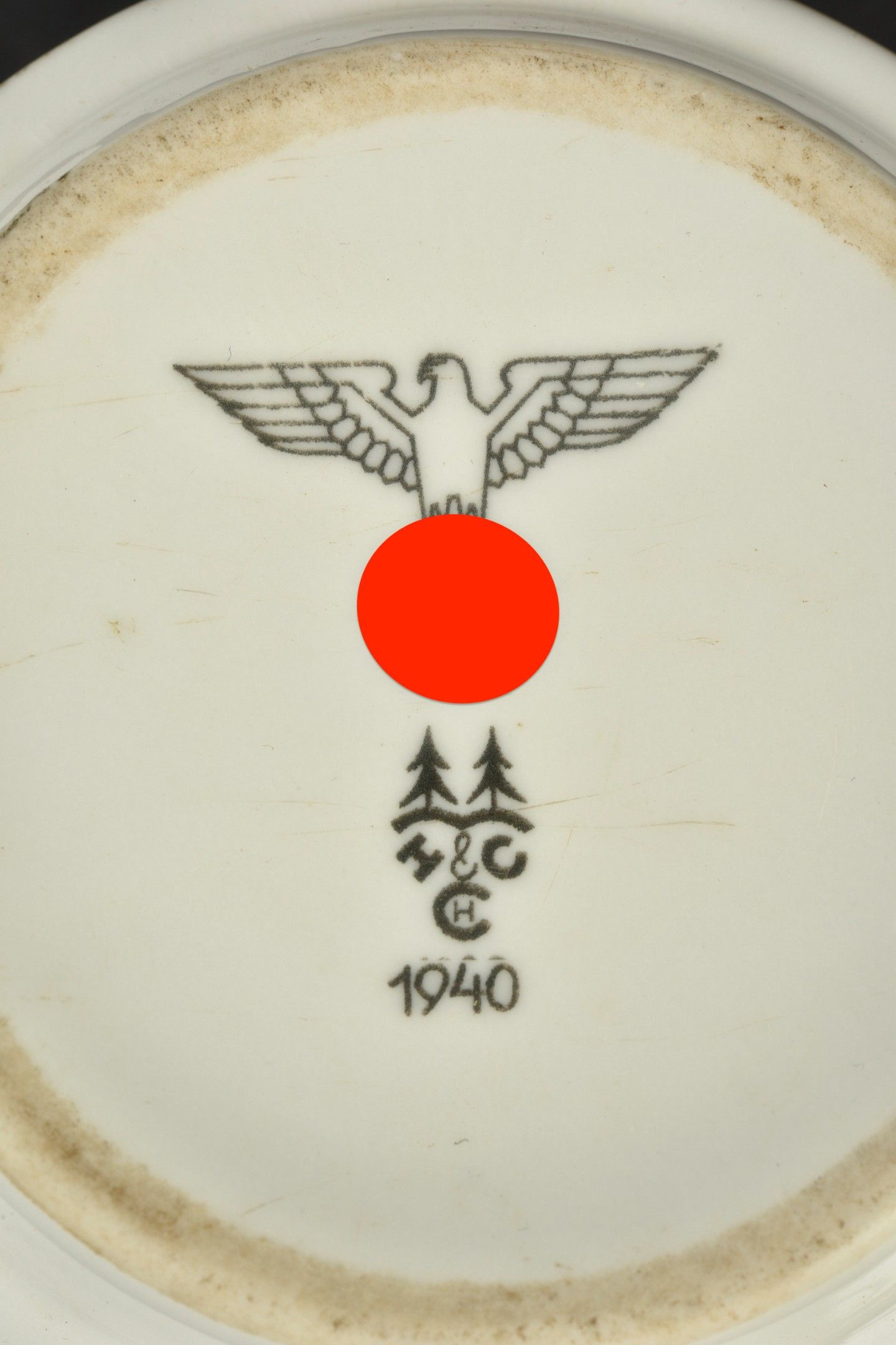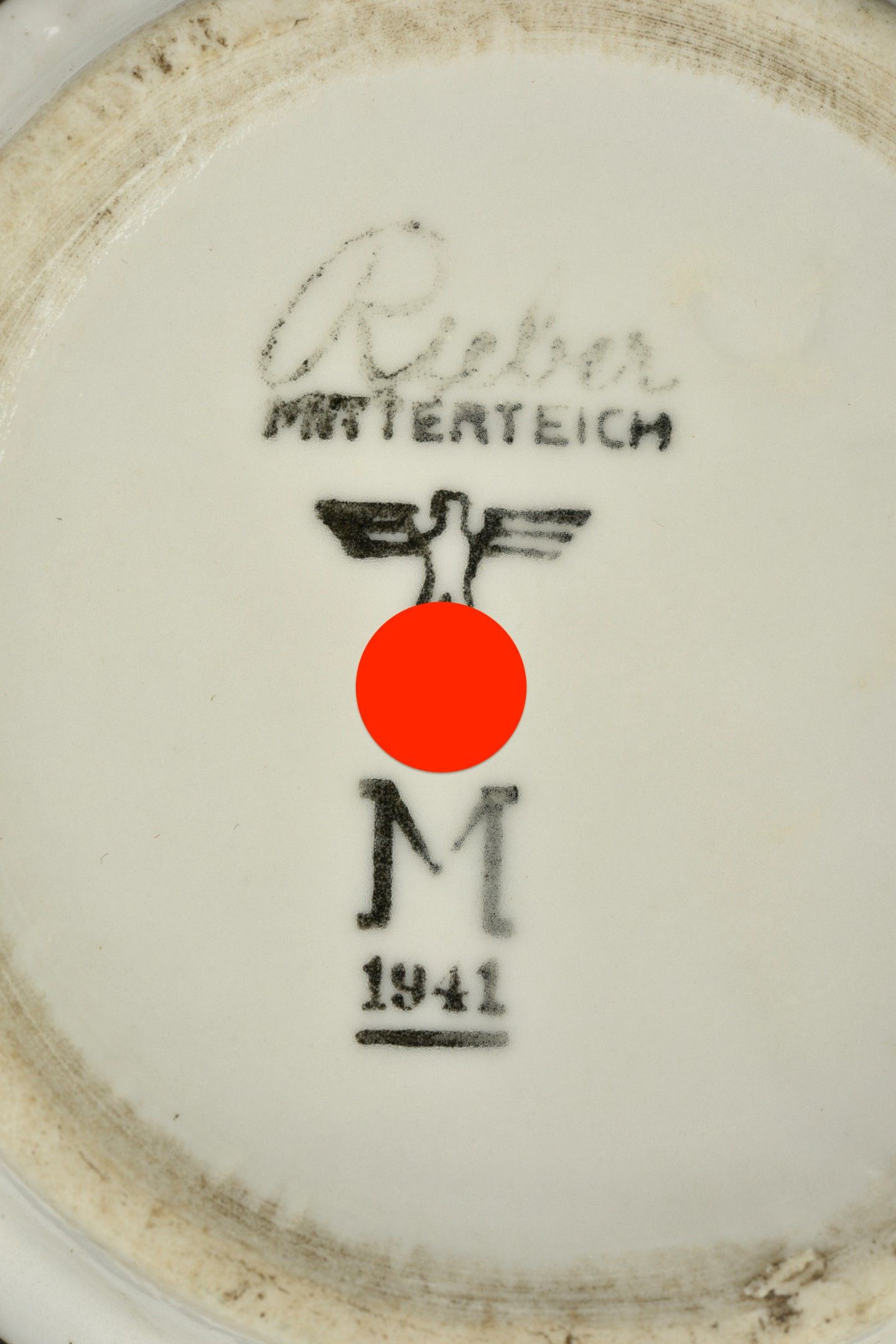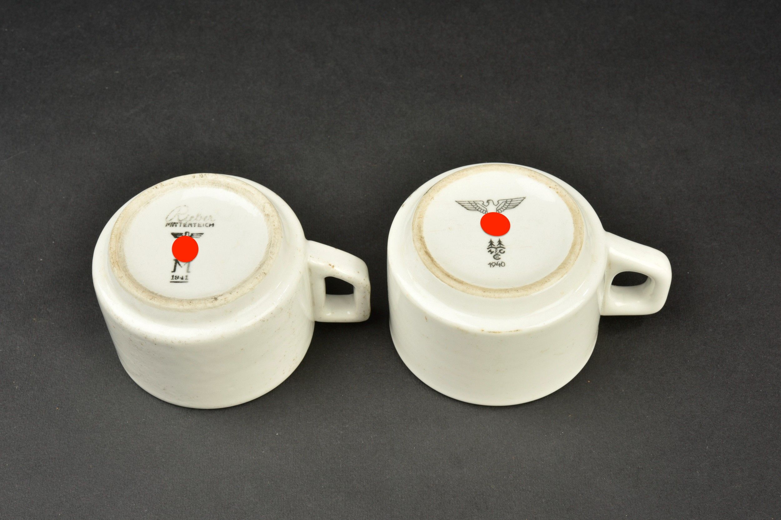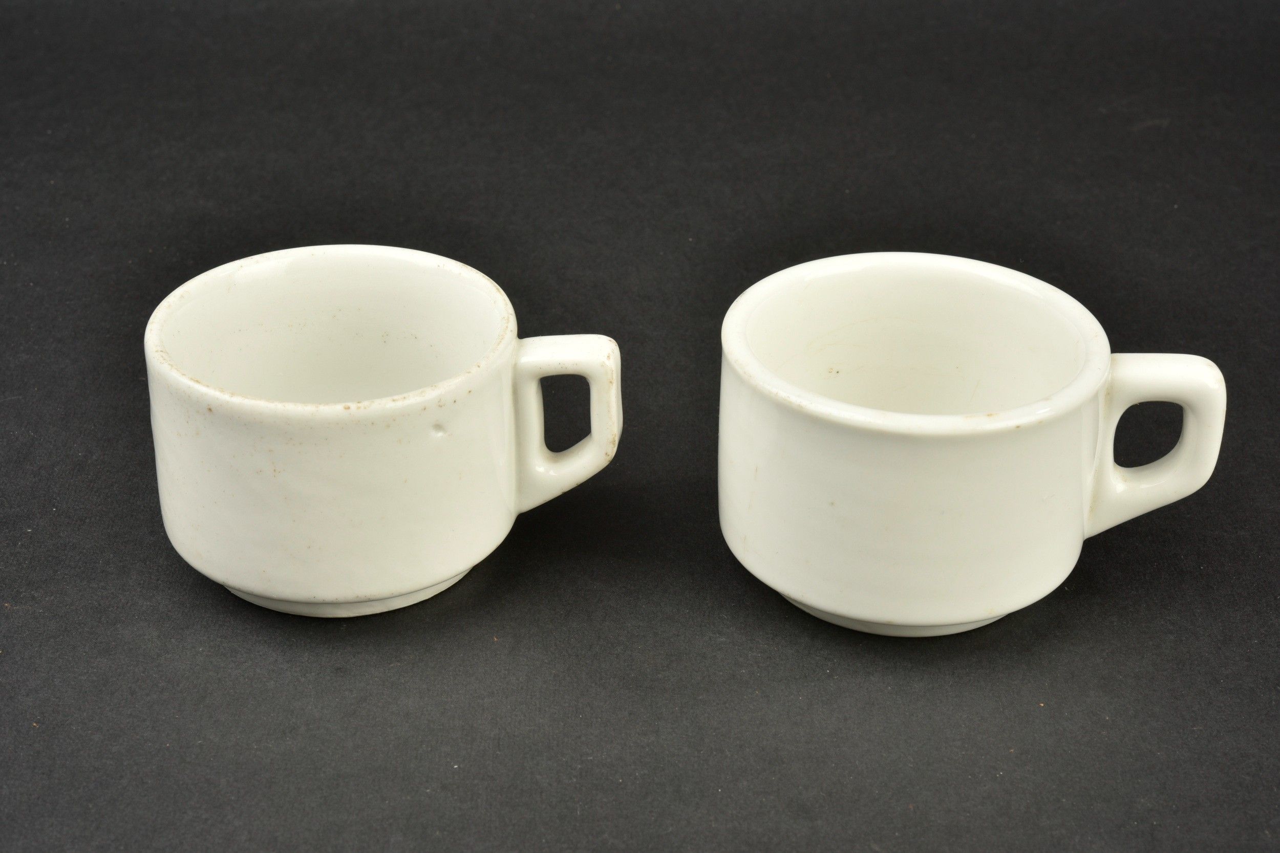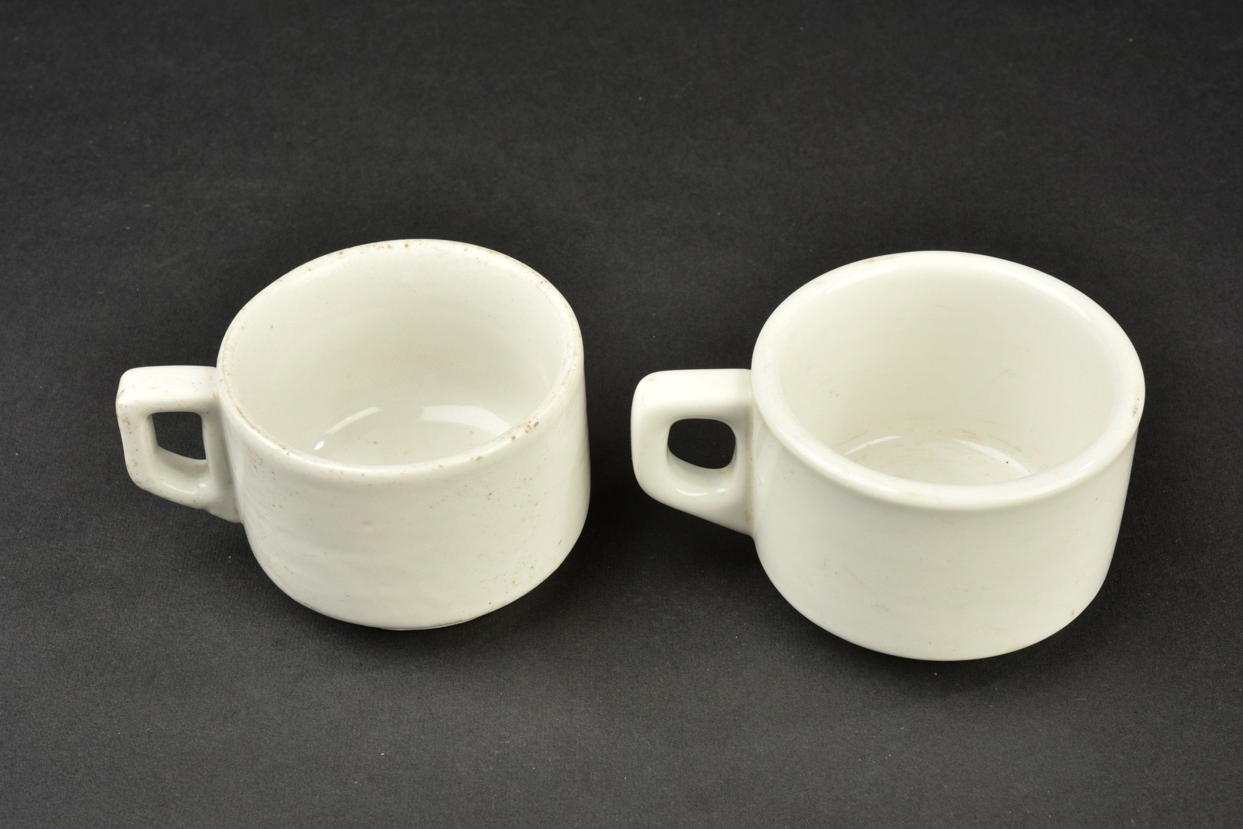 German mugs. Comprising two white ceramic cups, handles present. Markings of the Heer 1940, HCC manufacture and of the Kriegsmarine 1941, Rieber manufacture. Some wear and patina to be noted. Condition II+. German cups, comprising two white ceramic cups with handles intact. Marked Heer 1940, maker HCC, and Kriegsmarine 1941, maker Rieber. Some wear and patina visible. Condition II+. Lemarchand Normandie Collection.