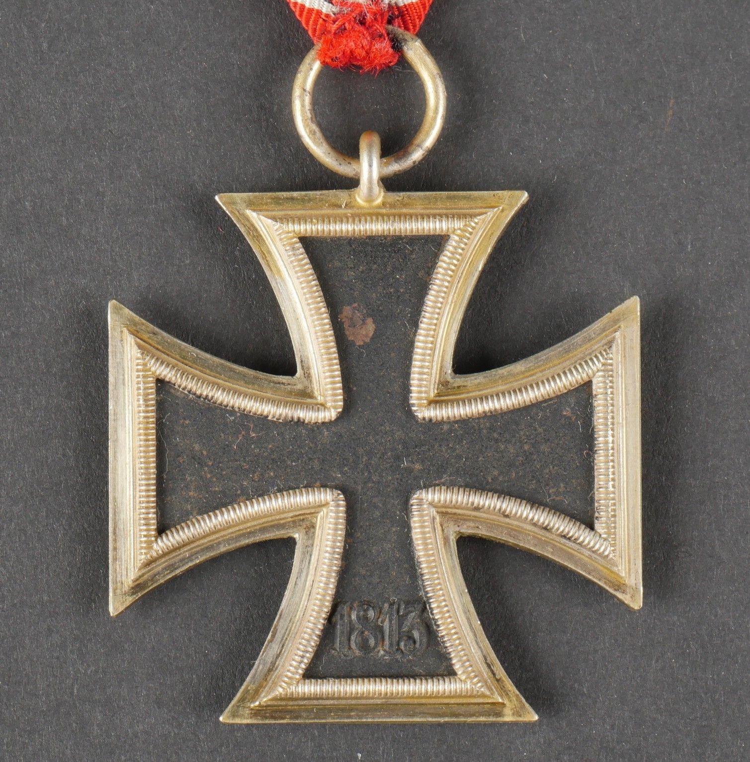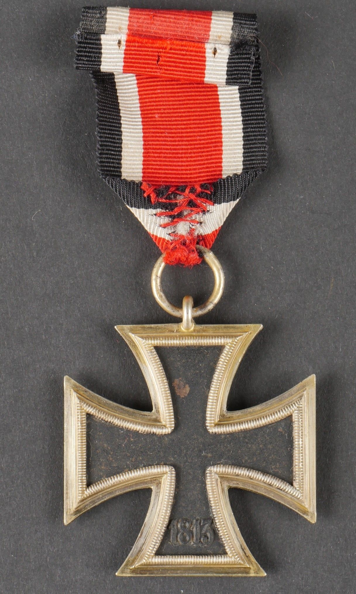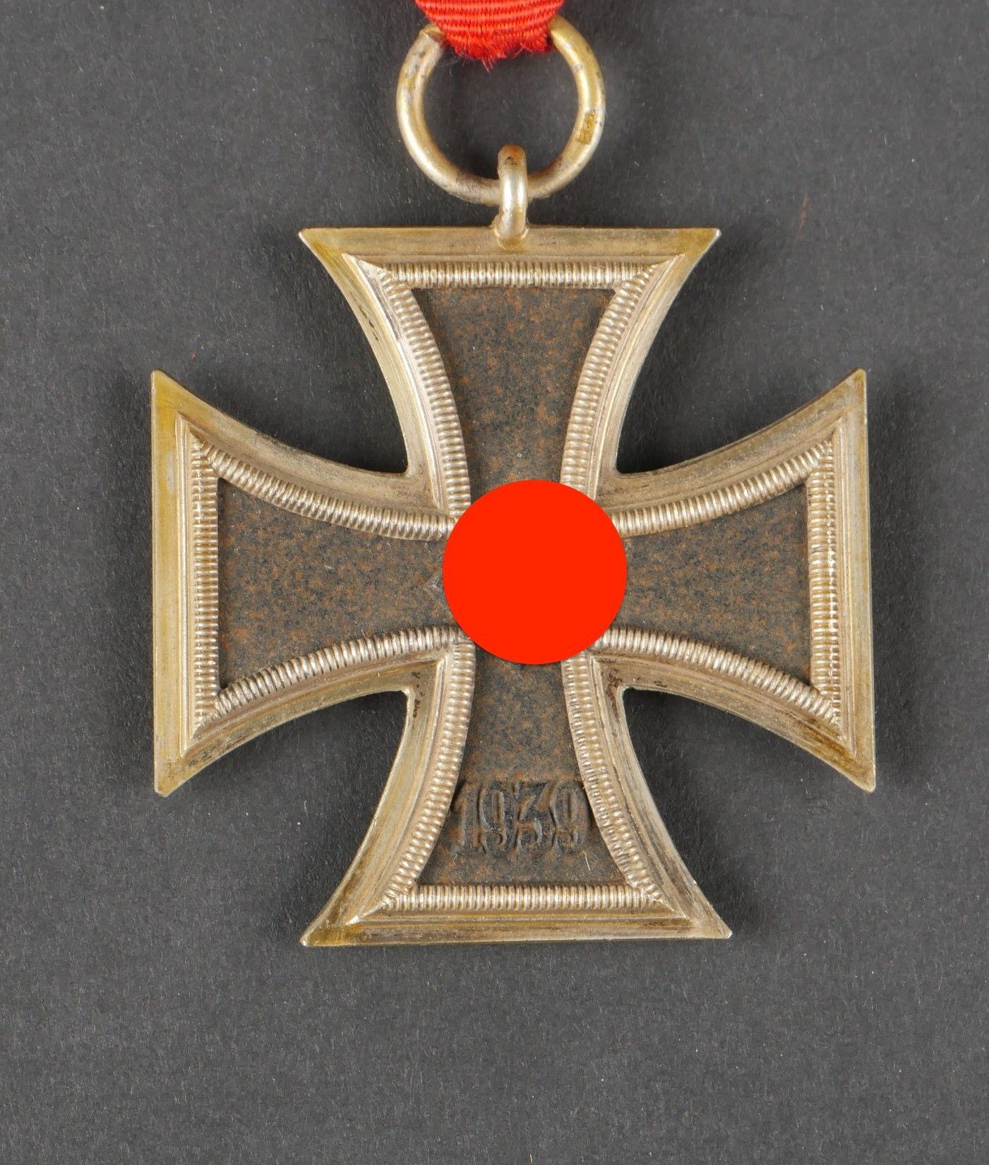 Second class iron cross. Manufactured in three parts. 95% black. Complete ribbon. Manufacture 122. Some wear and patina to be noted. Condition II+. Lemarchand Normandie Collection. Iron Cross 2nd Class of three-part construction with 95% of the black finish remaining. Complete ribbon. Maker 122. Some wear and patina visible. Condition II+. Lemarchand Normandie Collection.