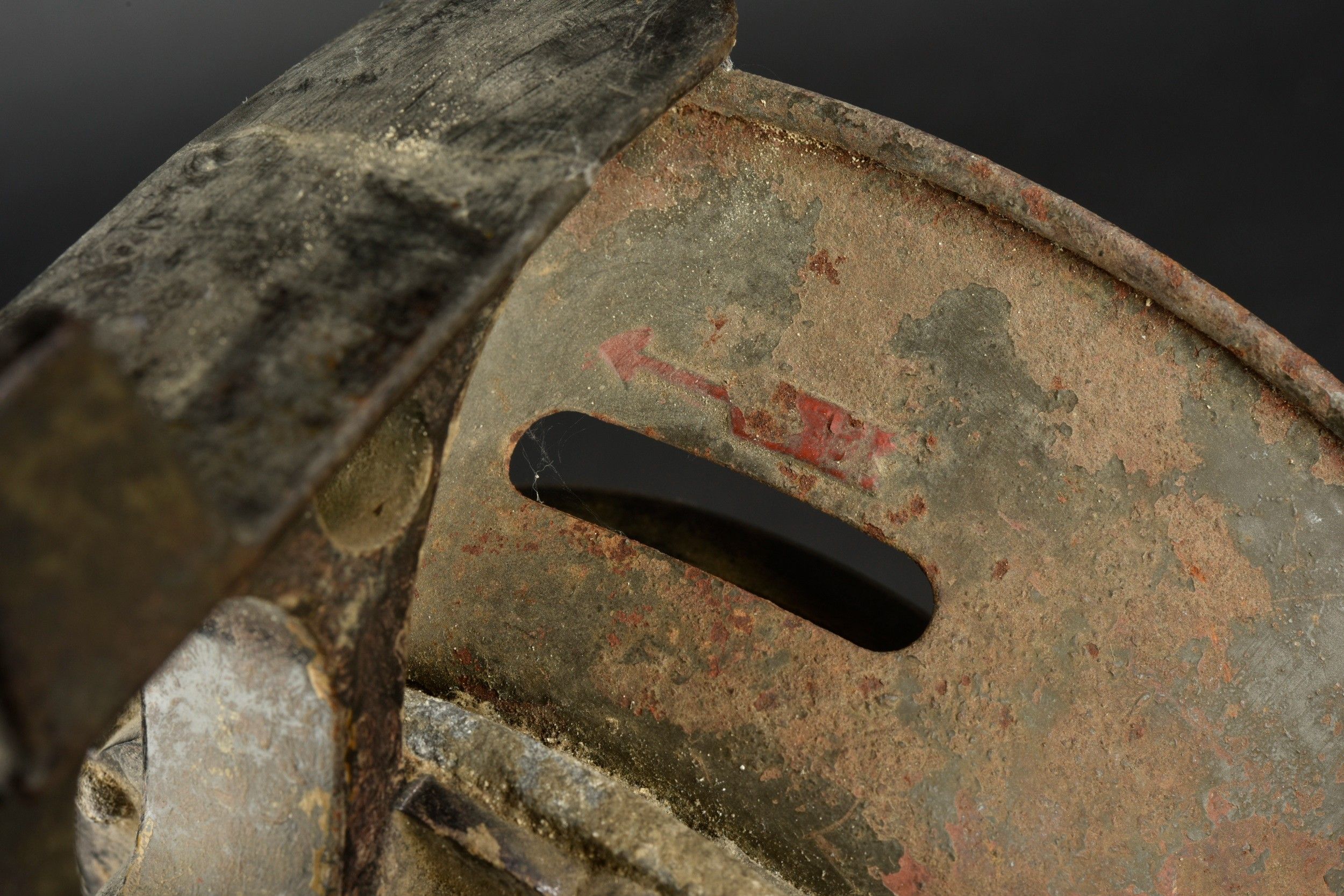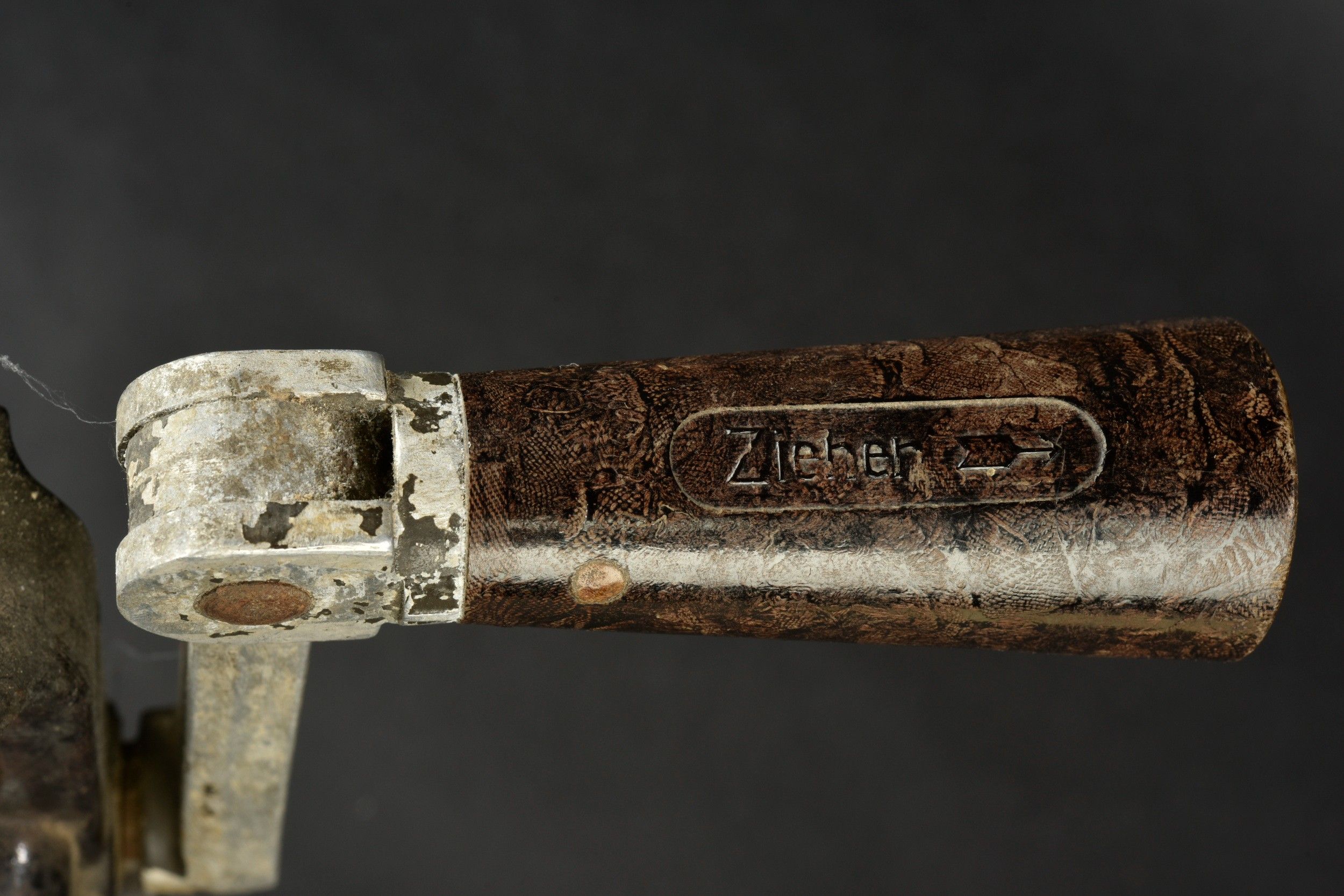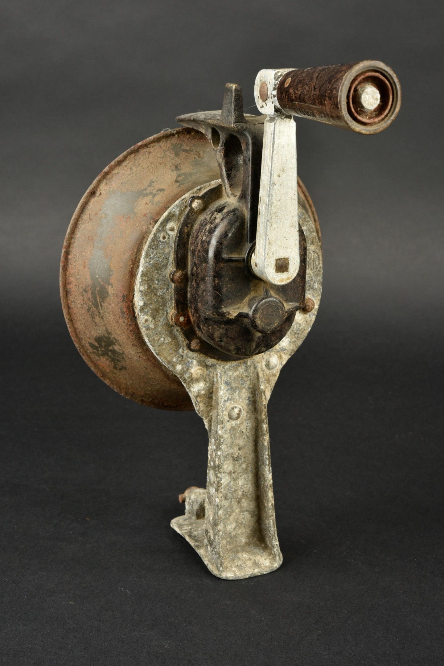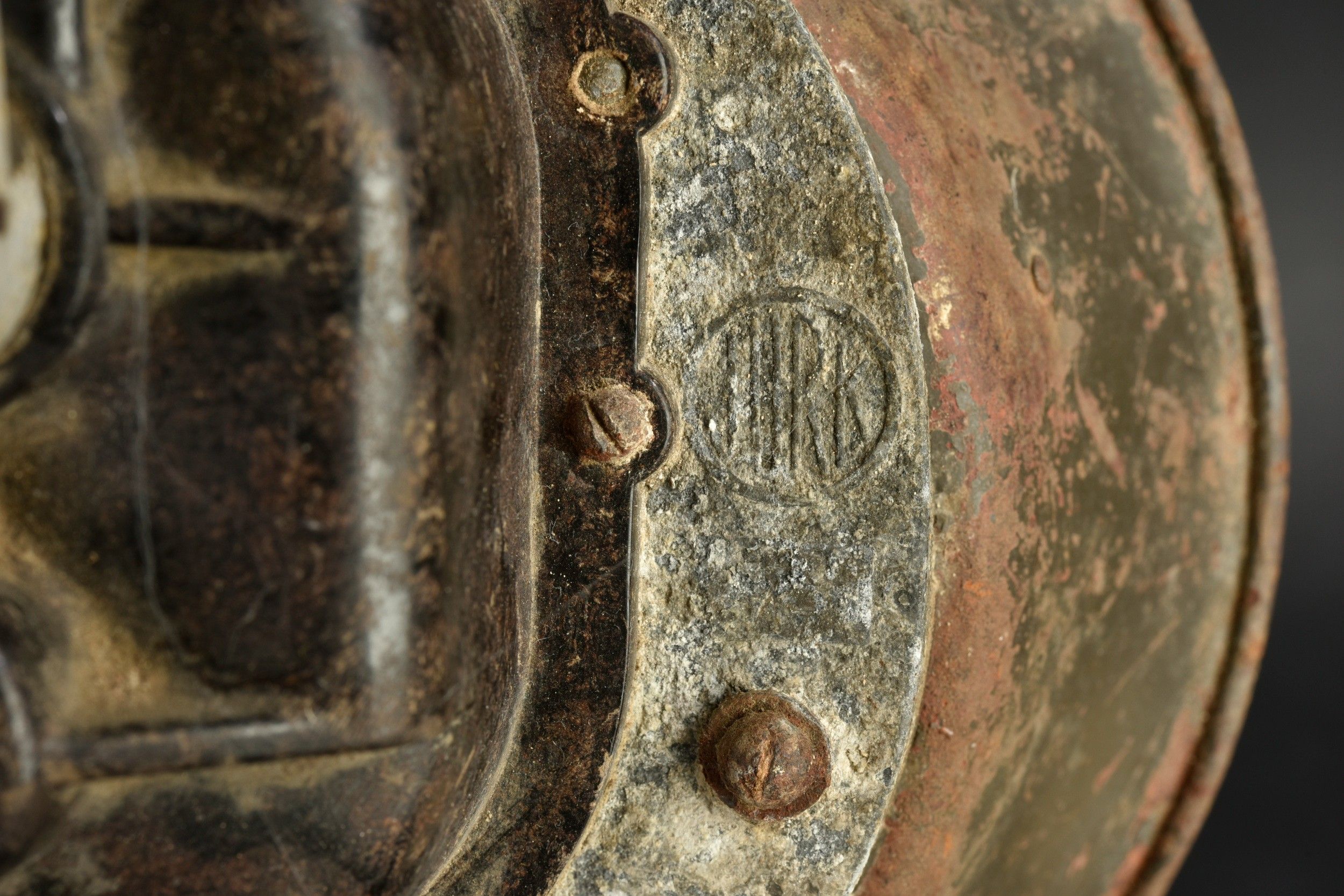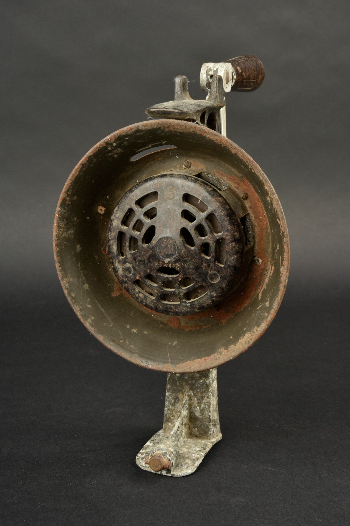 German hand-held siren. Metal and bakelite. The stand is incomplete. Parts of the bakelite are missing. Not functional. Bakelite handle marked Ziehen. Manufactured by Jurk, date illegible. Heavy wear and oxidation. Condition II-. Lemarchand Normandie collection. German hand siren made of metal and bakelite. Incomplete support with missing bakelite parts. Non-functional. Bakelite handle marked Ziehen. Maker Jurk, date illegible. Heavy wear and oxidation visible. Condition II-. Lemarchand Normandie Collection.