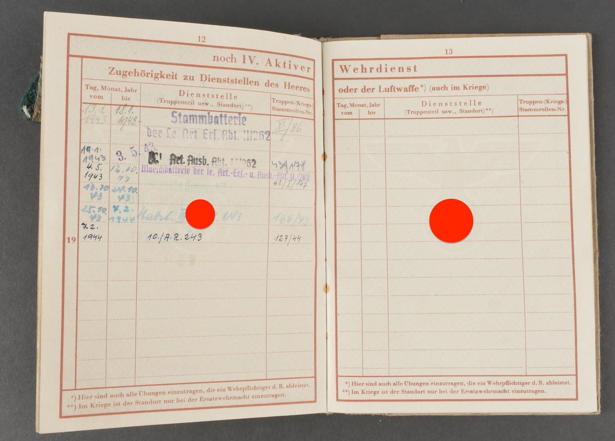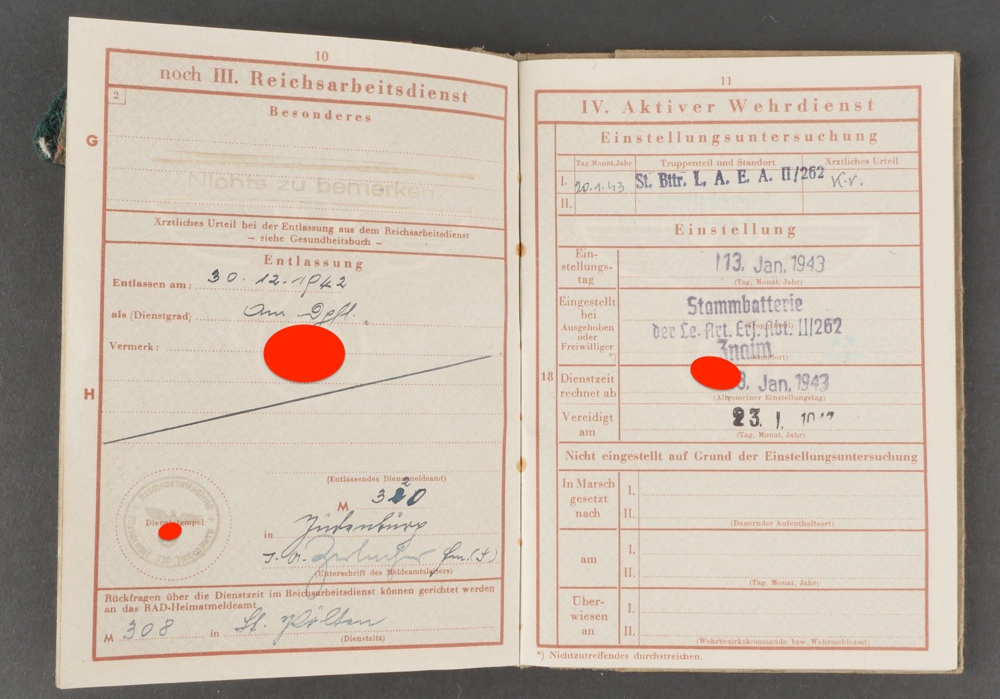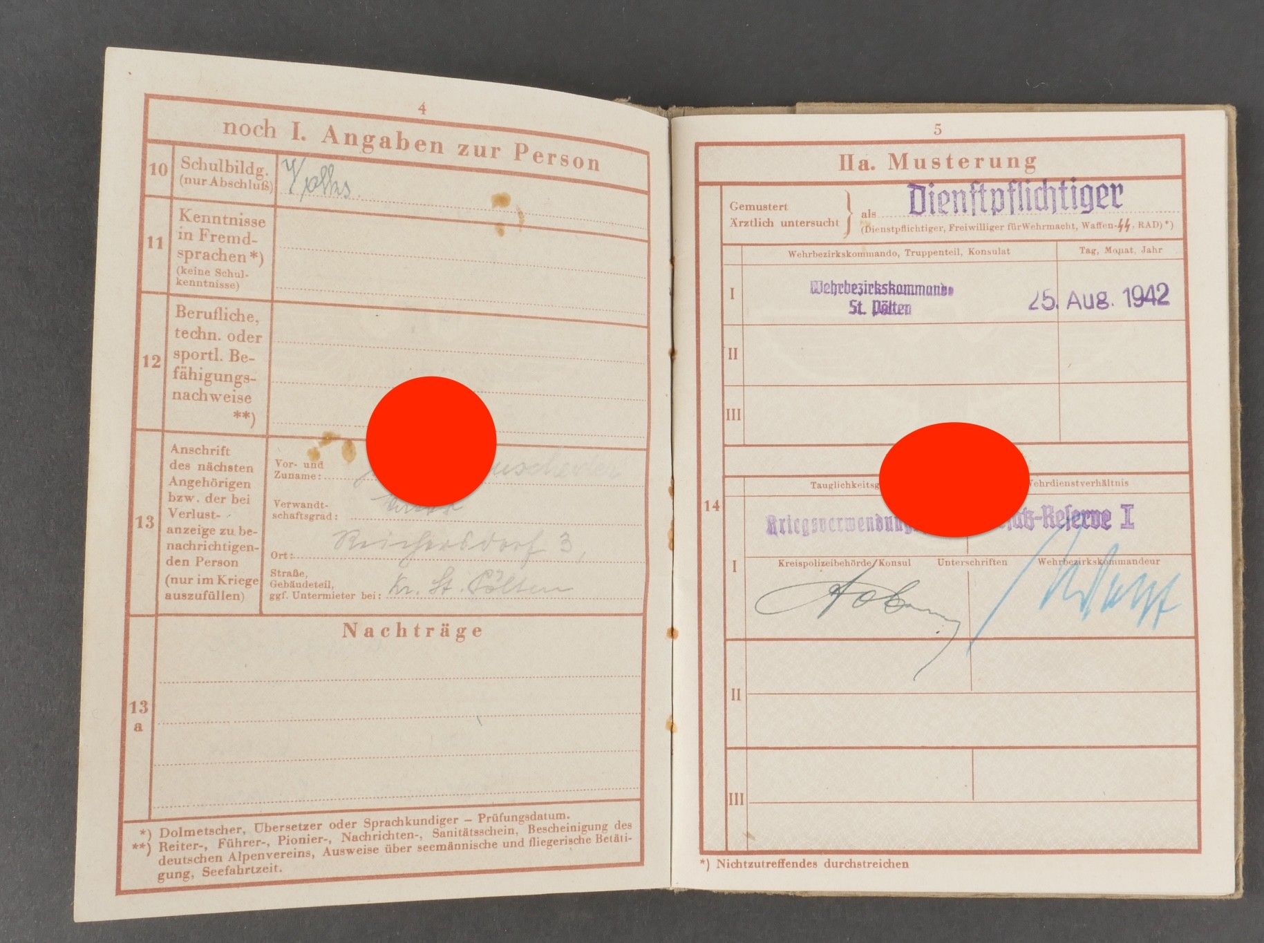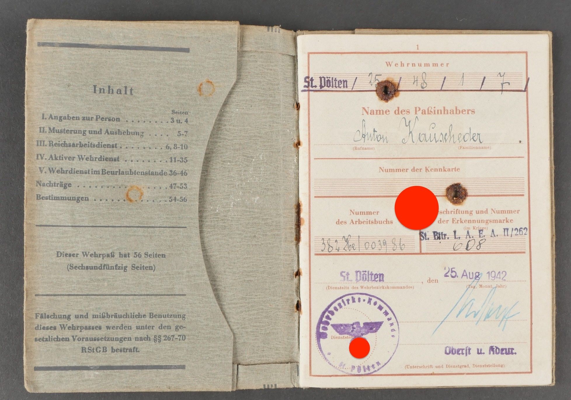 German Wehrpass. Hardback cover, handsome Heer eagle. Handwritten inscription Kauscheder. Book opened on 25 August 1942, in St Pölten, in the name of Anton Kauscheder. Passport photo present. Service with the RAD in 1942. Numerous enlistments, including 10/AR 243. Rank of Gefreiten on 1 May 1944. Service on the Atlantikküste in France. Two cap roundels are attached. Some wear and patina to be noted. Condition II+. Lemarchand Normandie Collection. German Wehrpass with cardboard cover bearing a fine Heer eagle. Handwritten name Kauscheder. Opened on 25 August 1942 at St. Pölten in the name of Anton Kauscheder. Photo ID present. Recorded RAD service in 1942 and several assignments including 10/AR 243. Rank of Gefreiter dated 1 May 1944. Served on the Atlantic coast of France. Accompanied by two side cap cockades. Some wear and patina visible. Condition II+. Lemarchand Normandie Collection.