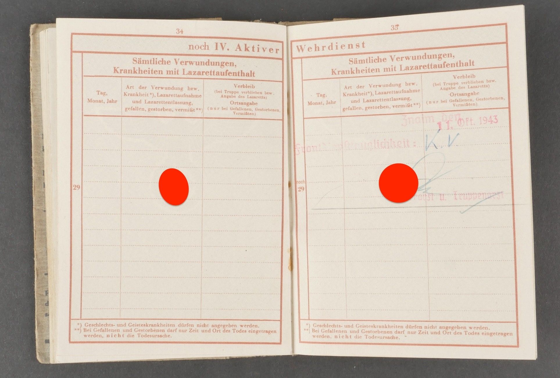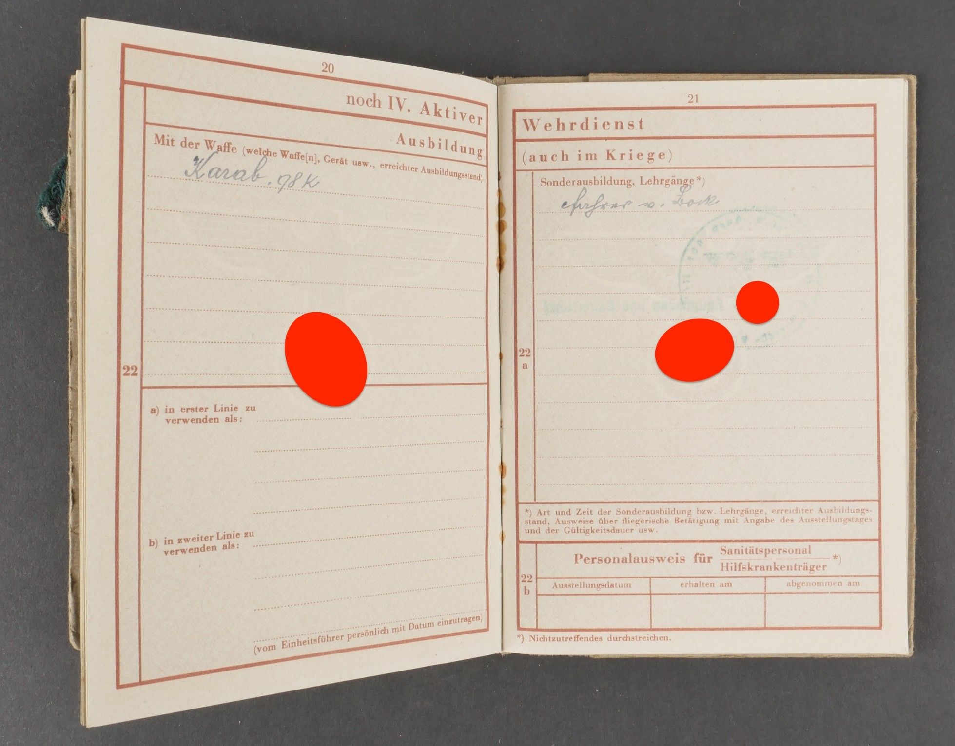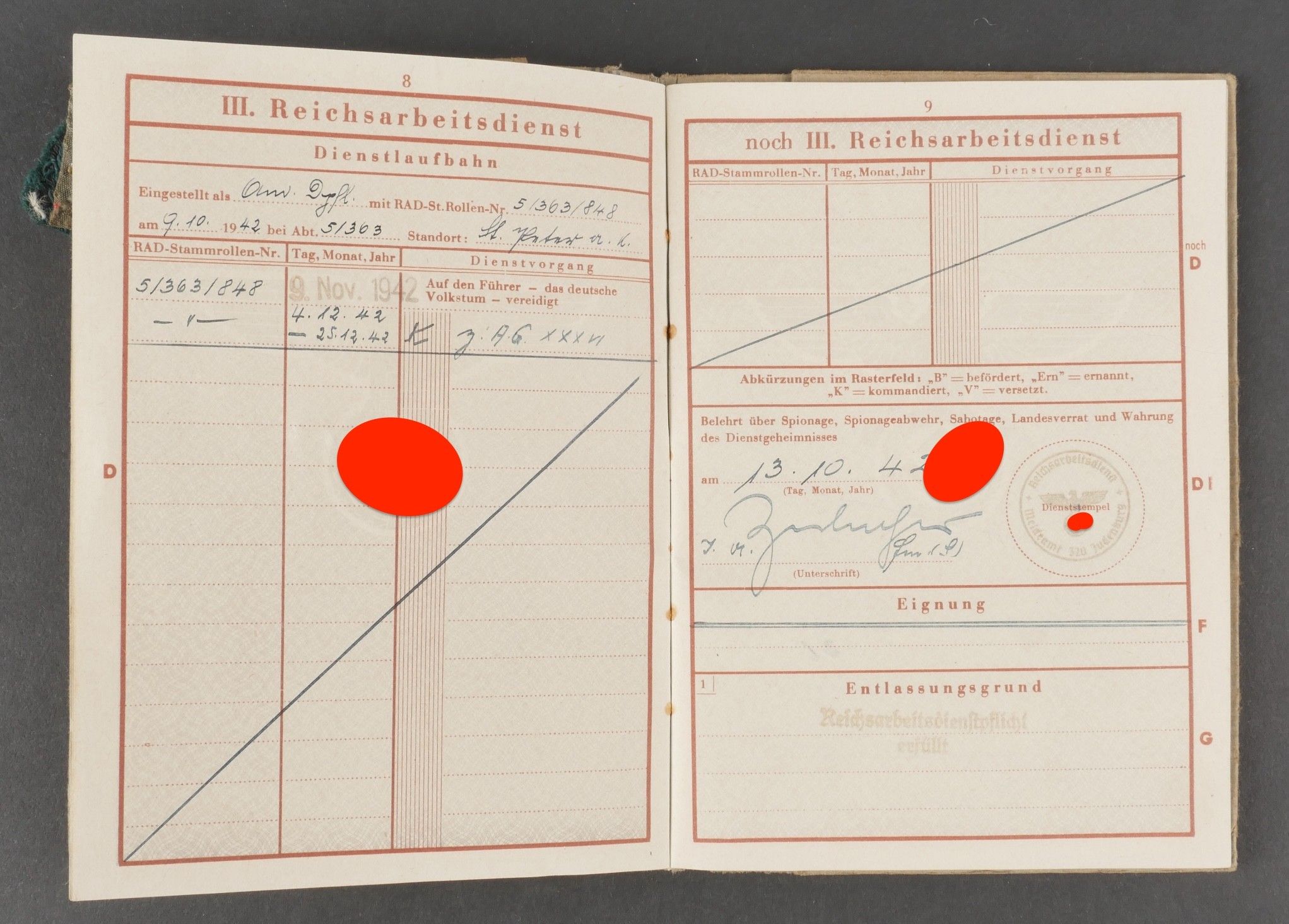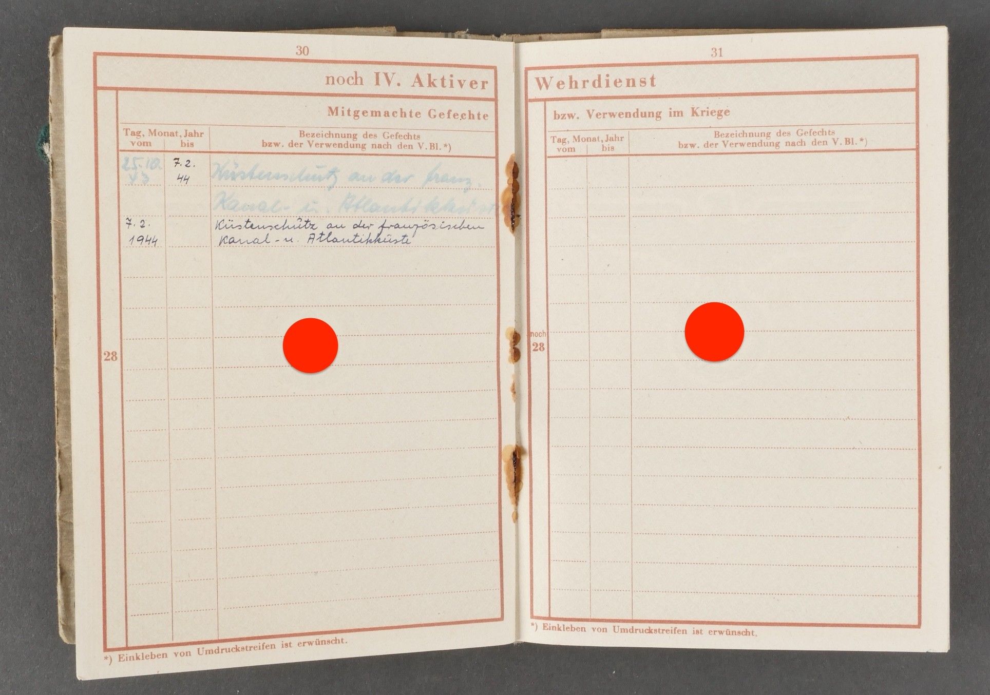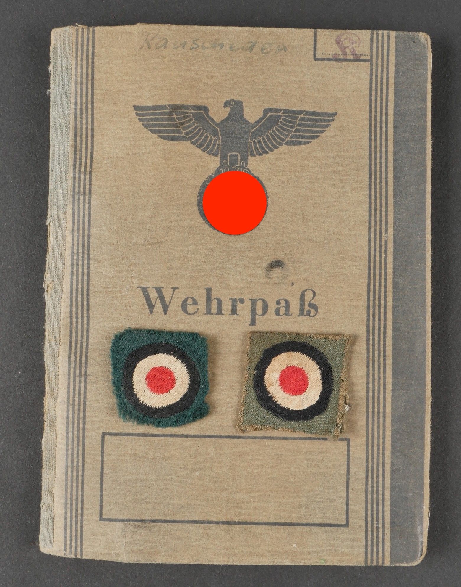 German Wehrpass. Hardback cover, handsome Heer eagle. Handwritten inscription Kauscheder. Book opened on 25 August 1942, in St Pölten, in the name of Anton Kauscheder. Passport photo present. Service with the RAD in 1942. Numerous enlistments, including 10/AR 243. Rank of Gefreiten on 1 May 1944. Service on the Atlantikküste in France. Two cap roundels are attached. Some wear and patina to be noted. Condition II+. Lemarchand Normandie Collection. German Wehrpass with cardboard cover bearing a fine Heer eagle. Handwritten name Kauscheder. Opened on 25 August 1942 at St. Pölten in the name of Anton Kauscheder. Photo ID present. Recorded RAD service in 1942 and several assignments including 10/AR 243. Rank of Gefreiter dated 1 May 1944. Served on the Atlantic coast of France. Accompanied by two side cap cockades. Some wear and patina visible. Condition II+. Lemarchand Normandie Collection.