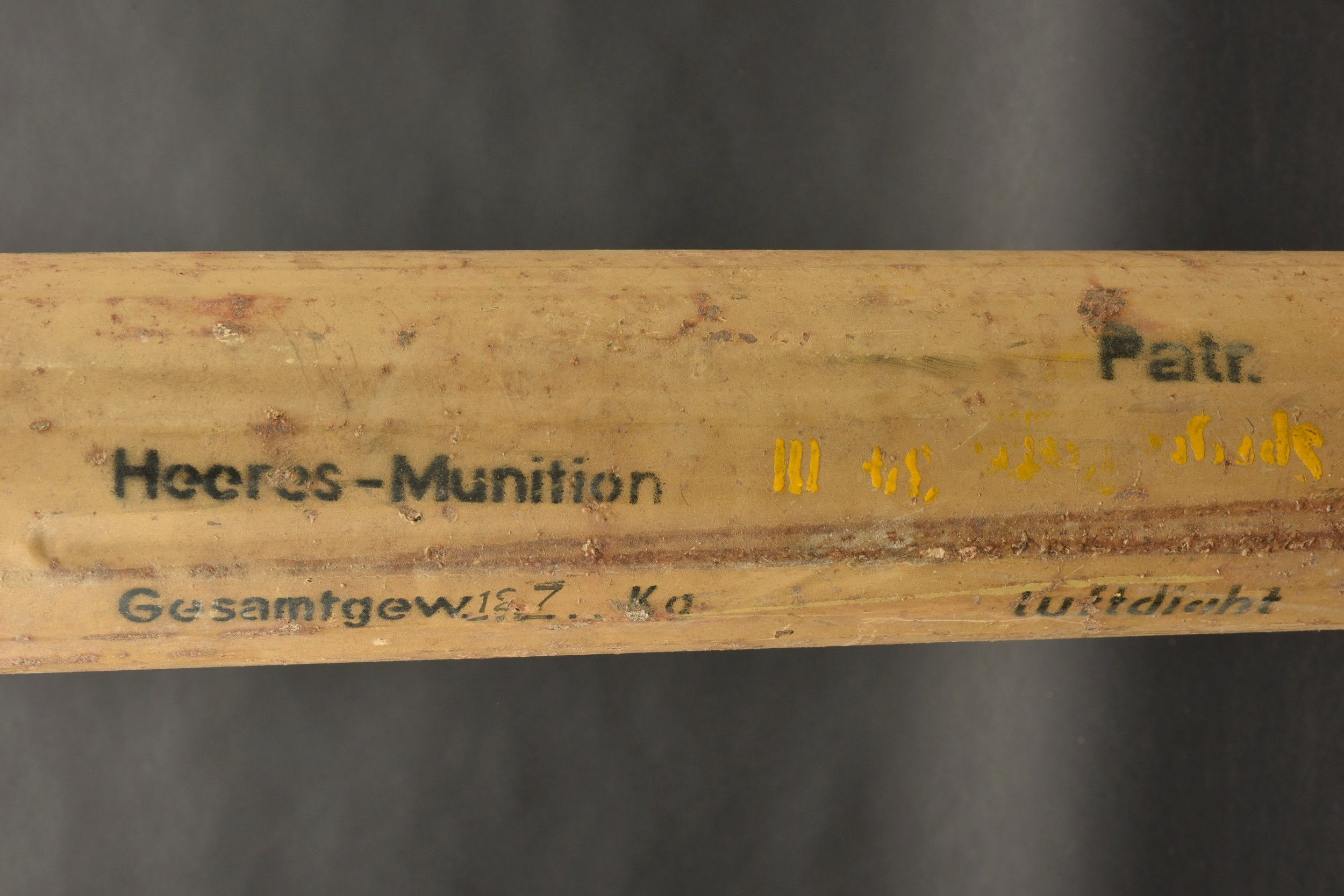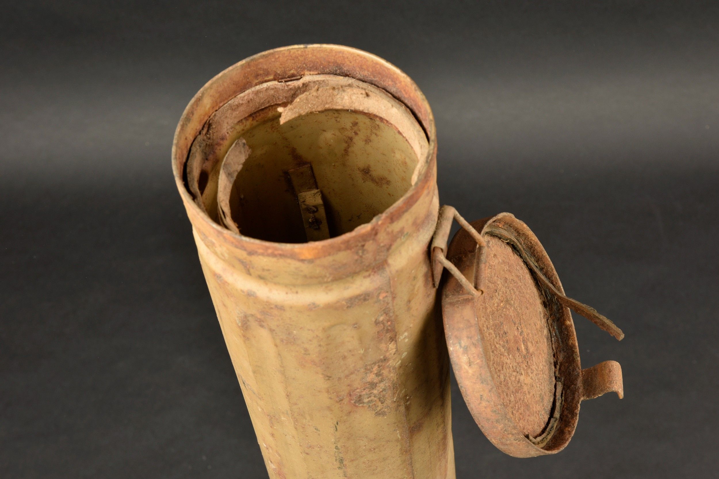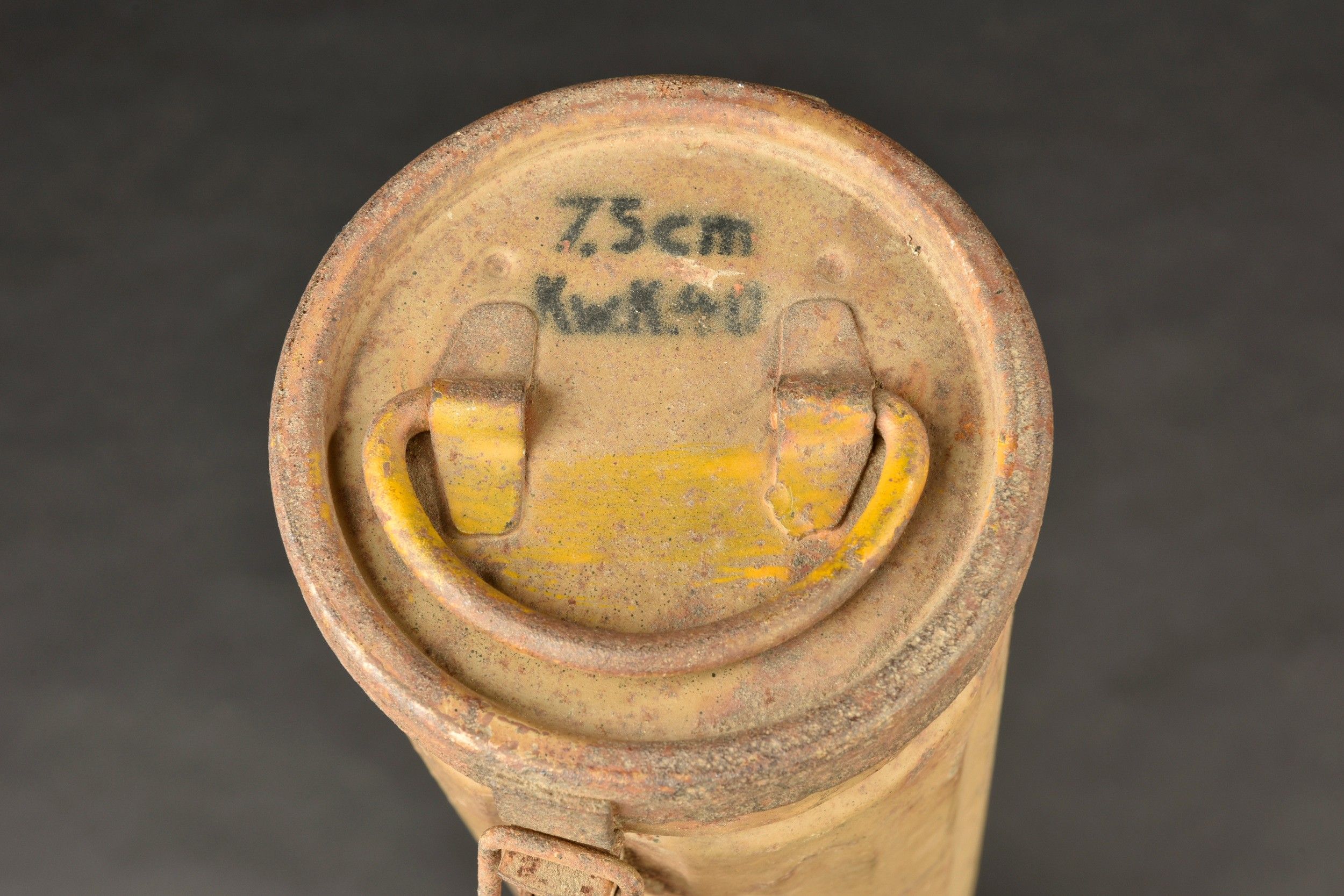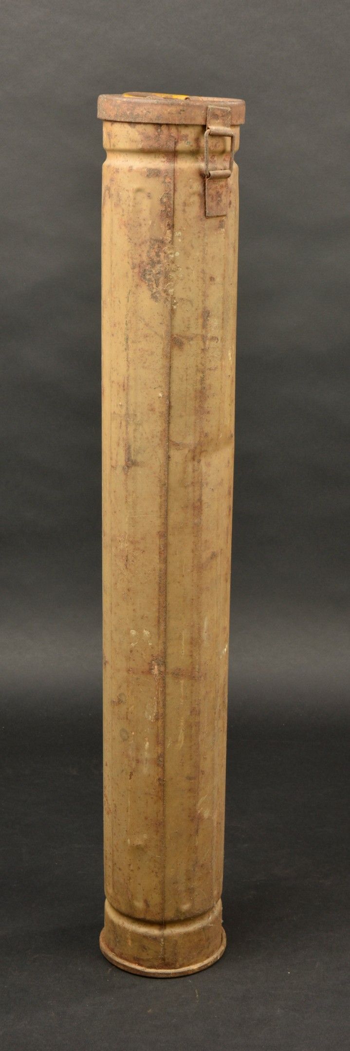 German 7.5 cm container. Metal, 80% sandy yellow paint. Some dents visible. Markings 7.5 KWK 40 on the lid, as well as a yellow stripe around the handle. The locking hook is complete and functional. Numerous illegible yellow and black paint markings. Lid gasket damaged and incomplete. Some wear and oxidation. Condition II+. Lemarchand Normandie Collection. German 7.5 cm container made of metal with 80% of the sand-yellow paint remaining. Some visible teeth. Marked 7.5 KWK 40 on the lid with a yellow stripe near the handle. Closure hook complete and functional. Numerous painted markings in yellow and black, partly illegible. Lid seal damaged and incomplete. Some wear and oxidation visible. Condition II+. Lemarchand Normandie Collection.