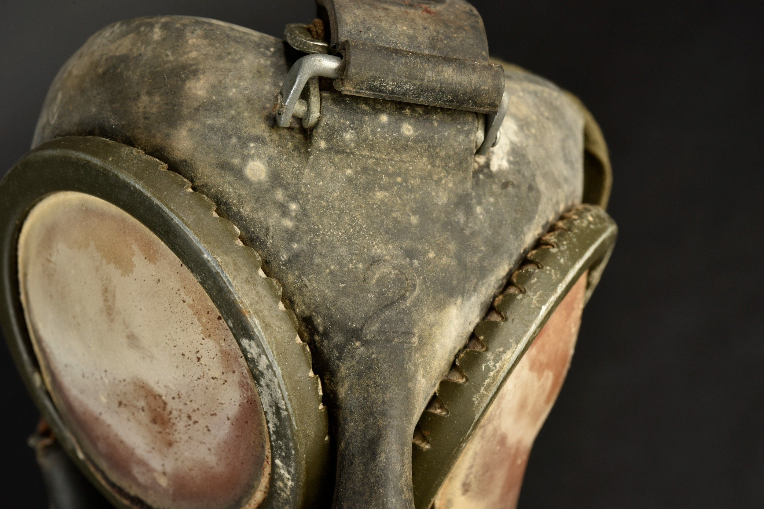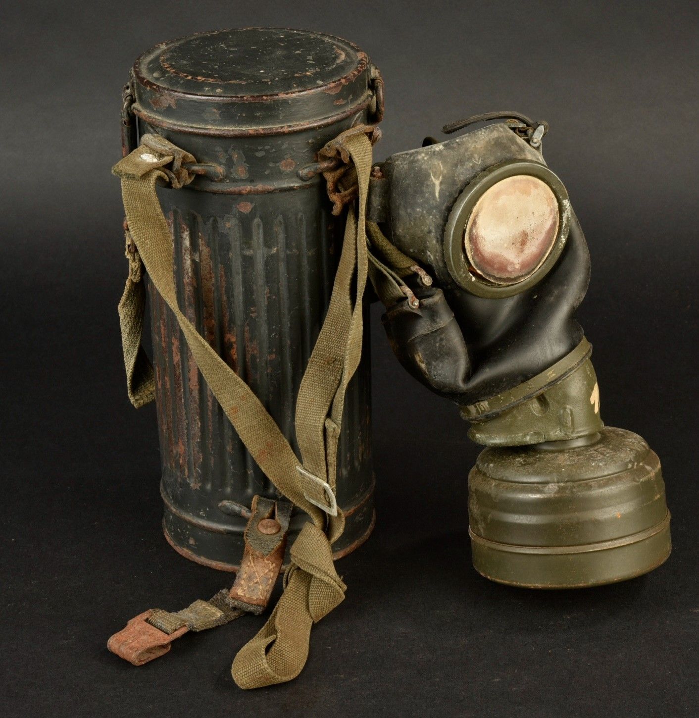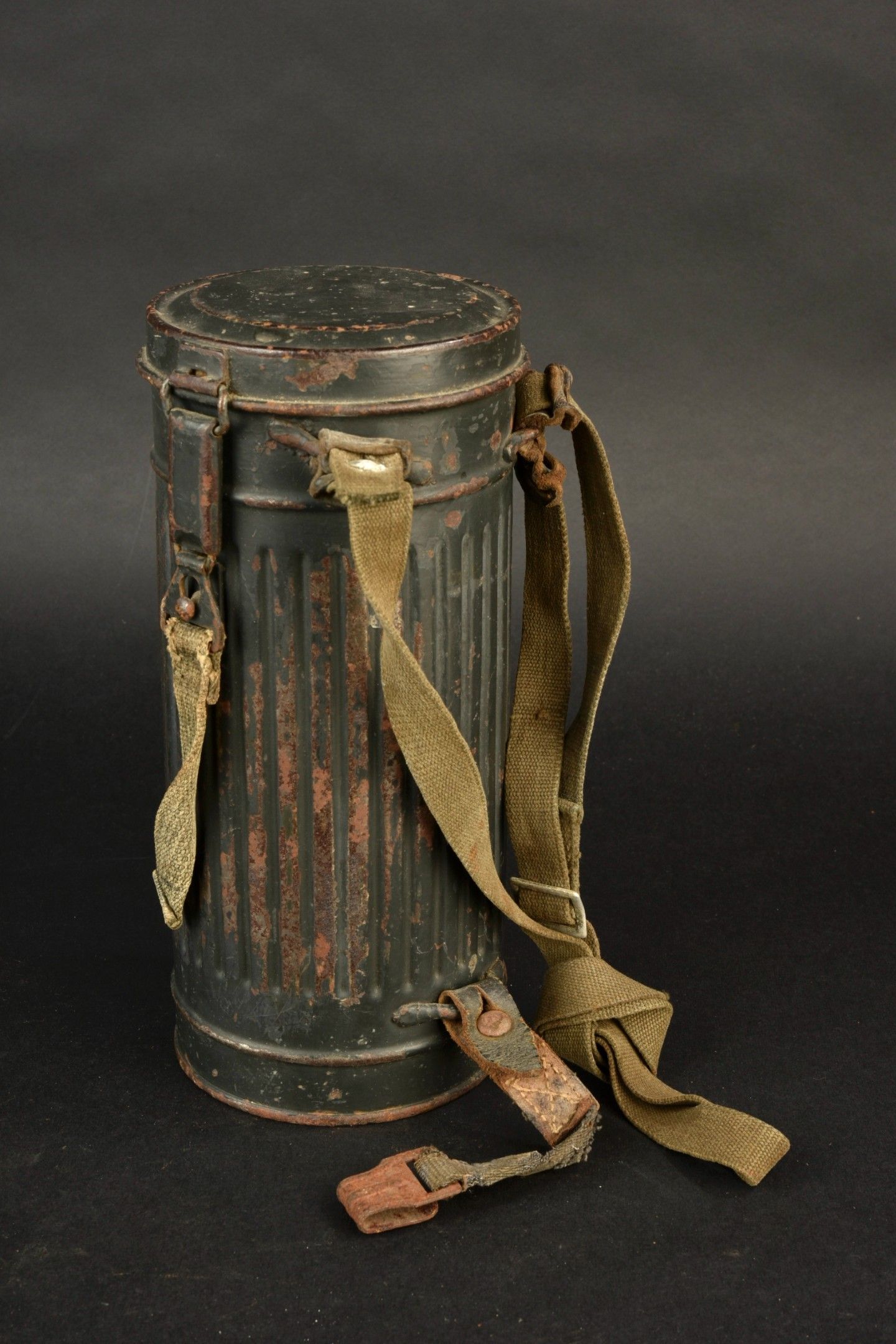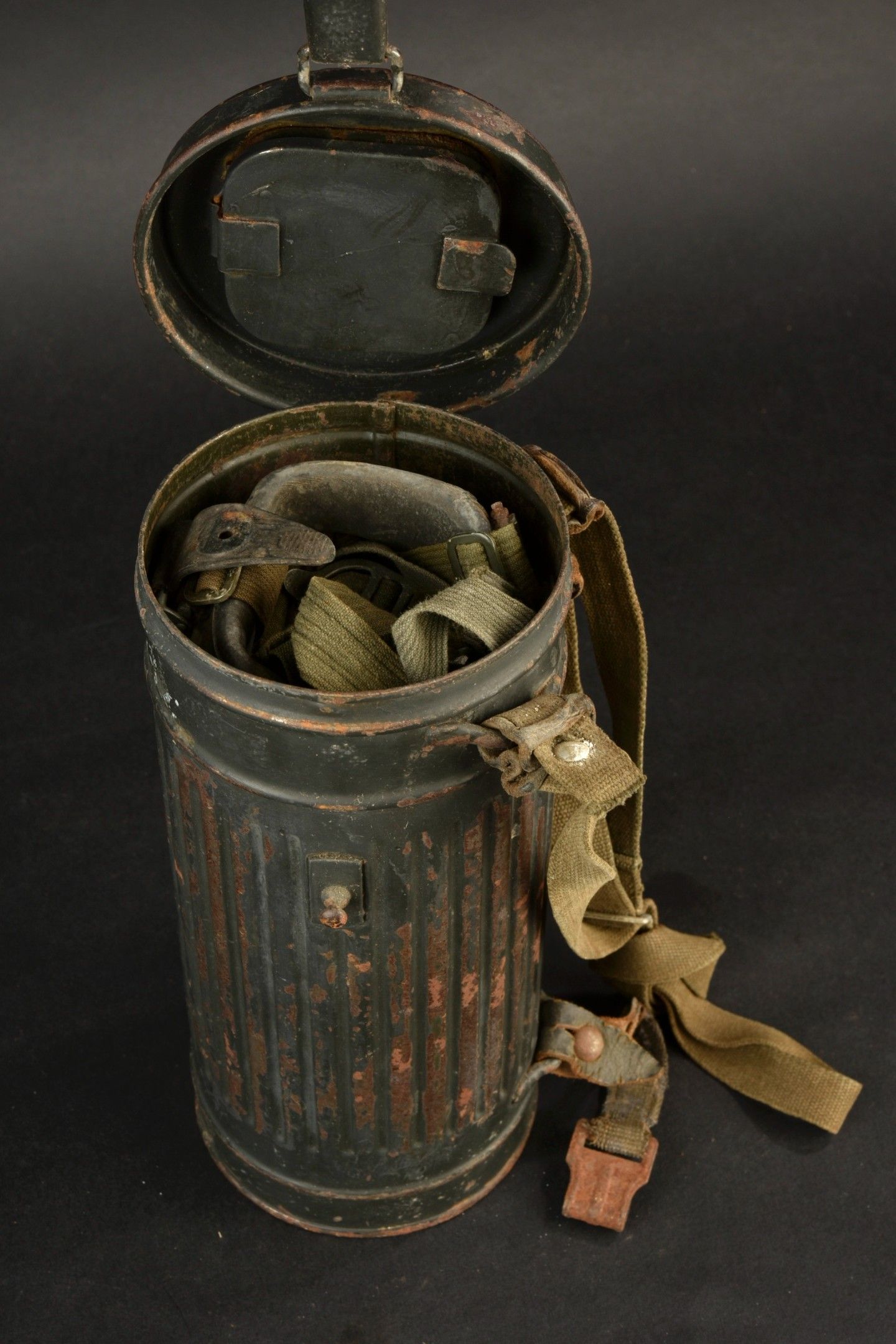 German anti-gas mask. Long case. 60% paintwork. All straps are present, but of a different model. Number 165 painted on side of case. Spare lenses present, as well as cloth and spider. Rubber mask, size 2, heavily moulded. Filter complete. All straps appear to be present. Some wear and patina. Condition II+. Lemarchand Normandie Collection. German gas mask set with long canister retaining 60% of its paint. All straps present though mismatched. Number 165 painted on the side of the canister. Spare lenses, cleaning cloth and spider insert included. Rubber mask, size 2, with mold traces. Complete filter. All straps apparently present. Some wear and patina visible. Condition II+. Lemarchand Normandie Collection.