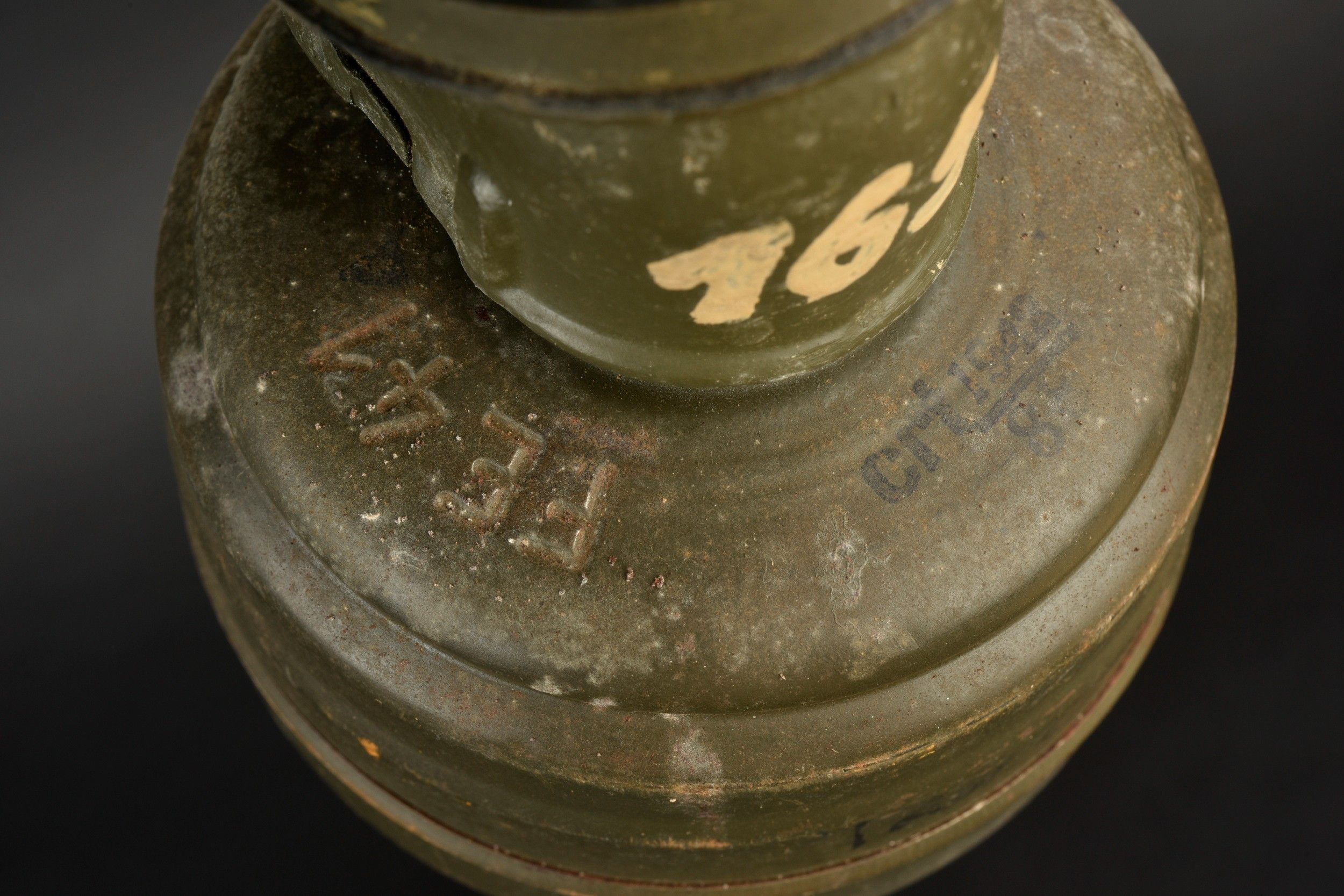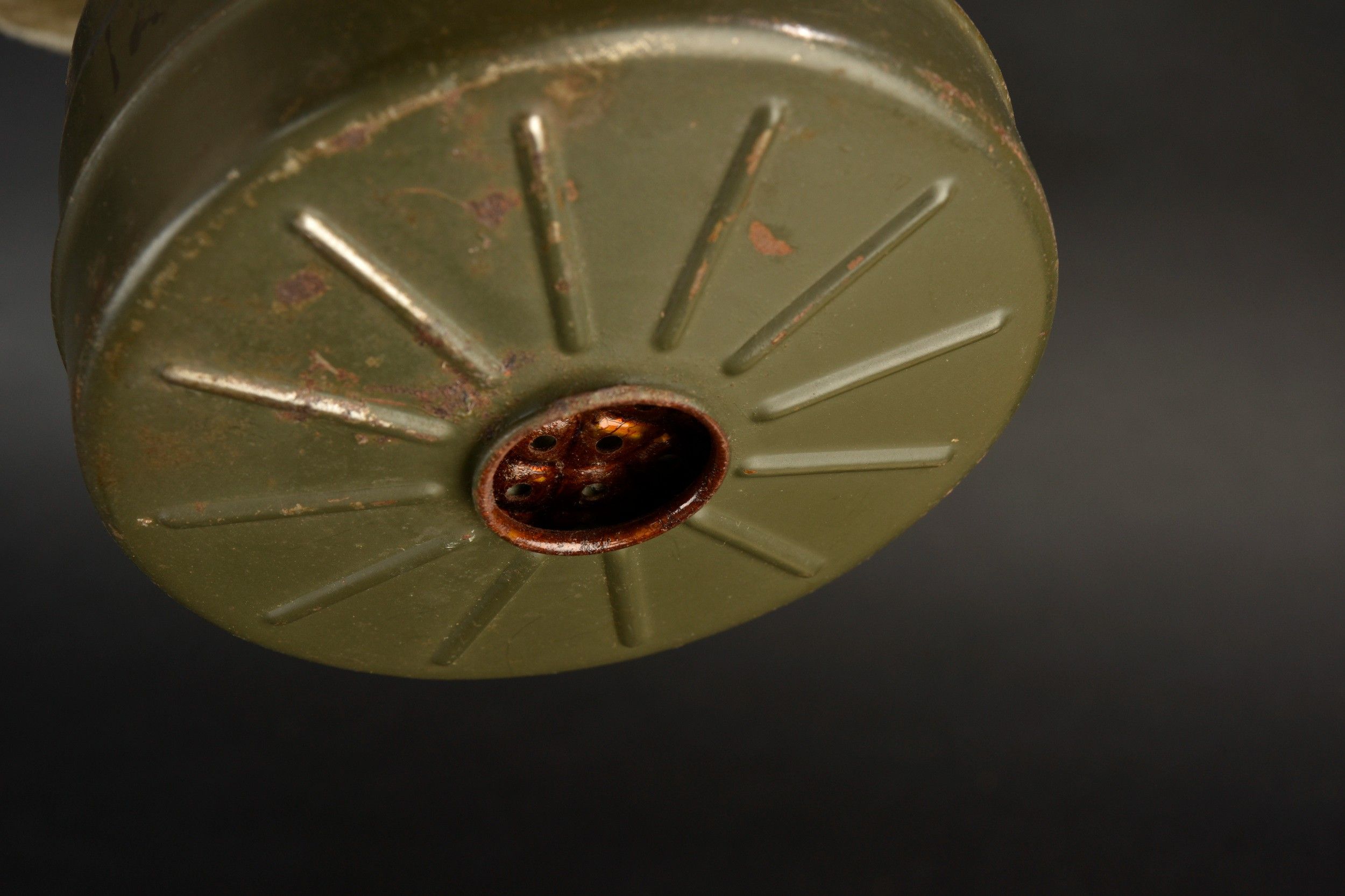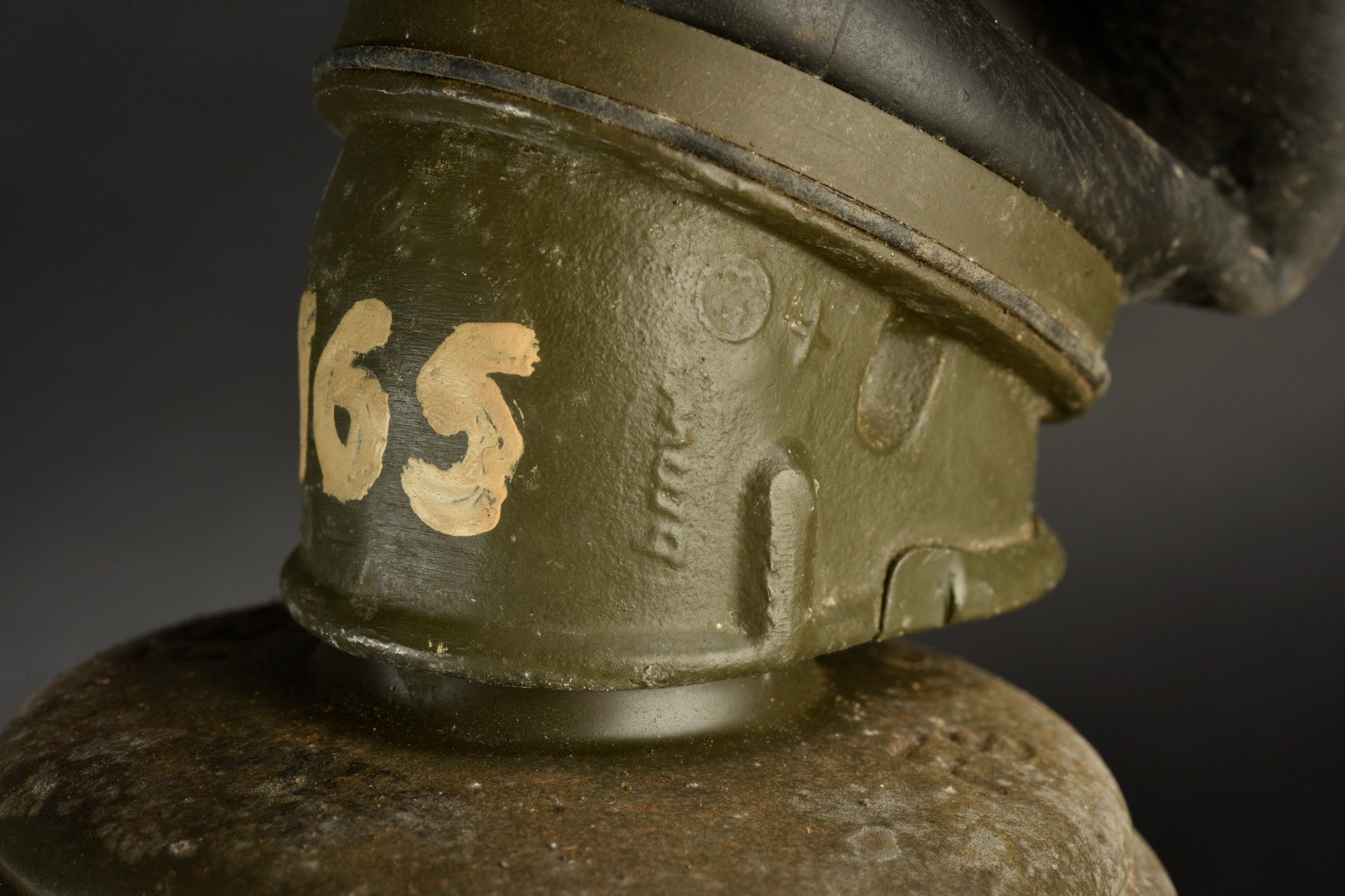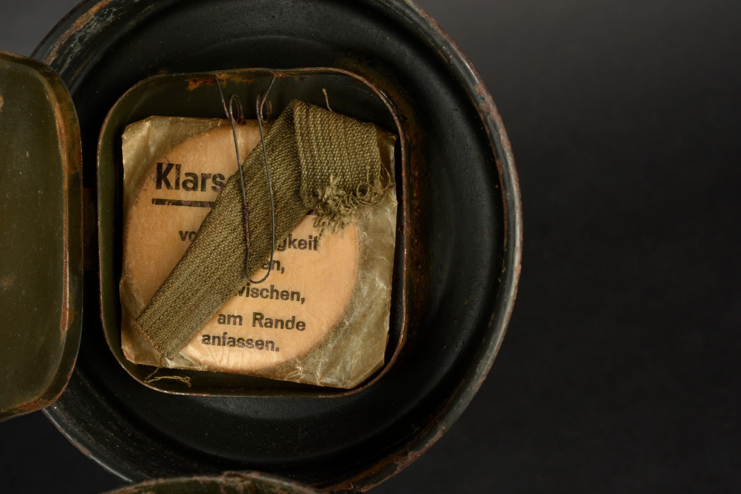 German anti-gas mask. Long case. 60% paintwork. All straps are present, but of a different model. Number 165 painted on side of case. Spare lenses present, as well as cloth and spider. Rubber mask, size 2, heavily moulded. Filter complete. All straps appear to be present. Some wear and patina. Condition II+. Lemarchand Normandie Collection. German gas mask set with long canister retaining 60% of its paint. All straps present though mismatched. Number 165 painted on the side of the canister. Spare lenses, cleaning cloth and spider insert included. Rubber mask, size 2, with mold traces. Complete filter. All straps apparently present. Some wear and patina visible. Condition II+. Lemarchand Normandie Collection.