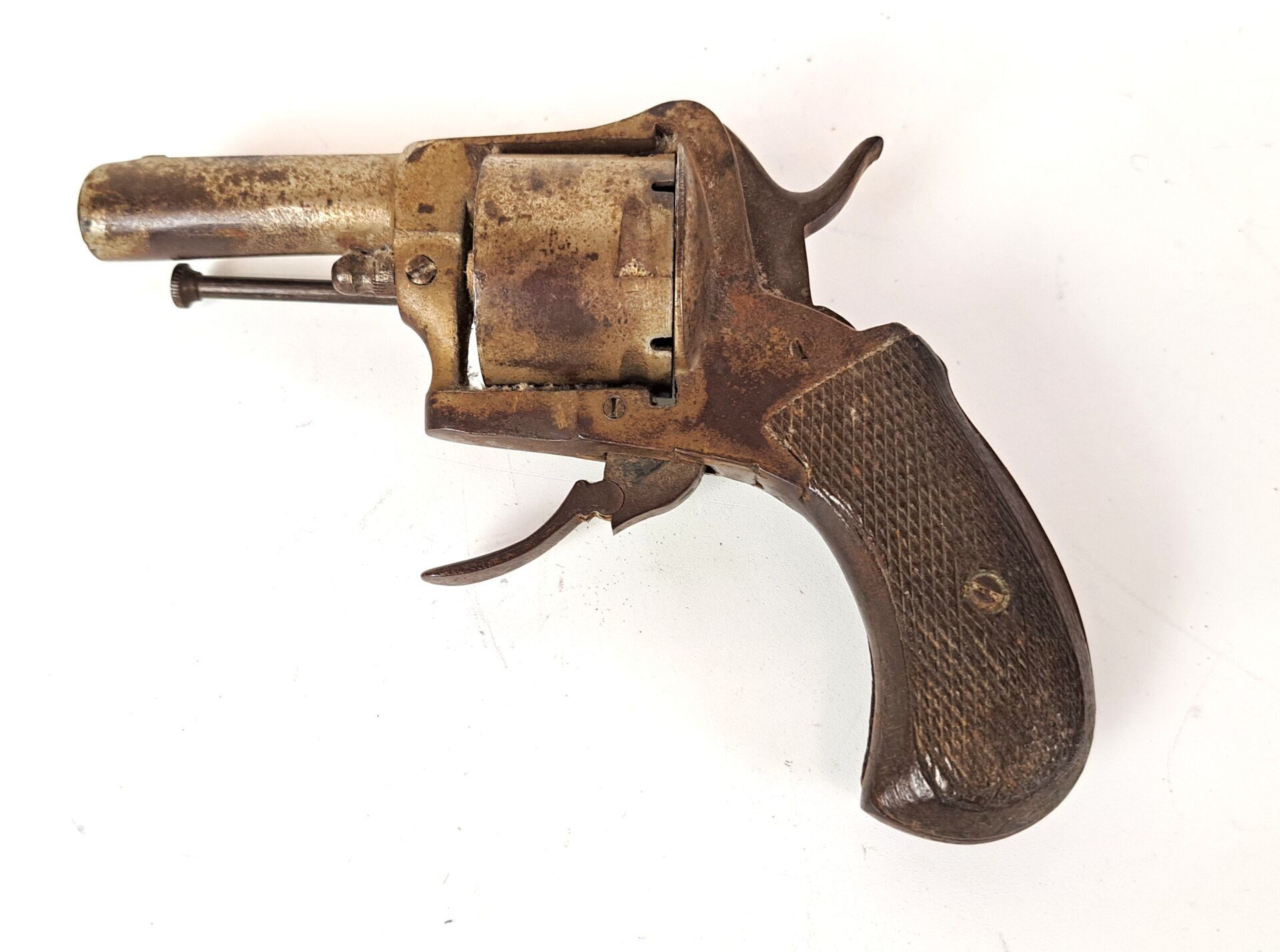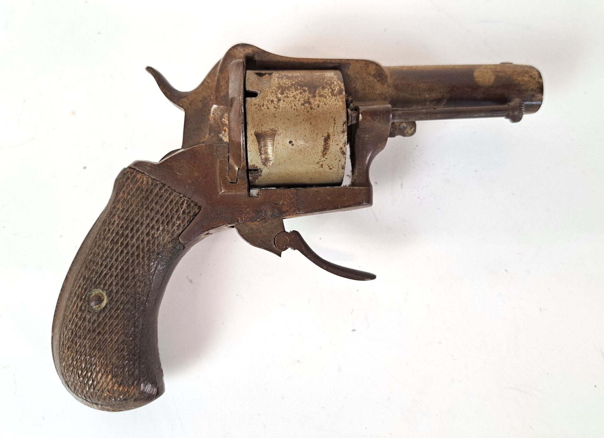 Curious bulldog pinfire revolver, closed frame, octagonal barrel, round barrel, 12 mm calibre with folding trigger pin, chequered walnut plate, functional mechanism, single and double action, Condition 2 category D