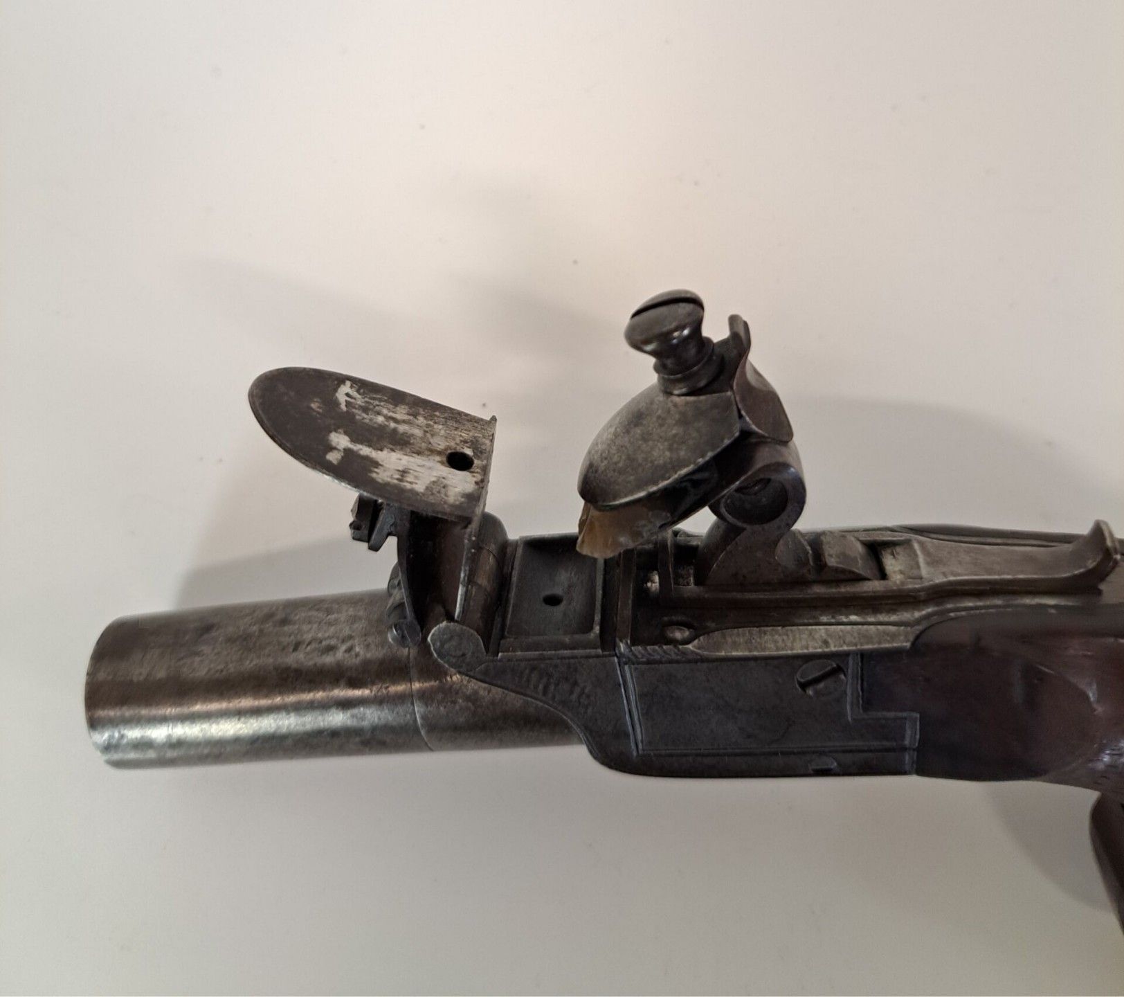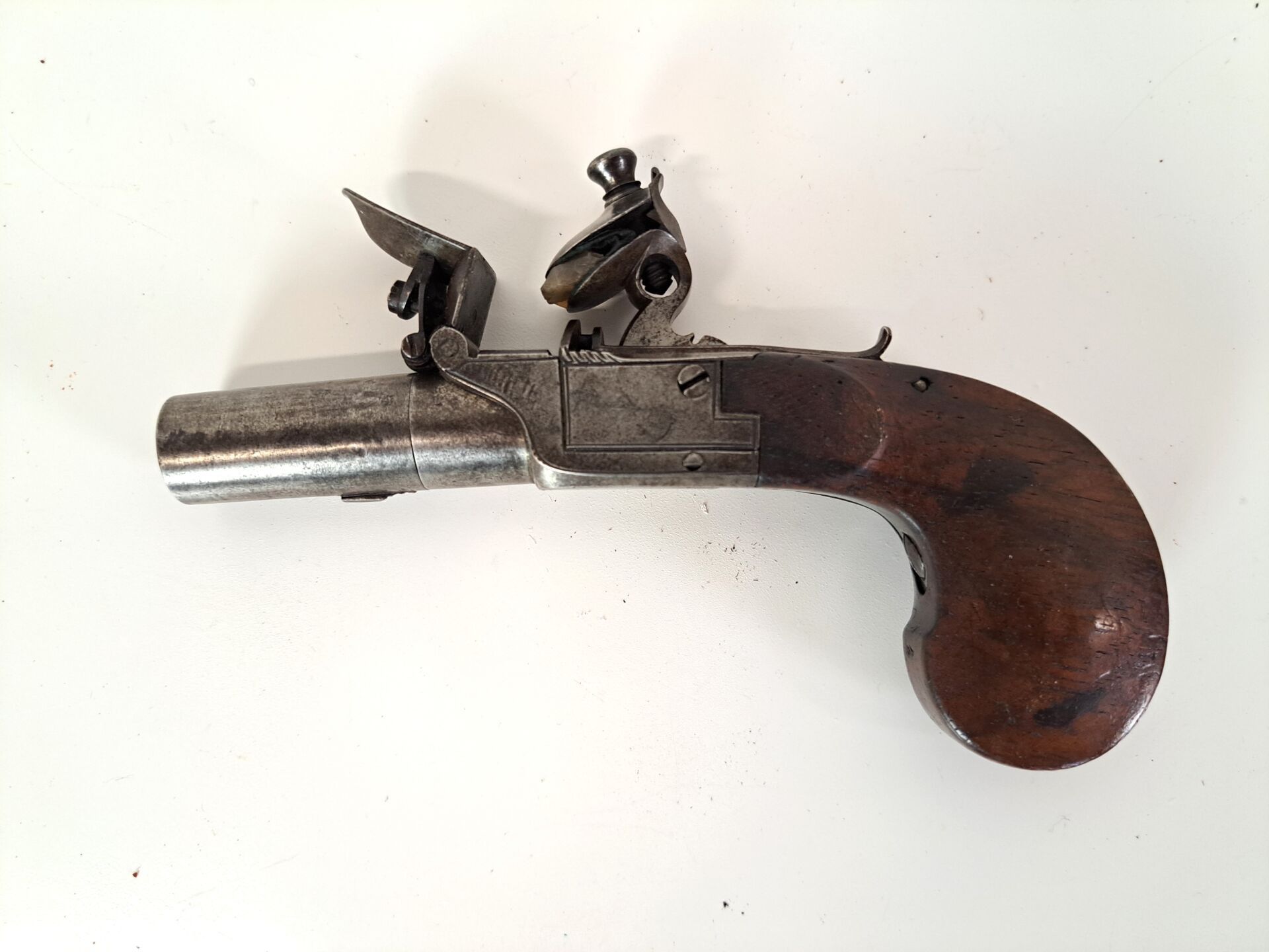 Attractive flintlock pocket pistol, round barrel with forced bullet, calibre 12.7 mm, steel box action, flat-spaced hammer, sliding safety blocking the hammer and battery in the closed position, retractable trigger, round frame with curved walnut side, silver thumb piece, overall length: 145 mm, Condition 1