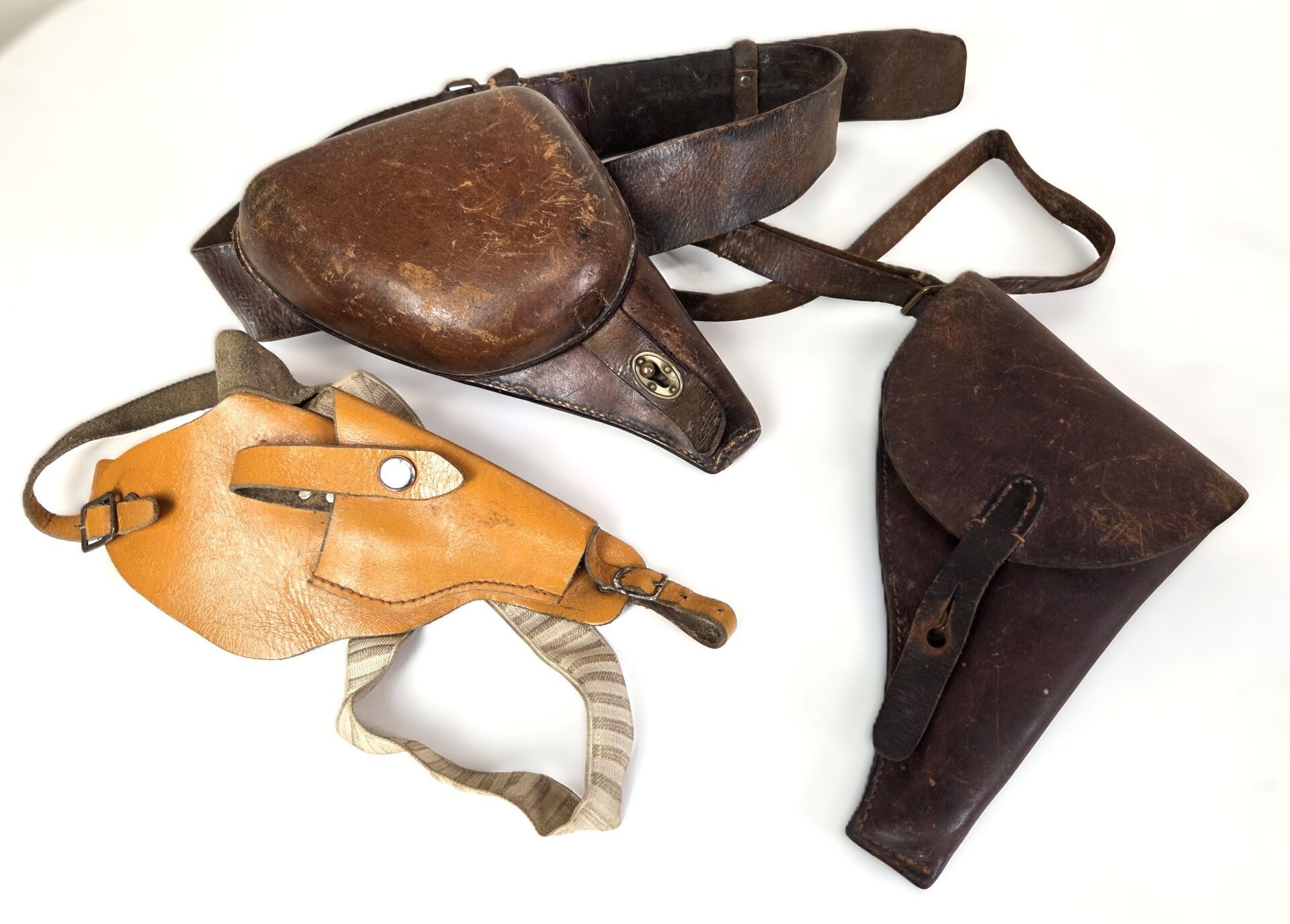Set of two tan leather holsters for French regulation revolvers, including a simplified holster for a French 92 or Spanish 92 revolver and a holster for a ham-type revolver, the cartridge compartments being designed for 12 mm 1873 but the rear of the holster does not have the protrusion intended to accommodate the extractor, with a tan leather double-buckle belt buckle. There is also a shoulder holster for a 7.65 pistol made in the 1960s.