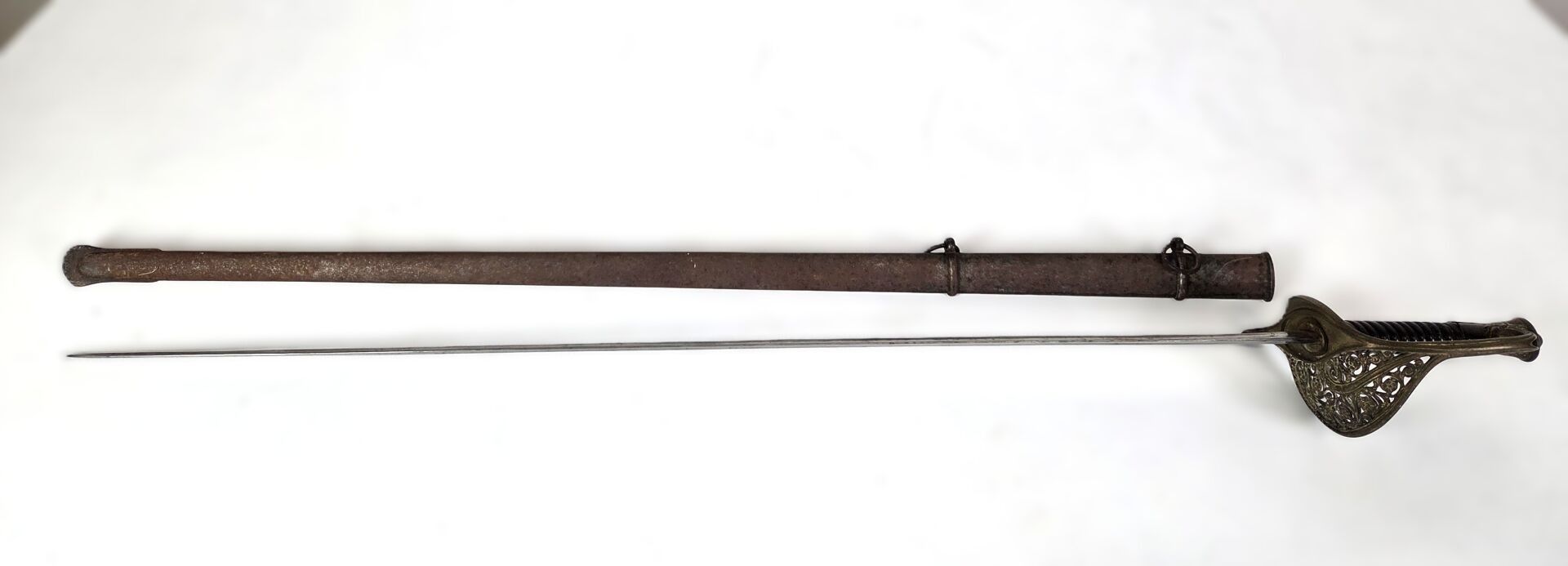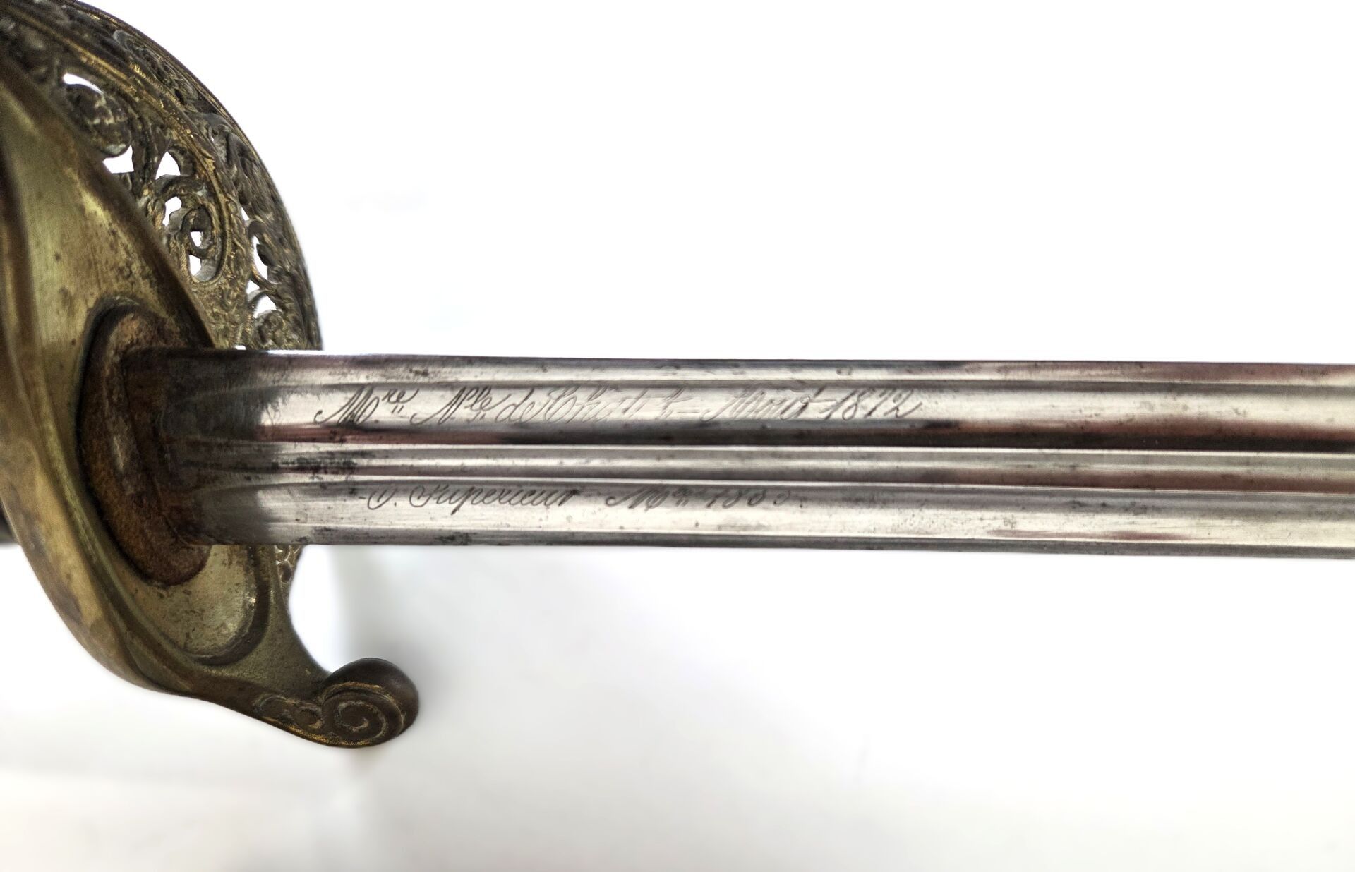Senior officer's sabre model 1855 made at the national factory in Châtellerault in August 1872. Straight symmetrical double-edged blade with two grooves and central groove with prominent edge. The markings are legible on two lines in the grooves on the left side of the blade. Beautiful chased gilt bronze mounting. Short-tailed cap, guard branch subdividing in the middle into two S-shaped arched strands lost in the middle of the open cuts in the guard plate. Quillon arched forward, horn fuse lacking watermark, in its steel scabbard with two bracelets,