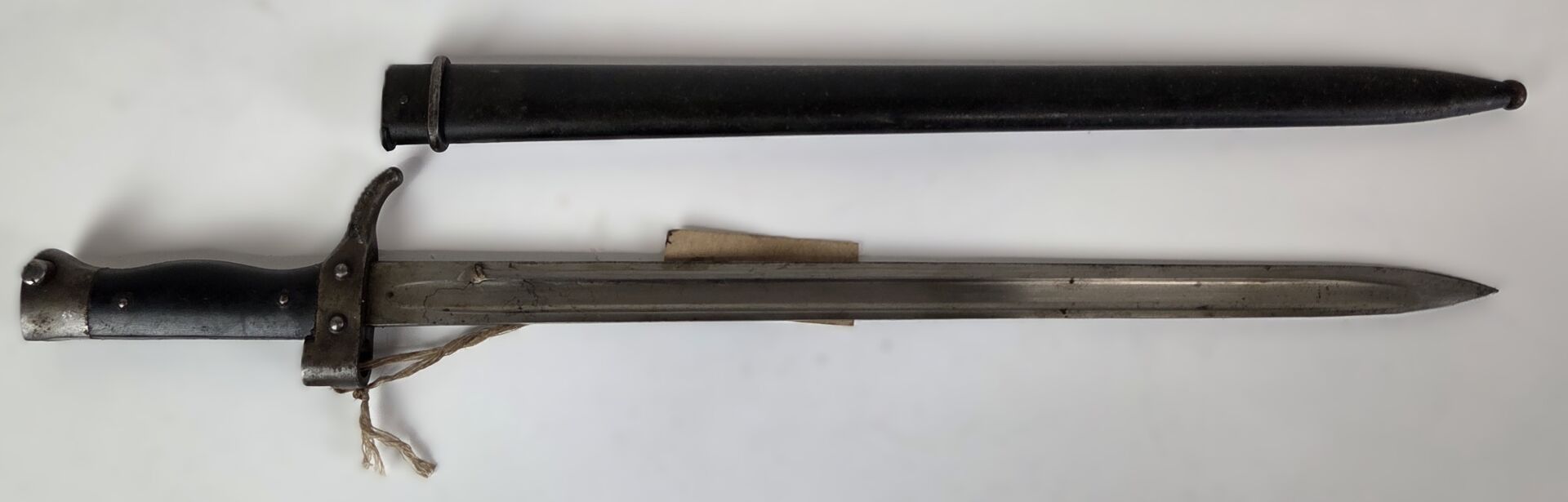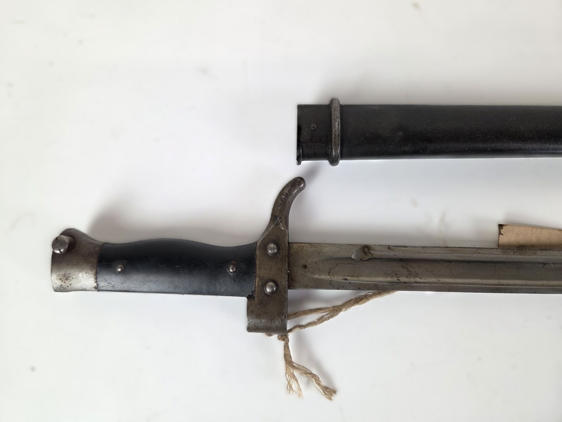 French regulation bayonet for snap hook 1892 version with cut quillon, black bakelite plate, white polished blade, in its bronzed sheet steel scabbard, scabbard without number.