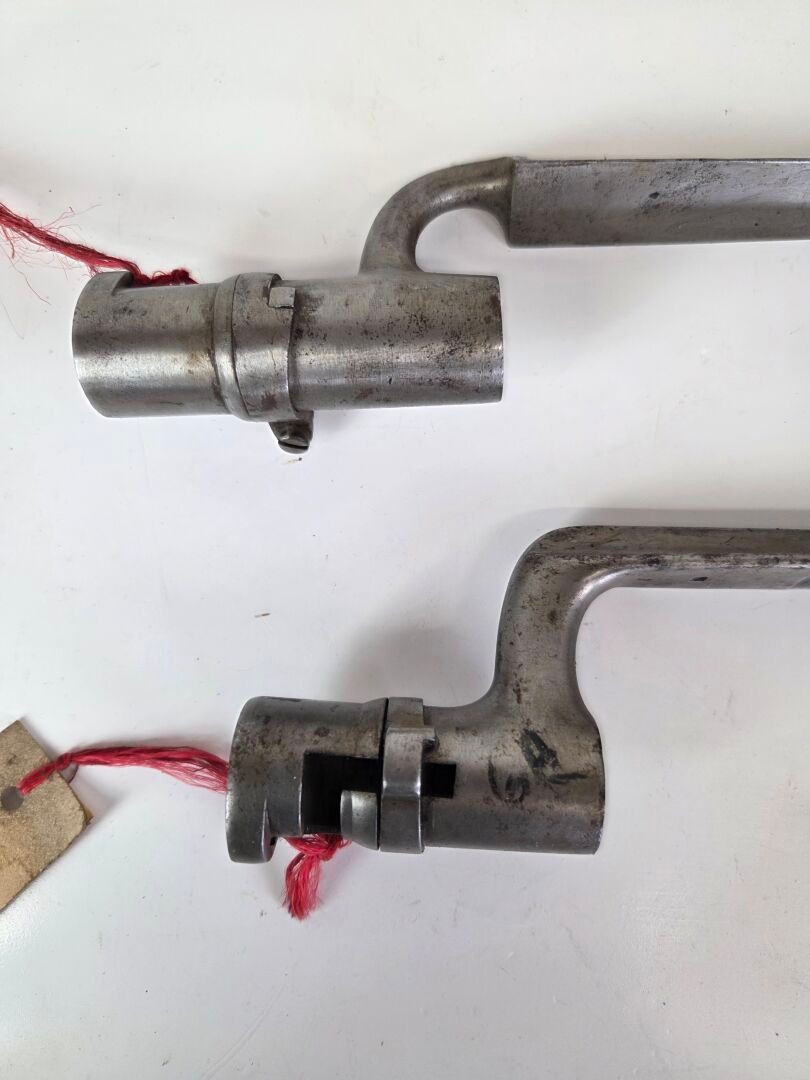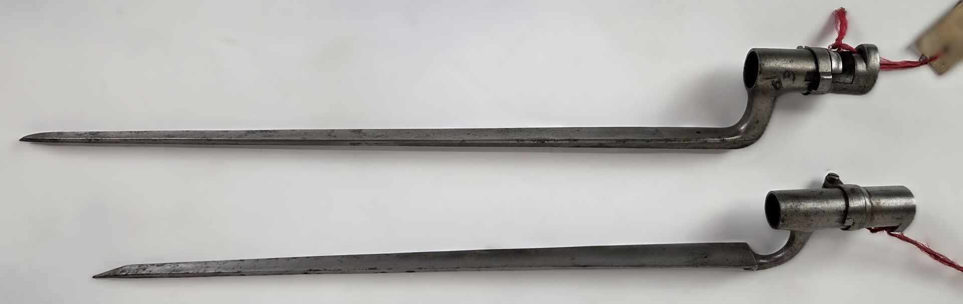 Lot of two socket bayonets, there is a British bayonet with a strong triangular blade with three hollow sides and socket with ferrule, there is also a French regulation socket bayonet for 1847 rifle, no scabbard.