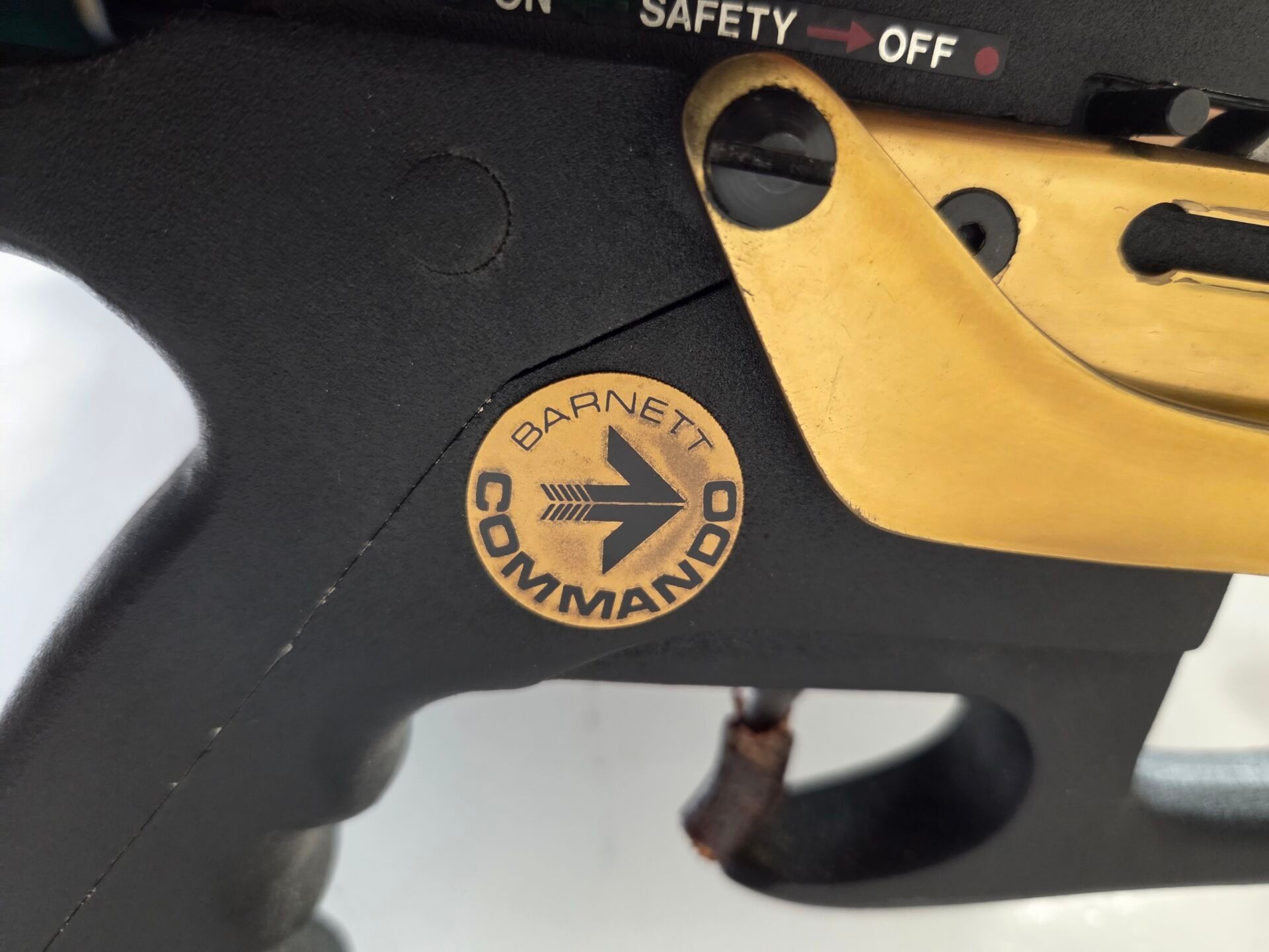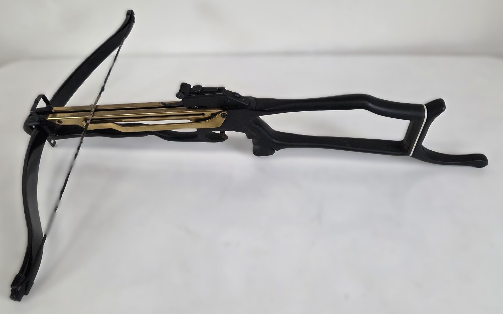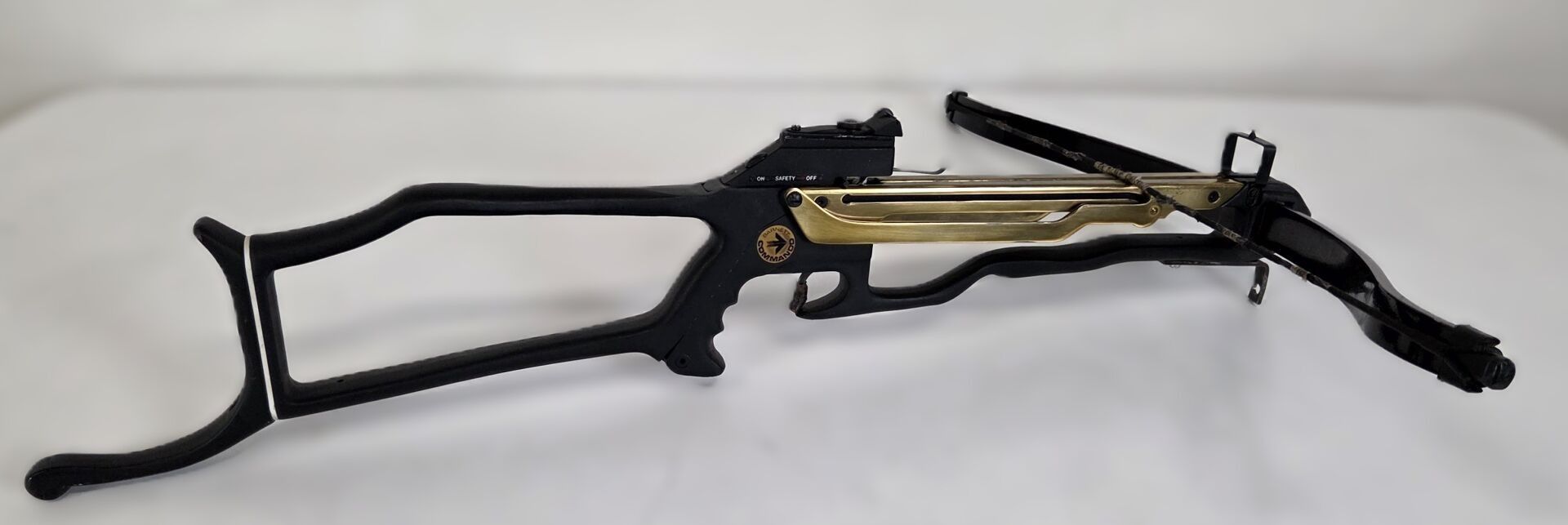 Barnett Commando model crossbow, skeleton stock, toggle action, fibre bow, brass leaf bolt guide.