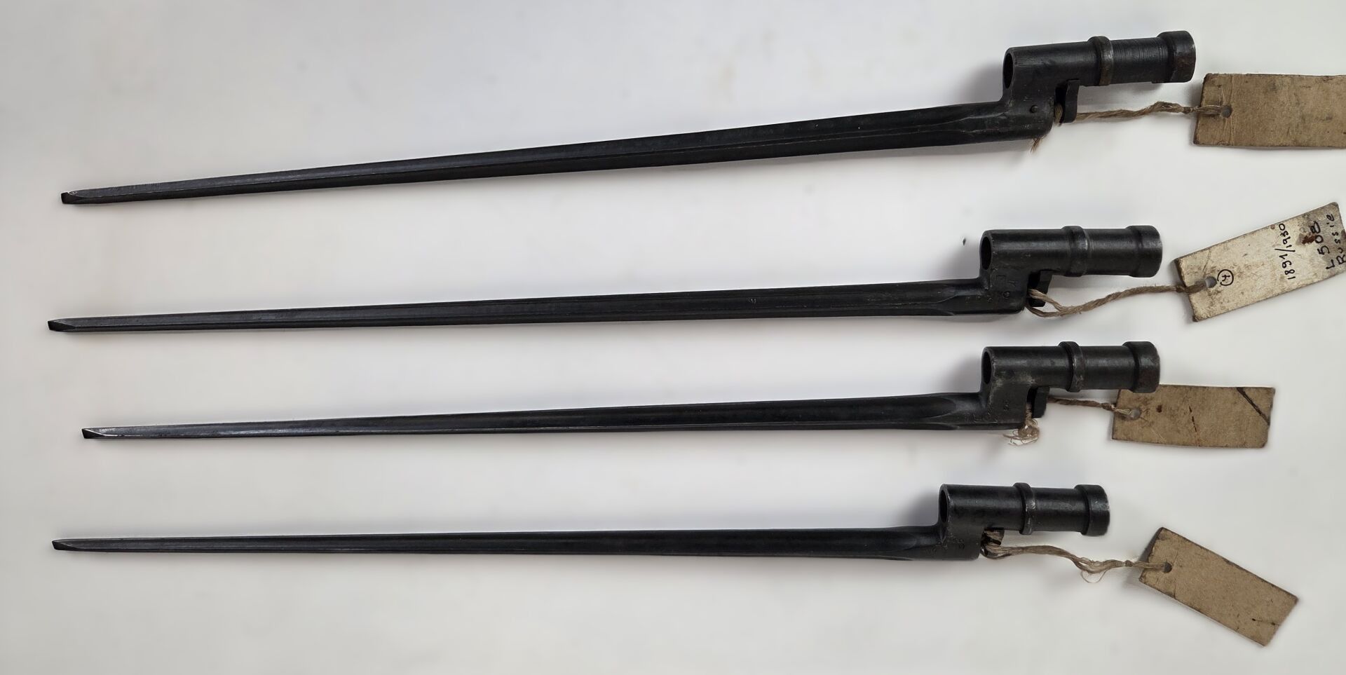 A set of four model 1891/30 bayonets for Mosine-Nagant rifles, cruciform blades, screwdriver tips, original tanning.