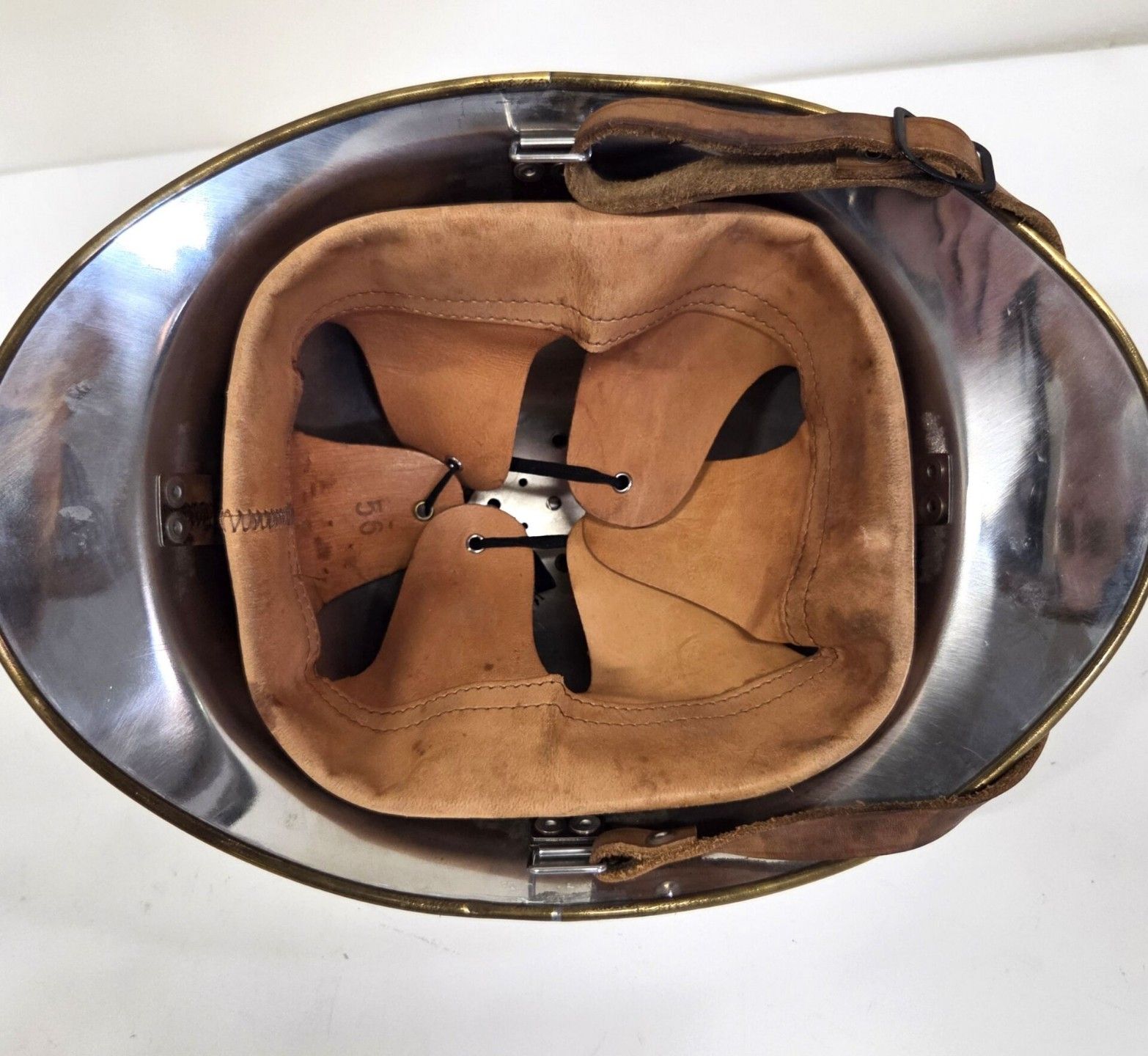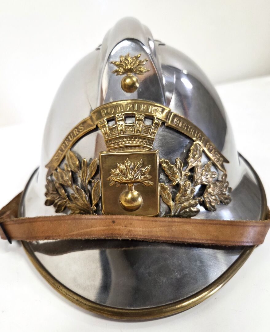 Fireman's bomb helmet in the style of an Adrian helmet in stamped and nickel-plated sheet steel, prominently signed, front of the signed with grenade, peripheral brass snap ring running along the edge of the visor and the nape of the neck. Brass plaque of the Agen district fire brigade. Complete with chinstrap and leather liner.