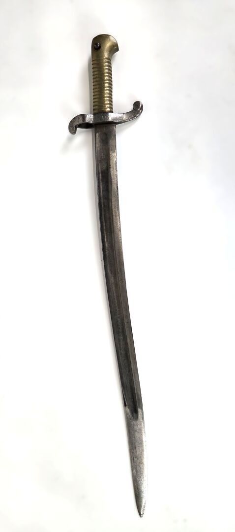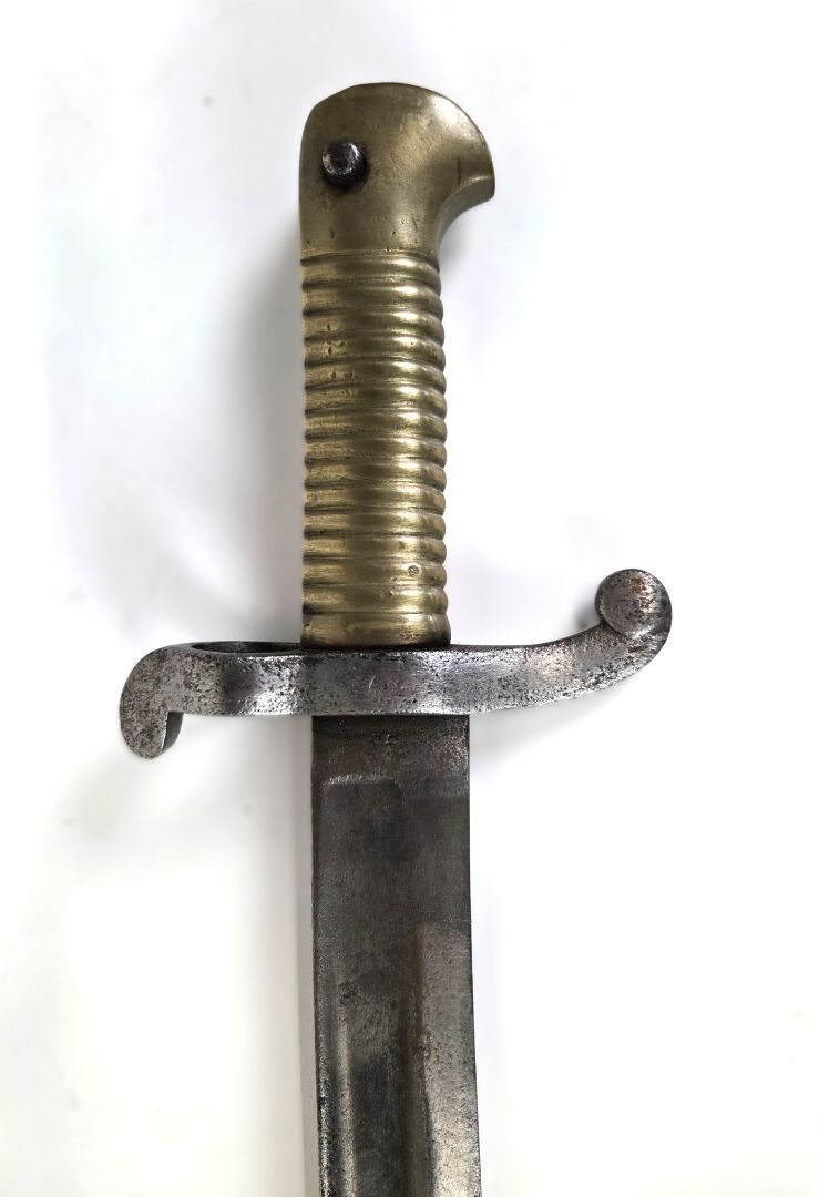 French regulation bayonet model 1842, Yatagan blade, unmarked back, slight re-sharpening to counter-edge, steel cruiser with 23 mm bushing, cast bronze fuse, overall length 690 mm. No scabbard. Condition 1-