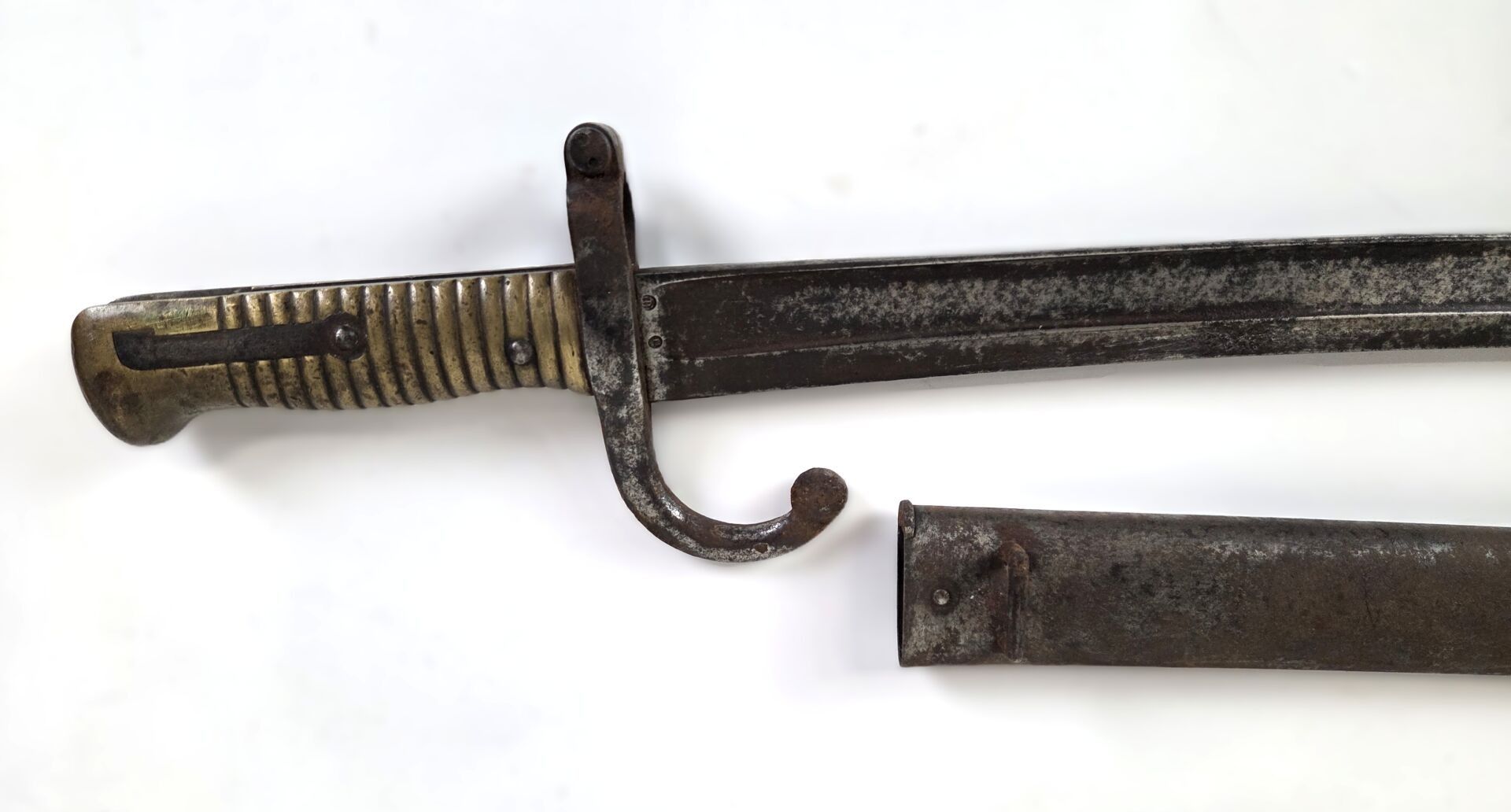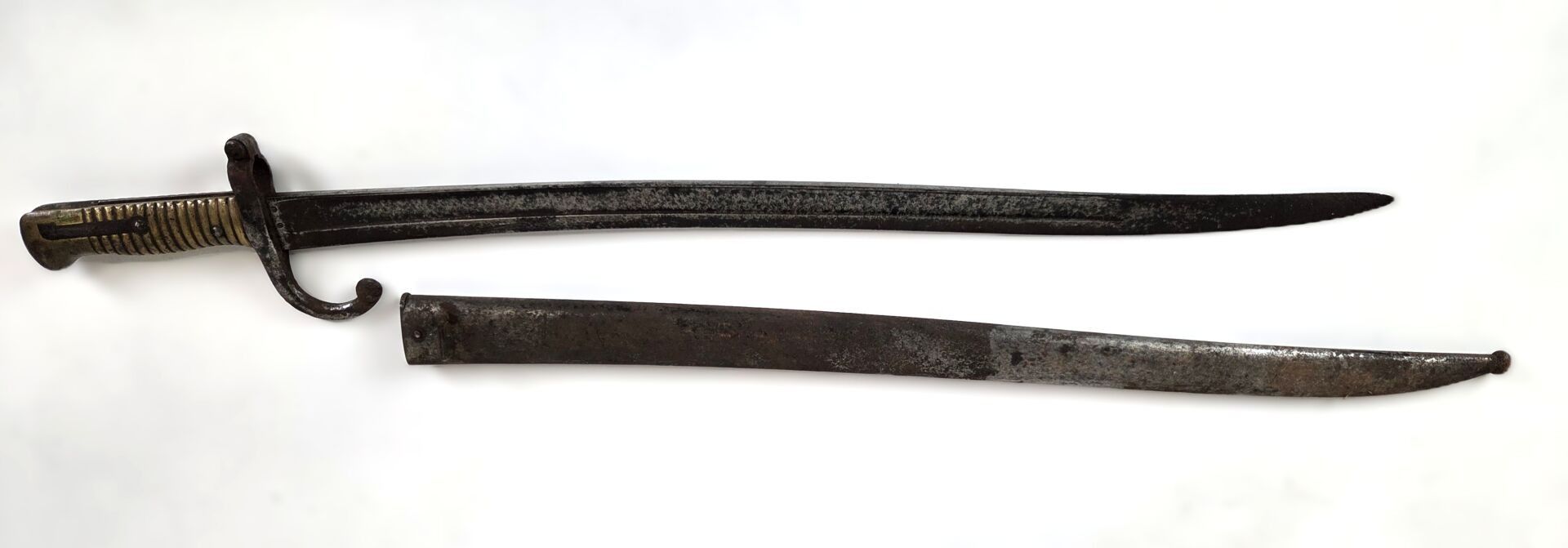 French regulation bayonet for Chassepot infantry rifle model 1866, Yatagan blade, marked on the back manufacture d'armes de Saint-Etienne mars 1873. Bronze fuse, in a scabbard not numbered.