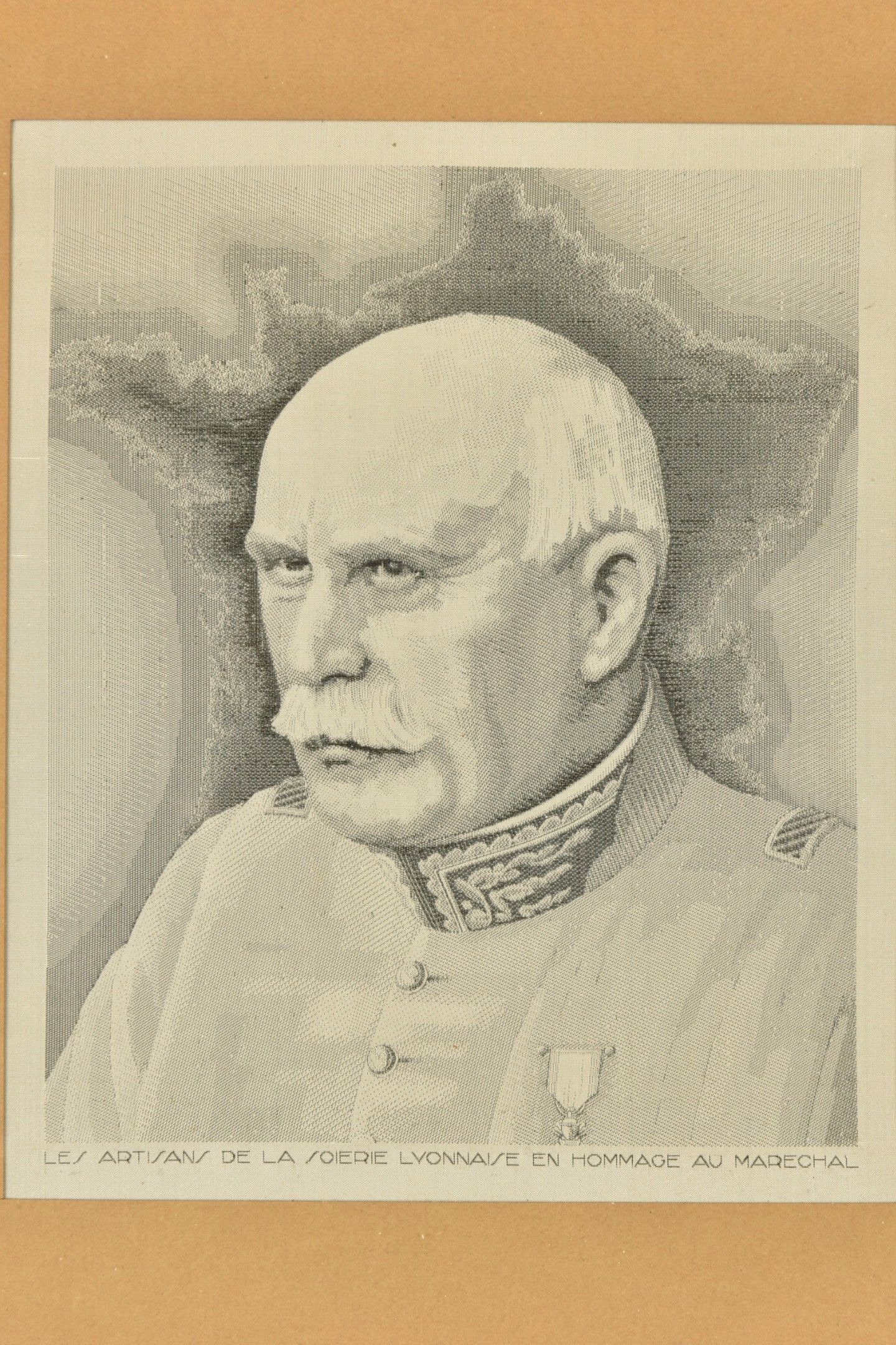 Framed portrait in woven silk of Marshal Pétain, signed by the artisans of the Lyonnaise silk industry in homage to the Marshal. Size of frame 36x32cm. Framed woven silk portrait of Marshal Pétain signed by the Lyon silk artisans in tribute to the Marshal. Frame dimensions 36 × 32 cm.