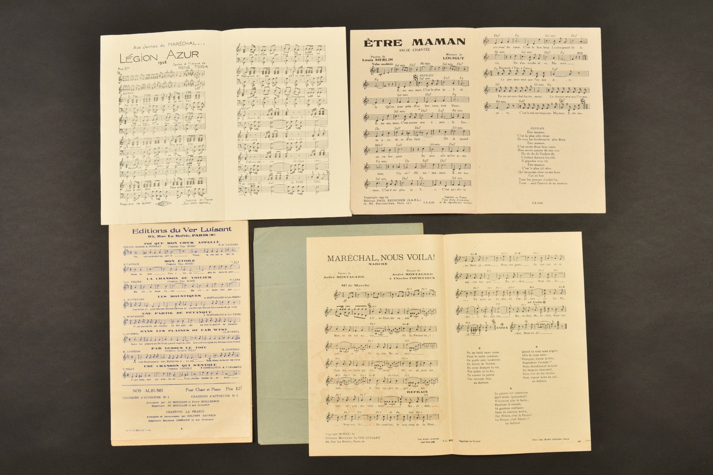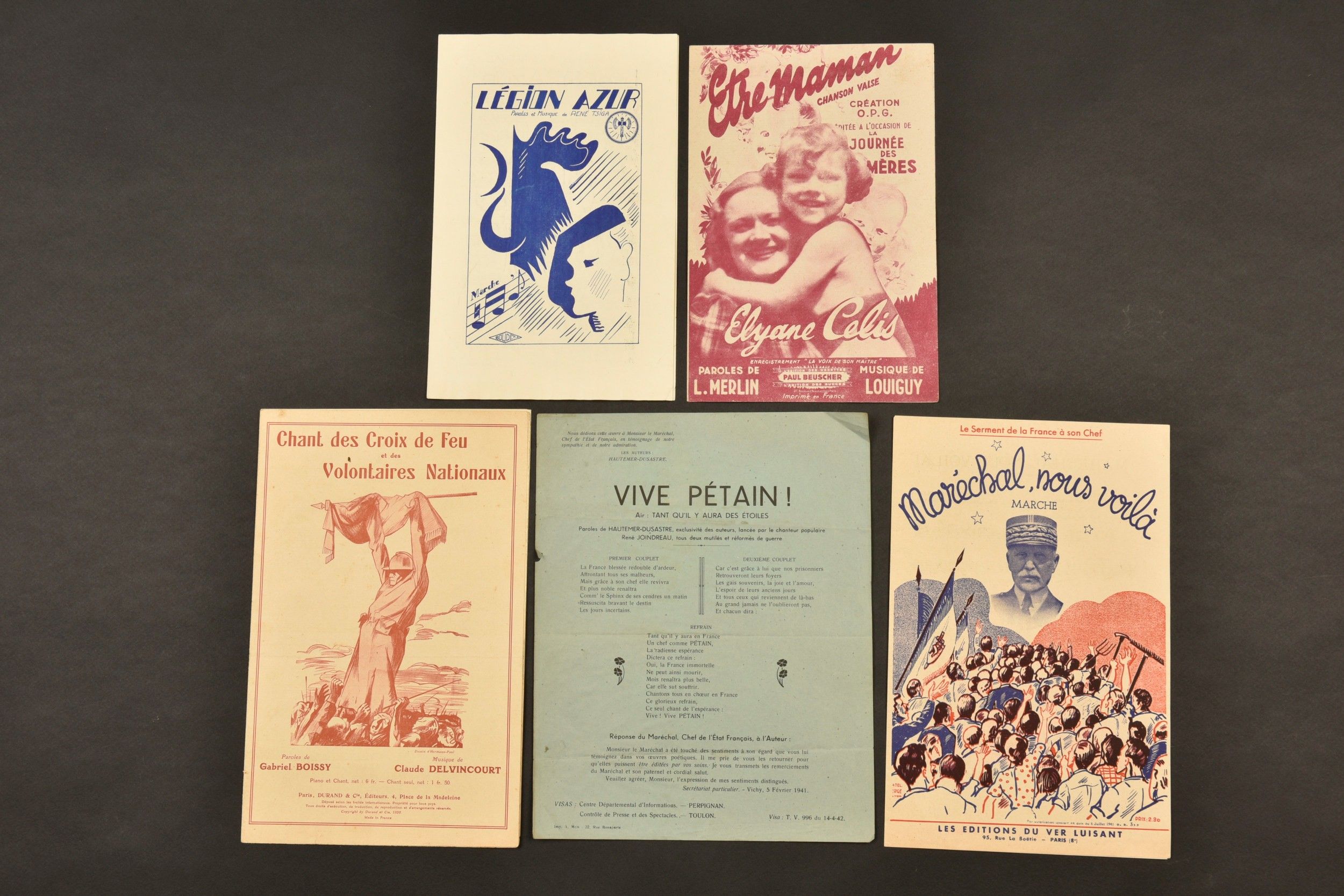 A set of sheet music including Maréchal nous voila, Légion Azur, Être maman, Vive Pétain, as well as songs of the Croix de Feu and National Volunteers, and La Marseillaise. A set of sheet music including Maréchal nous voila, Légion Azur, Être maman, Vive Pétain, as well as songs of the Croix de Feu and National Volunteers, and La Marseillaise.