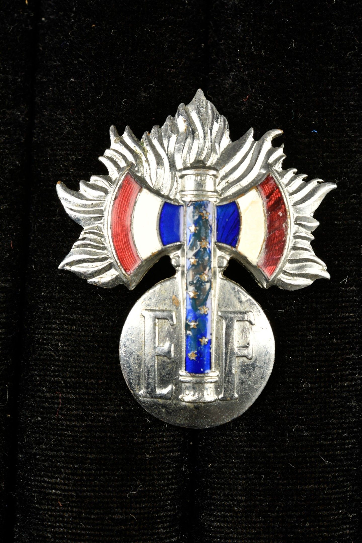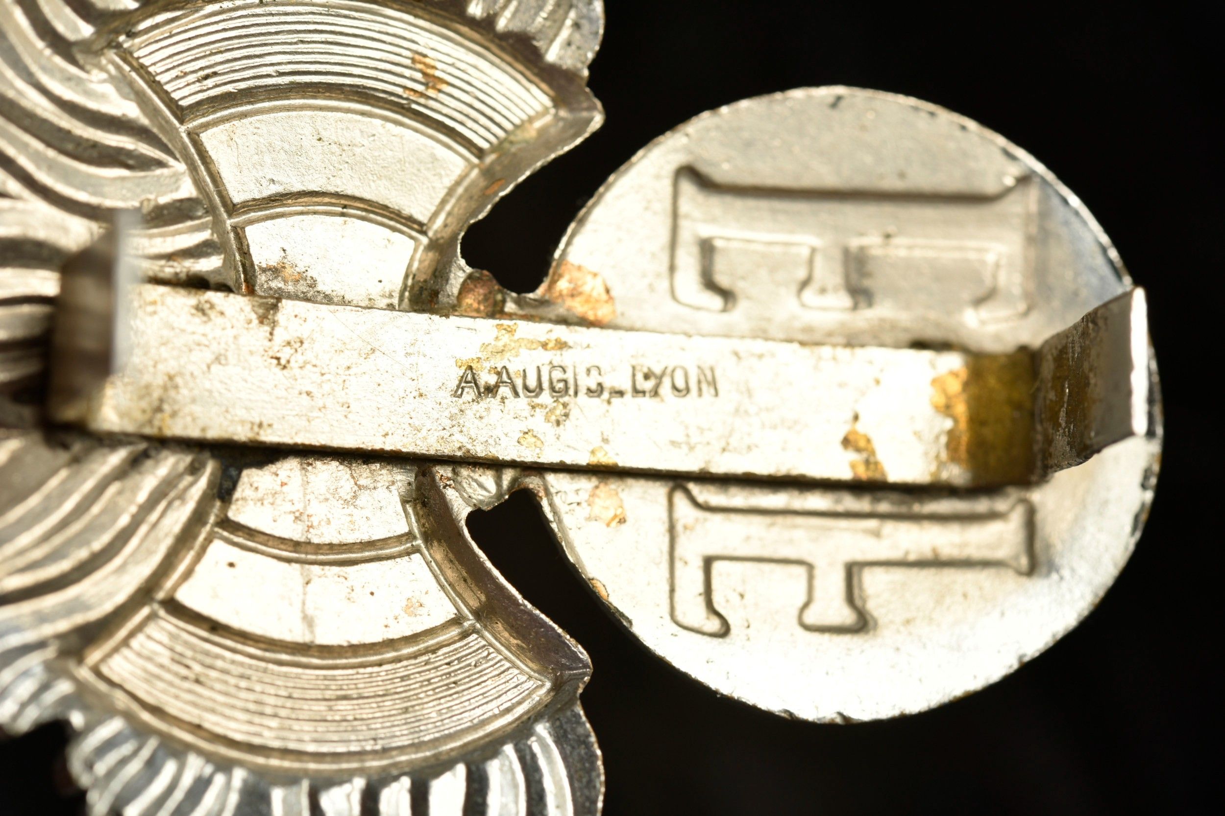 Head of State's Personal Guard helmet badge. Enamelled metal badge, intended to be mounted on the 1933 model motorbike helmets of the Marshal's Personal Guard. A grenade bearing the letters E-F surmounted by an enamelled francisque. A few chips of enamel in the baton, repaired later, as well as in the red and white of one of the axes. Original lanyard with manufacturer's markings A.AUGIS LYON. Helmet Badge Chief of State's Personal Guard Enameled metal badge intended for mounting on 1933-model motorbike helmets of the Marshal's Personal Guard grenade bearing the letters EF topped with an enameled francisque some enamel chips on the staff repaired later and also on the red and white colours of one of the axes original mounting attachment marked A AUGIS LYON
