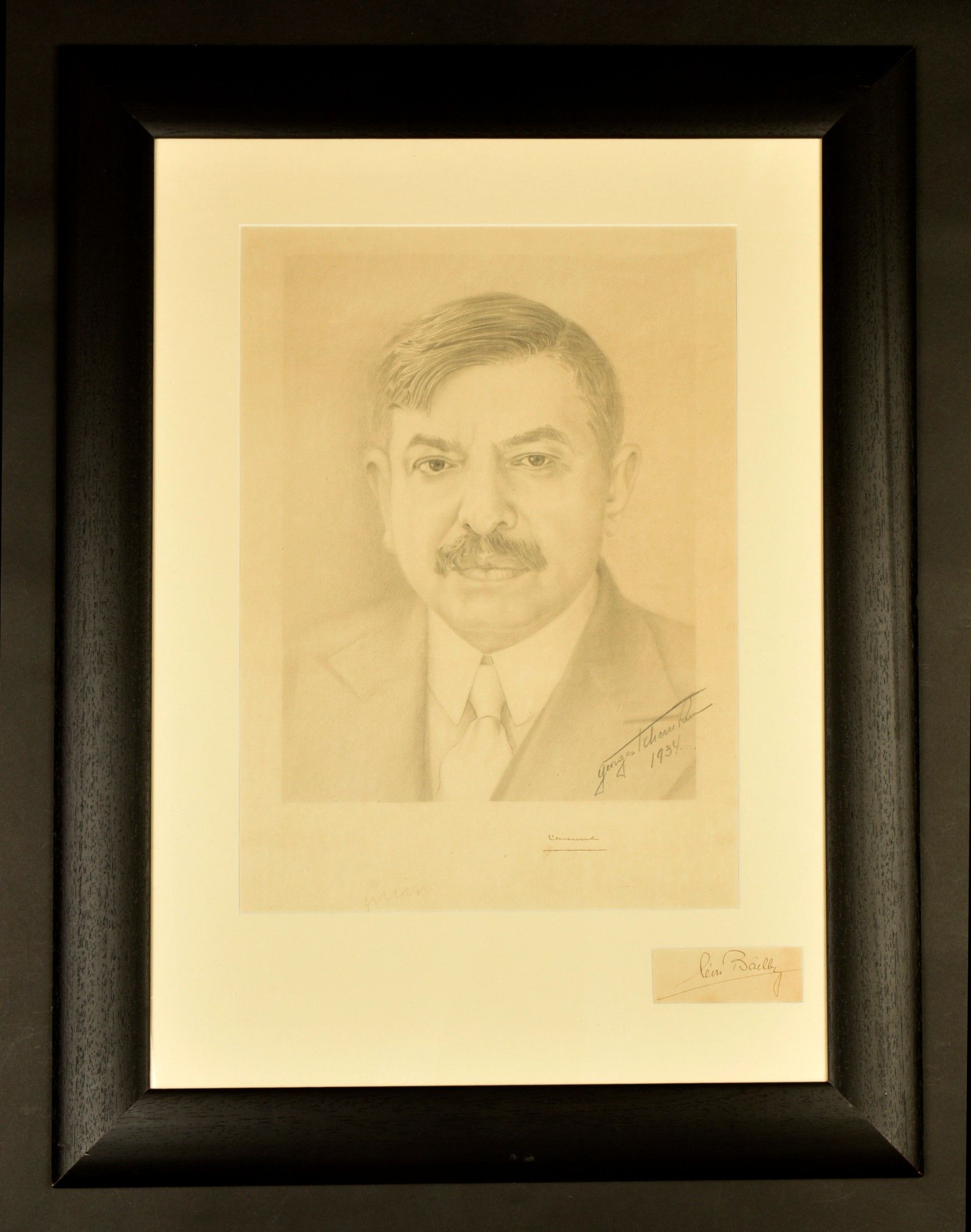Large charcoal portrait of Pierre LAVAL, signed George CHERU RIEU 1934. The portrait bears the autographs of Pierre LAVAL and Léon BAILBY (journalist and holder of the Order of the Francisque). Size 63x82cm. Large charcoal portrait of Pierre Laval, signed George Cheru Rieu, dated 1934. The portrait includes the autographs of Pierre Laval and Léon Bailby (journalist and recipient of the Order of the Francisque). Dimensions 63 × 82 cm.