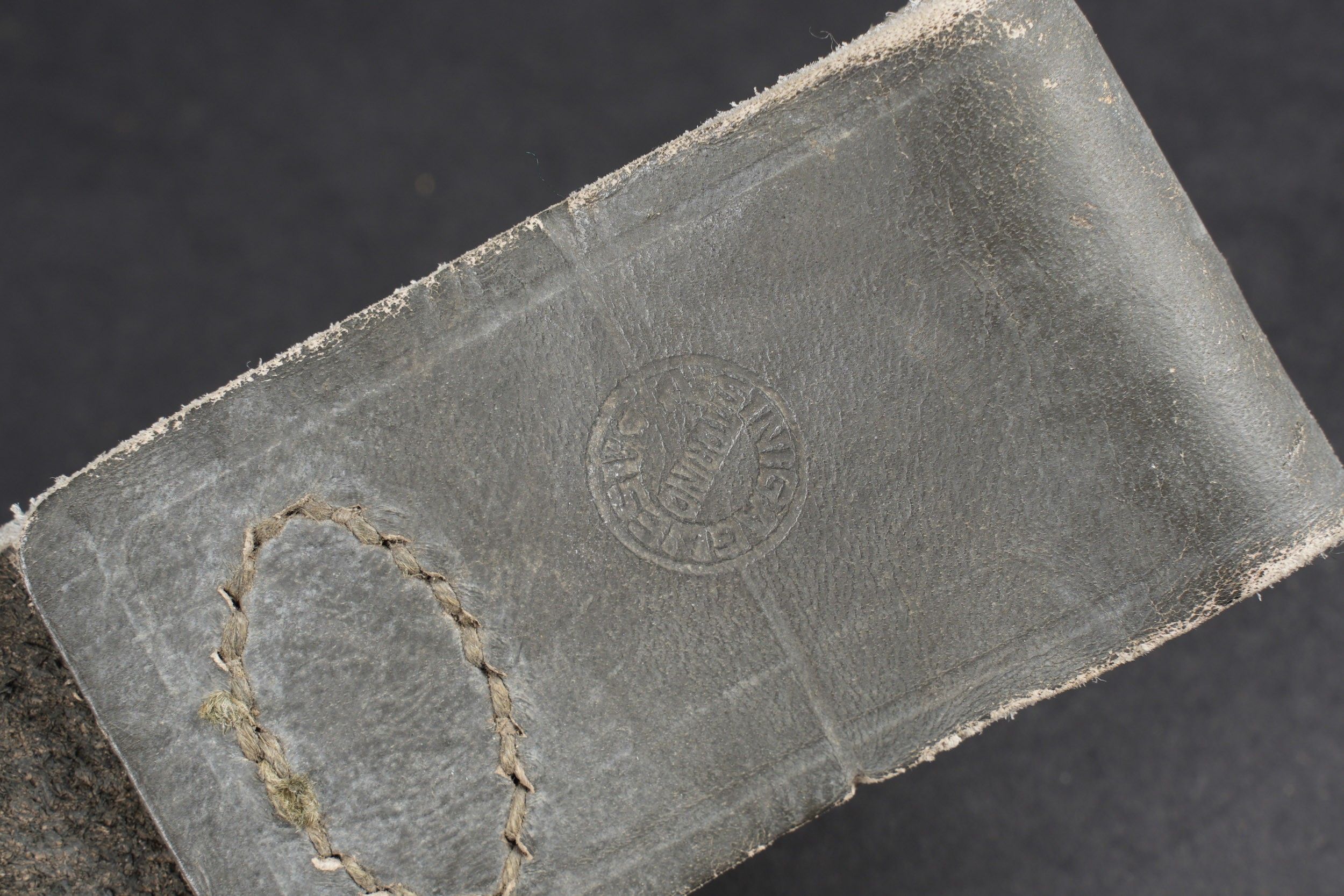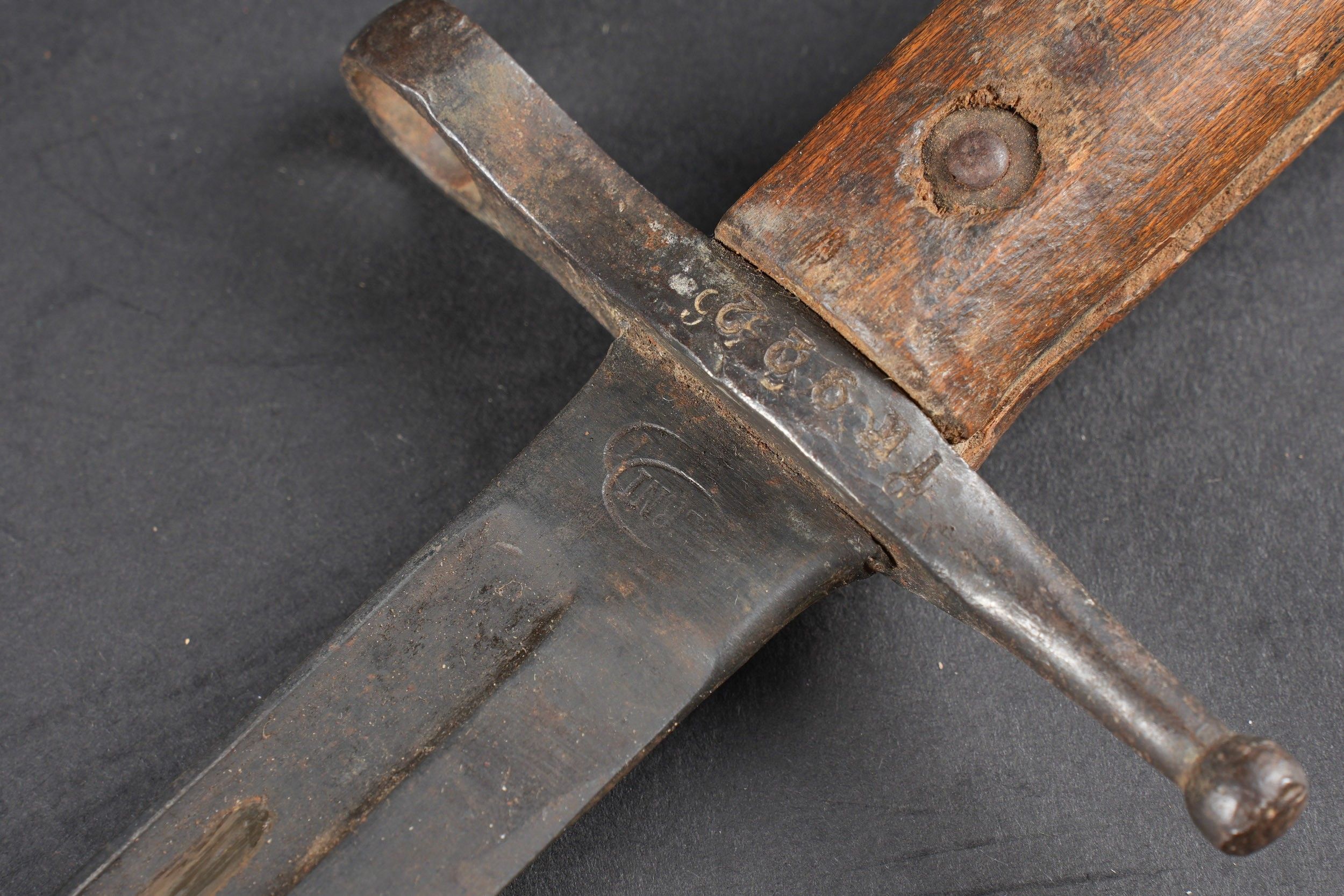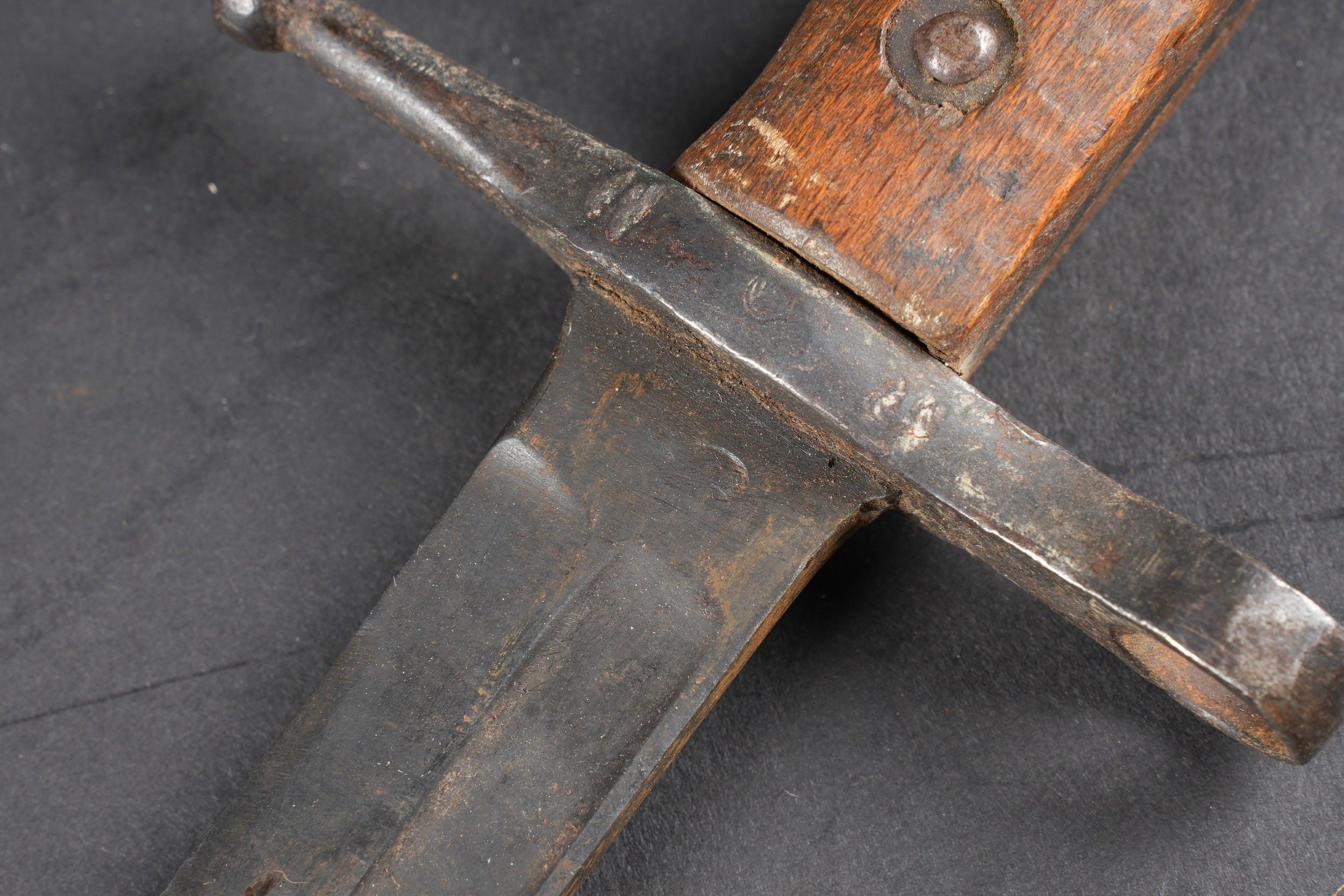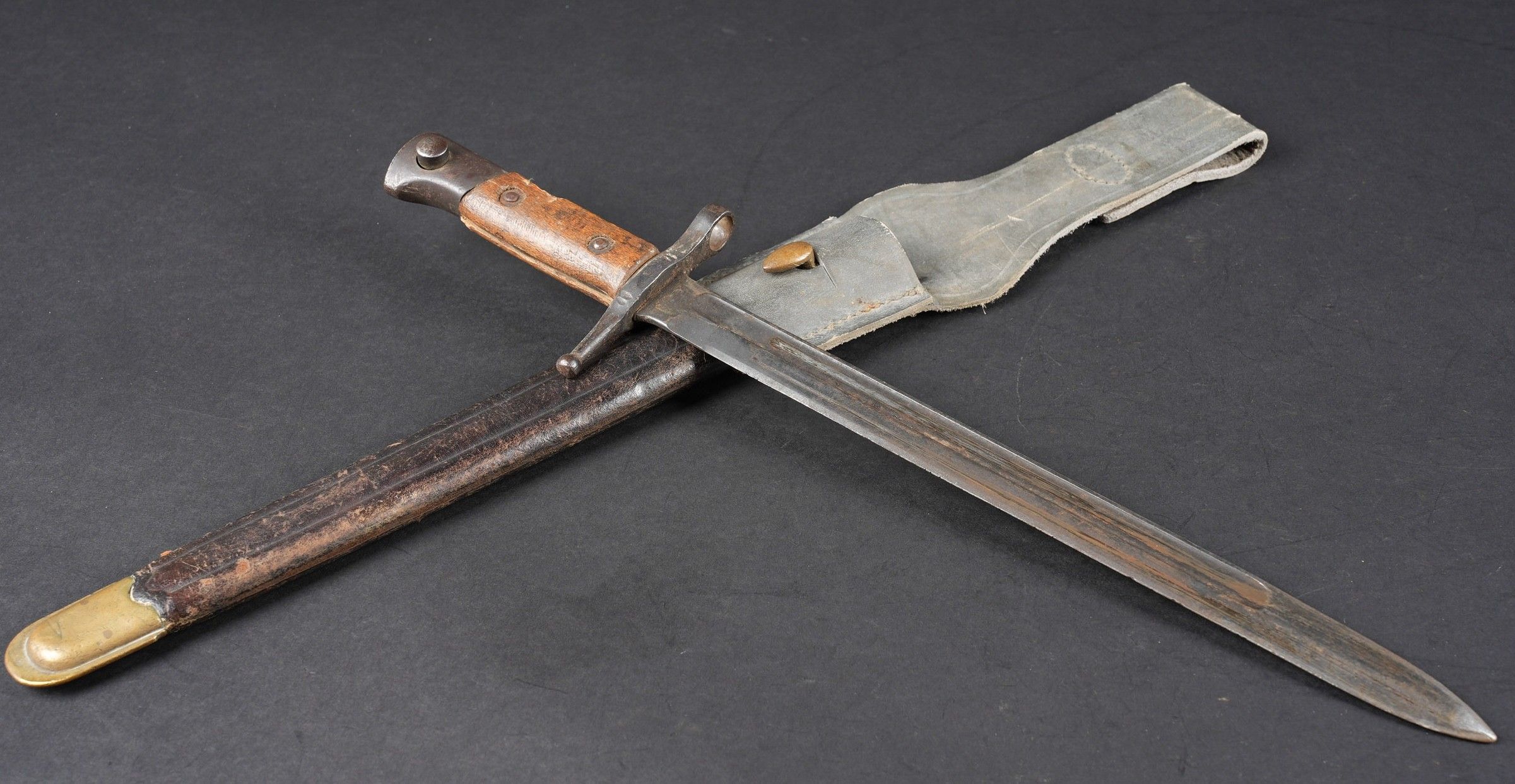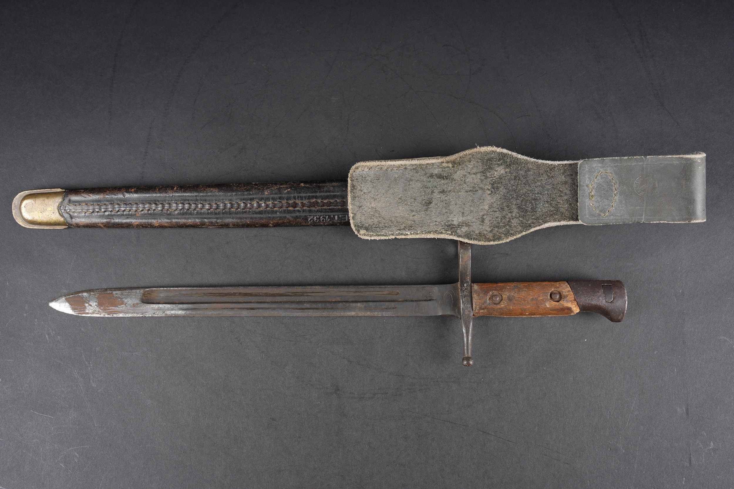 Italian bayonet. Metal fittings in good condition. Wooden plates. Beautiful blade in 80% original colour. Blade and guard markings illegible. Complete leather and brass scabbard. Leather gusset in grio verde colour. Markings illegible. Some wear and patina. Condition II+. Italian Bayonet Metal fittings in good condition. Wooden grips. Blade retains about 80% of its original finish. Blade and guard markings illegible. Complete leather and brass scabbard. Greenish-brown leather frog. Markings illegible. Some wear and patina noted. Condition II+.