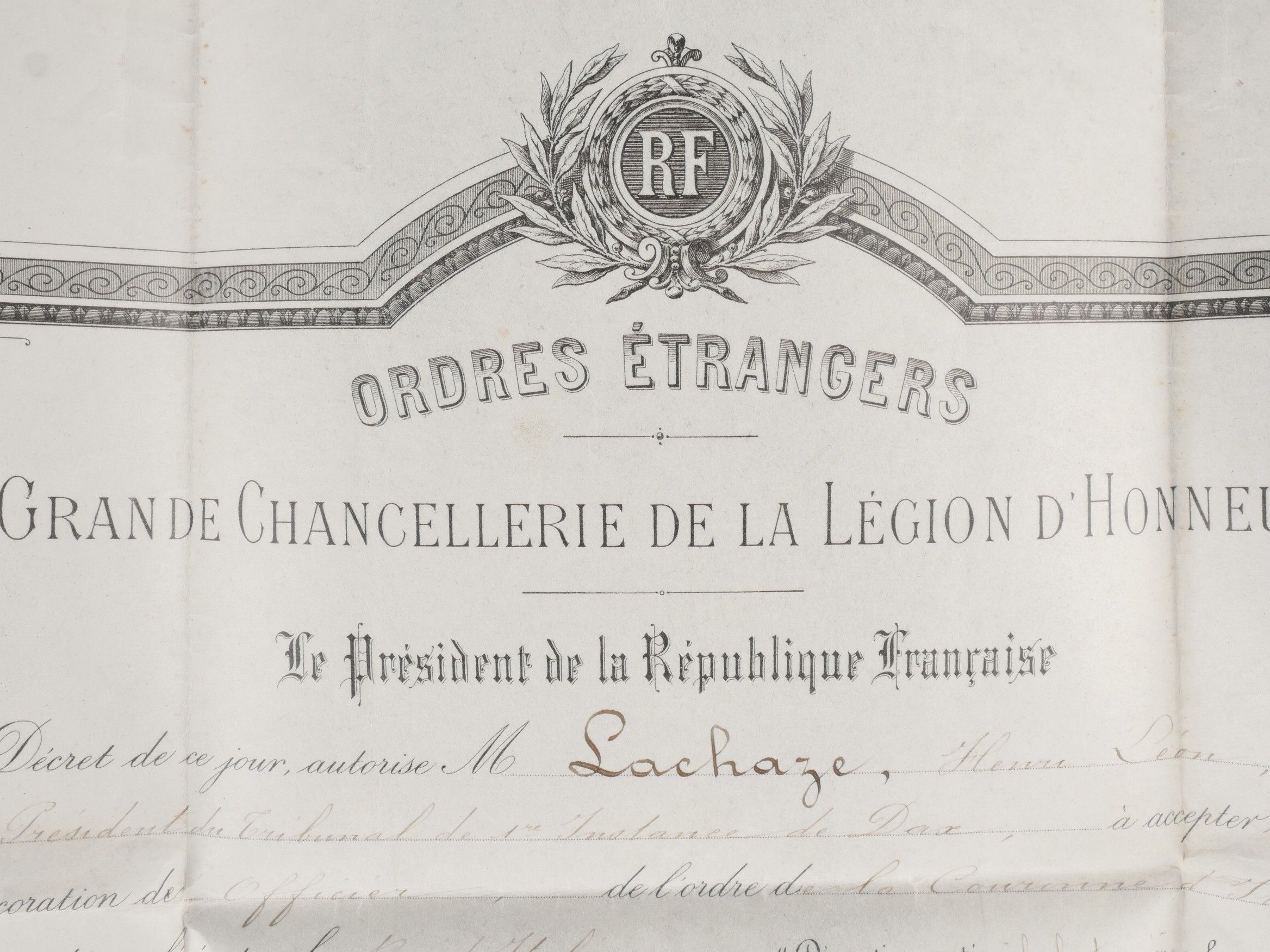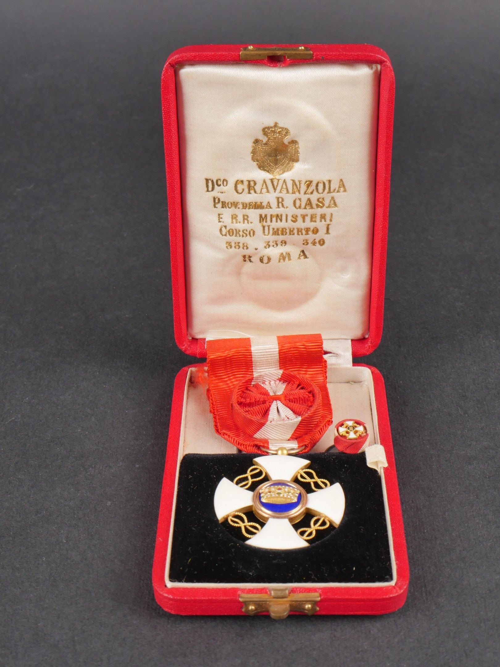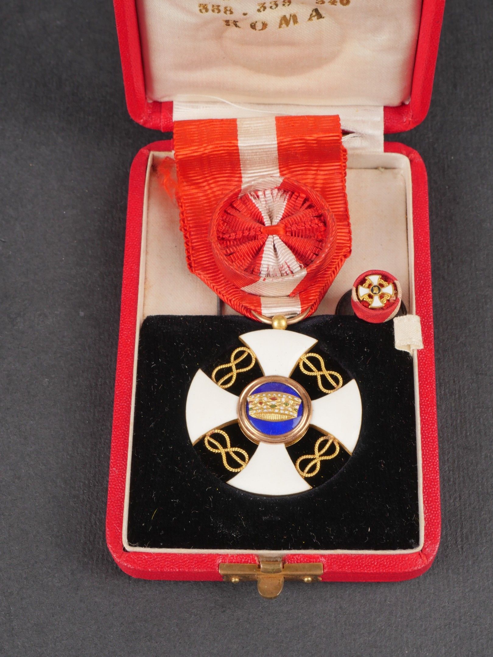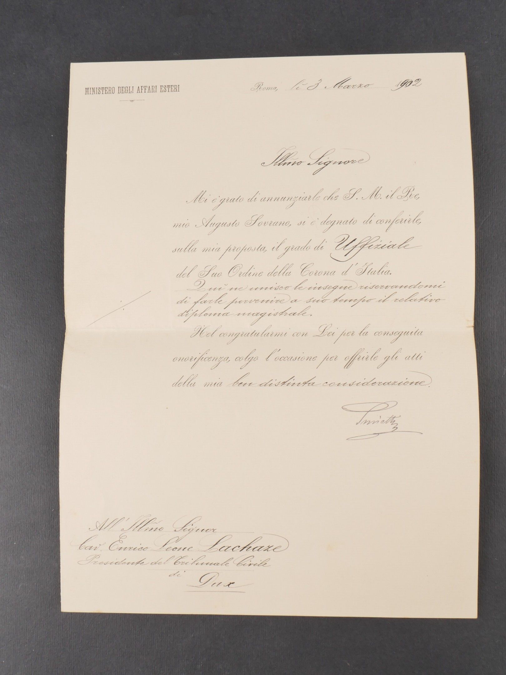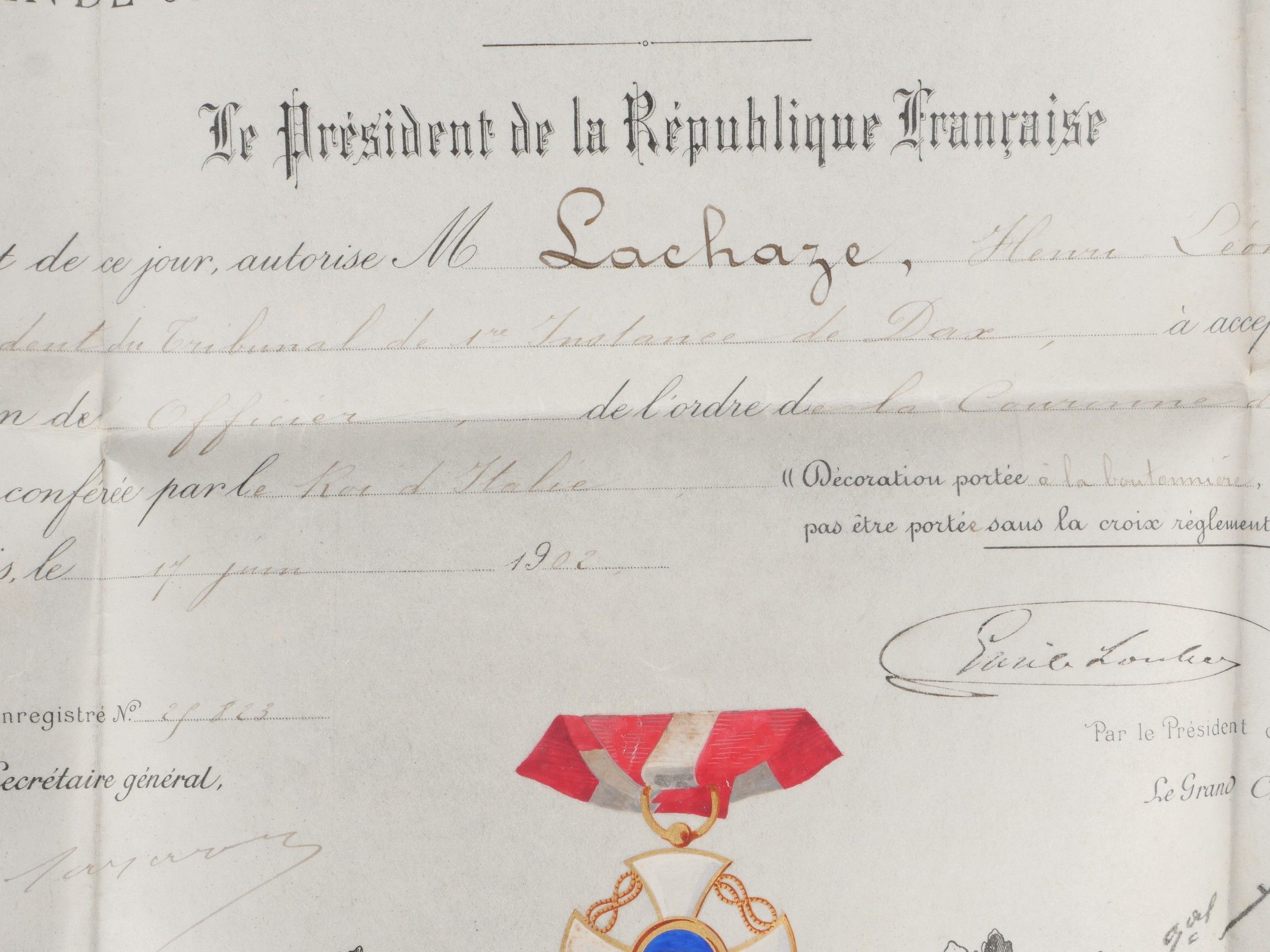 Officer's cross of the Crown of Italy with diplomas awarded to Léon Lachaze, French. The gold cross pattée is covered in white enamel. The arms of the cross are linked by four Savoy knot love lakes in braided gold wire. In the centre of the cross, on the obverse, is a gold medallion enamelled blue, featuring the crown of the King of the Lombards. The gold medallion on the reverse features a black-enamelled eagle with the enamelled Savoy cross in its mandorla, heraldic symbols taken from the great arms of the sovereigns of the House of Savoy. The ribbon is tierced with a white stripe between two red stripes, with a rosette. Miniature present. Beautiful complete box from the manufacturer DCO Cravanzola ROMA. Buttonhole and miniature of the same decoration also present. A handwritten letter from the Ministero degli affari esteri, dated 3 March 1902, awarding this decoration in the grade of officer to Enrico Leone Lachaze, President of the Civil Court of Dax. A handwritten letter from the Ministry of Justice, dated 1902, awarding him the insignia of the Crown of Italy. A parchment from the Grand Chancellery of the Legion of Honour authorising the wearing of this decoration. Some wear and patina. Condition II+. Officer's Cross of the Crown of Italy With accompanying diplomas awarded to Léon Lachaze, a French national. Rounded gilt cross pattée covered in white enamel. The arms of the cross are connected by four interlaced love knots Savoy knots in twisted gold wire. At the centre of the cross, on the obverse, a gilt and blue-enamel medallion depicting the crown of the Lombard kings, on the reverse, a gilt medallion showing a black-enamelled eagle bearing the Savoy cross, heraldic symbols of the House of Savoy. Ribbon composed of a white band between two red bands, with rosette. Miniature present. Fine, complete case by DCO Cravanzola, Rome. Buttonhole and miniature decorations of the same order also present. Includes a handwritten letter from the Ministero degli Affari Esteri dated March 3, 1902, granting the Officer grade to Enrico Leone Lachaze, President of the Civil Court of Dax, a handwritten letter from the Ministry of Justice 1902 transmitting the insignia, and a parchment from the Grand Chancellery of the Légion d'Honneur authorizing the wearing of the decoration. Some wear and patina noted. Condition II+.